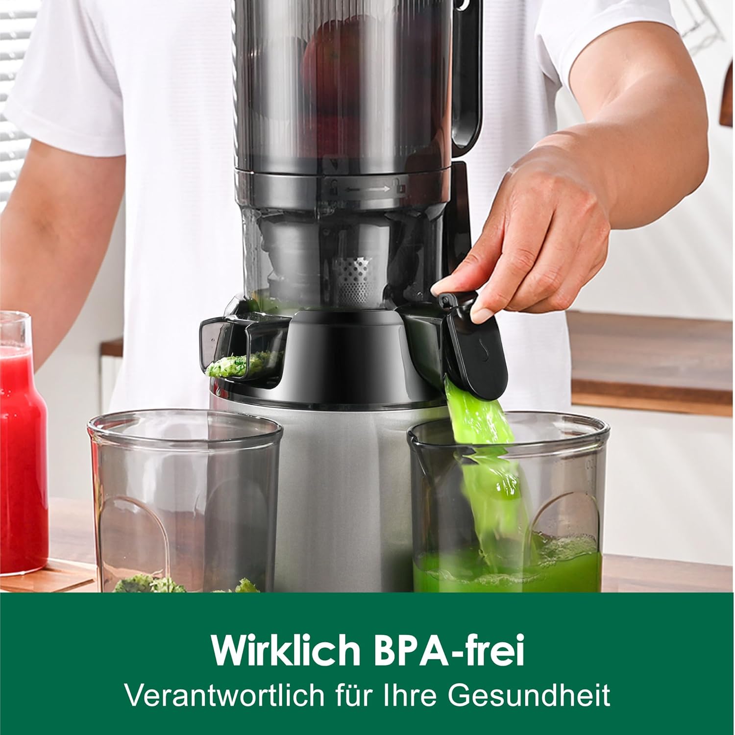[135 mm Einfüllöffnung & 1.8 L Großvolumen]: Der Fretta Entsafter für Gemüse und Obst verfügt über eine große Einfüllöffnung. Ganze Äpfel, Gurken, Karotten und anderes Obst/Gemüse können ohne Vorzuschneiden schnell verarbeitet werden. Dies beschleunigt den Entsaftungsprozess, vereinfacht die Handhabung und steigert die Effizienz im Alltag, perfekt für den Haushaltsbedarf. [BPA-FREI & Tritan-Material]: Der Fretta Slow Juicer besteht aus BPA-freiem Tritan-Material der Stufe 1 für Babynahrung, das die Sicherheit und Reinheit Ihres Saftes garantiert. Mit seiner hervorragenden Haltbarkeit wird der Fretta Entsafter Ihr langjähriger Begleiter. Er ist die ideale Wahl für alle, die einen gesunden Lebensstil pflegen. [Kaltpress-Technologie & 3-fach Filtersystem]: Fretta Kaltpress-Entsafter nutzt optimierte Kaltpress- und Slow Juicing Technologie. Kombiniert mit einem leistungsstarken Motor und einem 3-fach Filtersystem stellt er sicher, dass jeder Tropfen Saft aus Obst und Gemüse extrahiert wird. Er überwindet "Nahrungsbarrieren", bewahrt maximale Nährstoffe, reduziert die Oxidation und deckt Ihren täglichen Nährstoffbedarf. [Rückflussfunktion & Sicherheitsdesign]: Die Rückflussfunktion des Fretta Entsafters löst Verstopfungen mühelos. Bei Ansammlungen von Fruchtfleisch während des Entsaftens genügt ein Druck auf die Rücklauftaste, um die Drehrichtung automatisch umzukehren und die Blockade schnell zu beseitigen. Automatischer Stopp beim Öffnen des Deckels und ein integrierter Überhitzungsschutz verhindern Unfälle während der Nutzung. [Einfache Reinigung & Integriertes Design]: Der Fretta Gemüse Obstentsafter verfügt über ein integriertes, nahtloses Design. Kein Verspritzen von Saft, ein tropffreier Auslauf, schnelle Reinigung und Montage. Der rutschfeste Standfuß gewährleistet Stabilität während desBetriebs. Produktionsstufennachdienst: Erstklassiger Kundensupport und lebenslange technische Unterstützung werden garantiert HINWEIS:1.Bitte lassen Sie die Abdeckung des Einfüllschachts offen, wenn Sie den Fretta Entsafter slow juicer zusammenbauen. Aus Sicherheitsgründen kann der Entsafter nur dann eingeschaltet werden, wenn er vollständig zusammengebaut ist und ordnungsgemäß funktioniert.Bitte halten Sie sich strikt an die Installationsschritte in der Montageanleitung. 2.wenn Sie die Saftschale waschen, entfernen Sie bitte das Silikonventil aus dem Sockel, damit es leichter zu reinigen ist. | قیمت یورویی : 94.99€