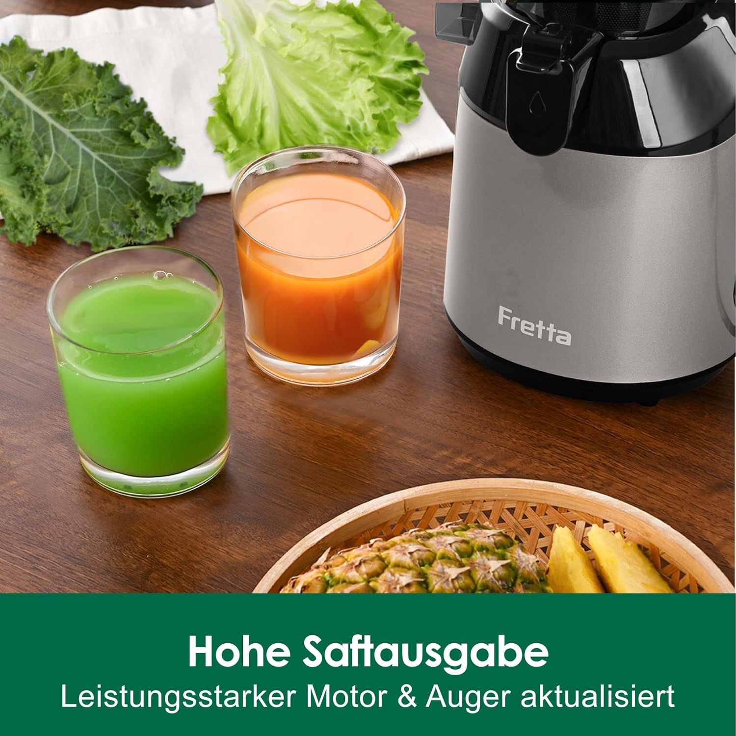 Fretta Entsafter Slow Juicer mit 135mm-1.8L XXL Öffnung,Entsafter Gemüse und Obst,250W MAX Mastizier- für Ganze Früchte,Einfache Reinigung BPA-frei | Tritan Material (Grau) | قیمت یورویی 94.99€