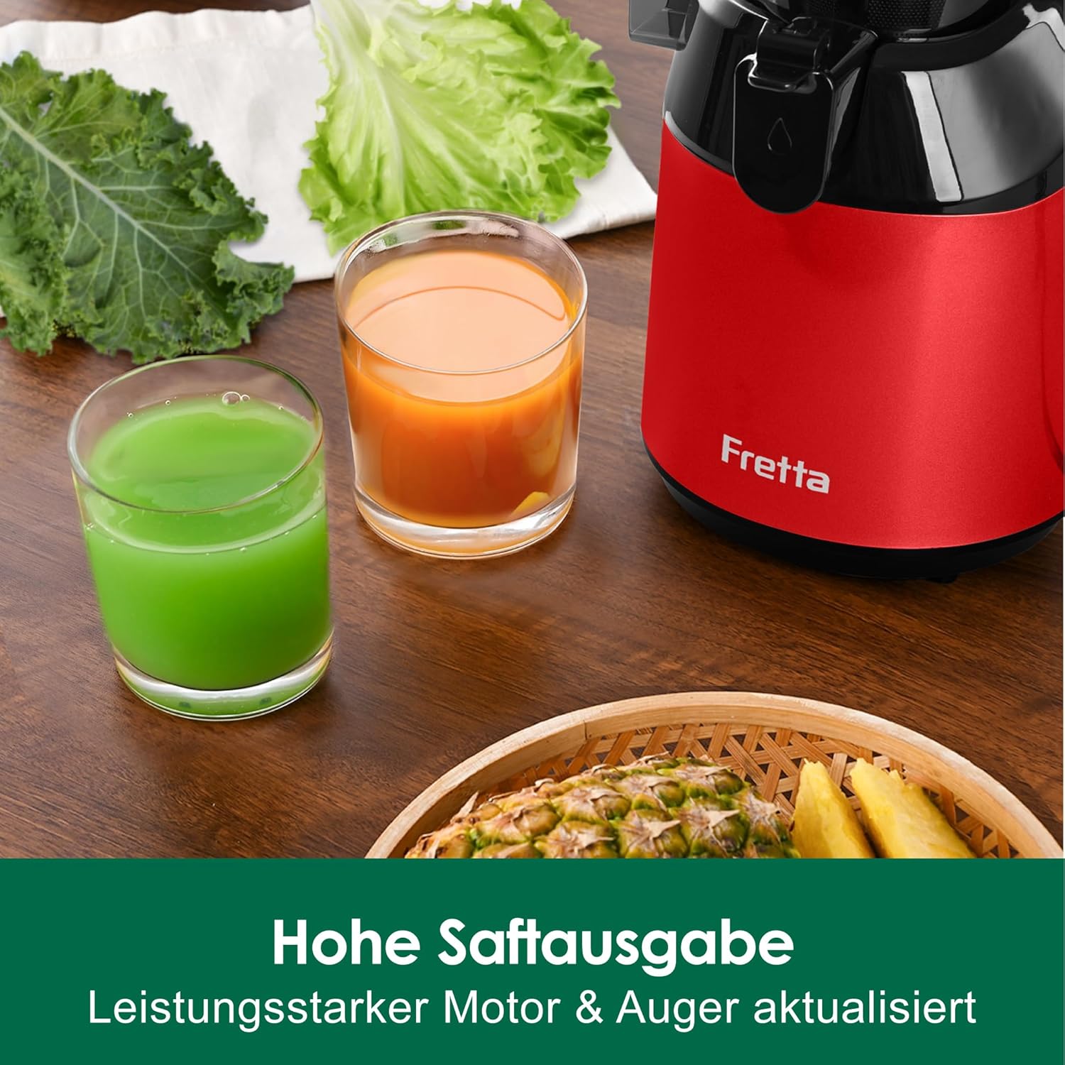 Fretta Entsafter Slow Juicer mit 135mm-1.8L XXL Öffnung,Entsafter Gemüse und Obst,250W MAX Mastizier für Ganze Früchte,Einfache Reinigung BPA-frei | Tritan Material (Rot) | قیمت یورویی 94.99€