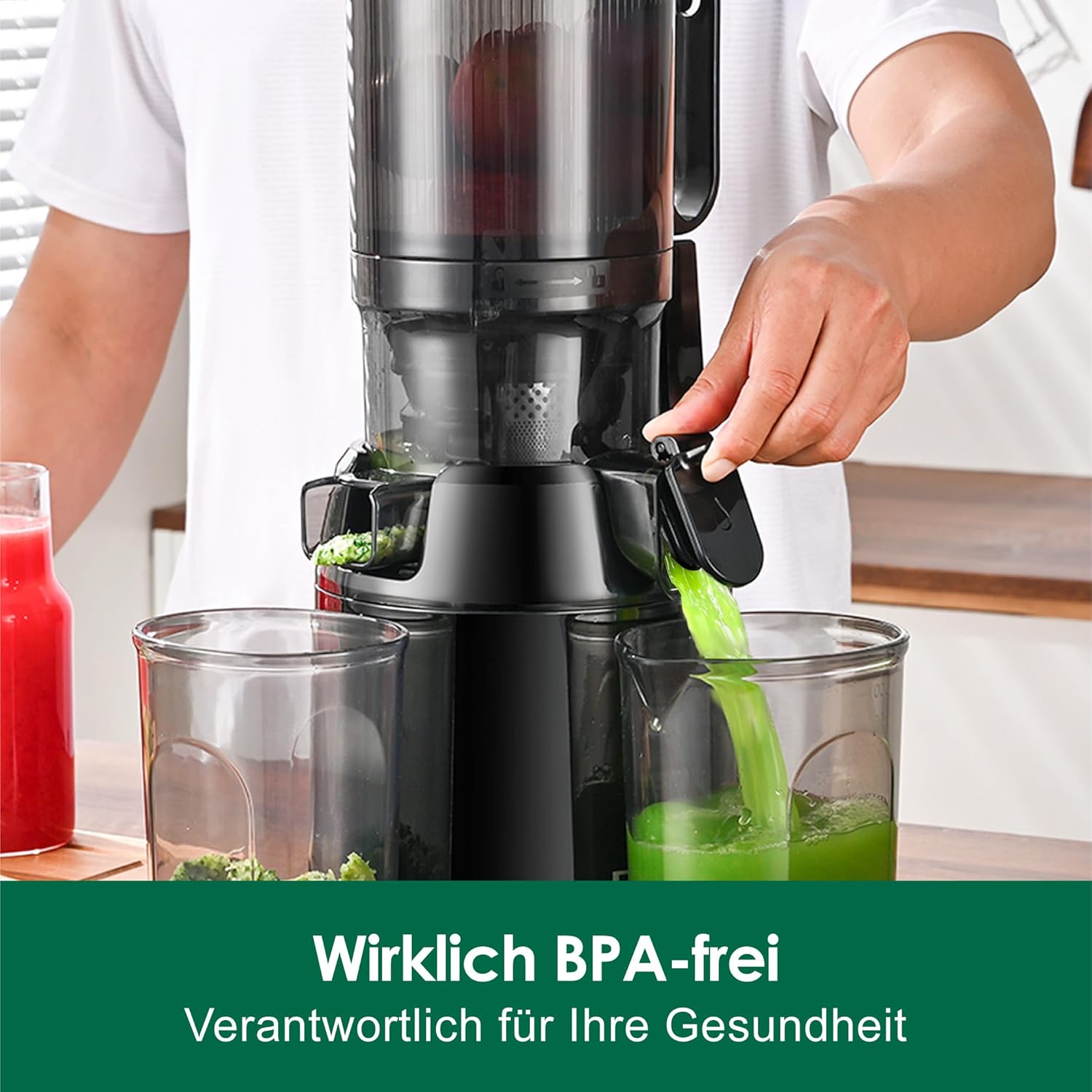 [BPA-FREI & Tritan-Material]: Der Fretta Slow Juicer besteht aus BPA-freiem Tritan-Material der Stufe 1 für Babynahrung, das die Sicherheit und Reinheit Ihres Saftes garantiert. Mit seiner hervorragenden Haltbarkeit wird der Fretta Entsafter Ihr langjähriger Begleiter. Er ist die ideale Wahl für alle, die einen gesunden Lebensstil pflegen. [135 mm Einfüllöffnung & 1.8 L Großvolumen]: Der Fretta Entsafter für Gemüse und Obst verfügt über eine große Einfüllöffnung. Ganze Äpfel, Gurken, Karotten und anderes Obst/Gemüse können ohne Vorzuschneiden schnell verarbeitet werden. Dies beschleunigt den Entsaftungsprozess, vereinfacht die Handhabung und steigert die Effizienz im Alltag, perfekt für den Haushaltsbedarf. [Kaltpress-Technologie & 3-fach Filtersystem]: Fretta Kaltpress-Entsafter nutzt optimierte Kaltpress- und Slow Juicing Technologie. Kombiniert mit einem leistungsstarken Motor und einem 3-fach Filtersystem stellt er sicher, dass jeder Tropfen Saft aus Obst und Gemüse extrahiert wird. Er überwindet "Nahrungsbarrieren", bewahrt maximale Nährstoffe, reduziert die Oxidation und deckt Ihren täglichen Nährstoffbedarf. [Rückflussfunktion & Sicherheitsdesign]: Die Rückflussfunktion des Fretta Entsafters löst Verstopfungen mühelos. Bei Ansammlungen von Fruchtfleisch während des Entsaftens genügt ein Druck auf die Rücklauftaste, um die Drehrichtung automatisch umzukehren und die Blockade schnell zu beseitigen. Automatischer Stopp beim Öffnen des Deckels und ein integrierter Überhitzungsschutz verhindern Unfälle während der Nutzung. [Einfache Reinigung & Integriertes Design]: Der Fretta Gemüse- und Obstentsafter verfügt über ein integriertes, nahtloses Design. Kein Verspritzen von Saft, ein tropffreier Auslauf, schnelle Reinigung und Montage. Der rutschfeste Standfuß gewährleistet Stabilität während desBetriebs. Produktionsstufennachdienst: Erstklassiger Kundensupport und lebenslange technische Unterstützung werden garantiert. HINWEIS:1.Bitte lassen Sie die Abdeckung des Einfüllschachts offen, wenn Sie den Fretta Entsafter slow juicer zusammenbauen. Aus Sicherheitsgründen kann der Entsafter nur dann eingeschaltet werden, wenn er vollständig zusammengebaut ist und ordnungsgemäß funktioniert.Bitte halten Sie sich strikt an die Installationsschritte in der Montageanleitung. 2.wenn Sie die Saftschale waschen, entfernen Sie bitte das Silikonventil aus dem Sockel, damit es leichter zu reinigen ist. | قیمت یورویی : 94.99€