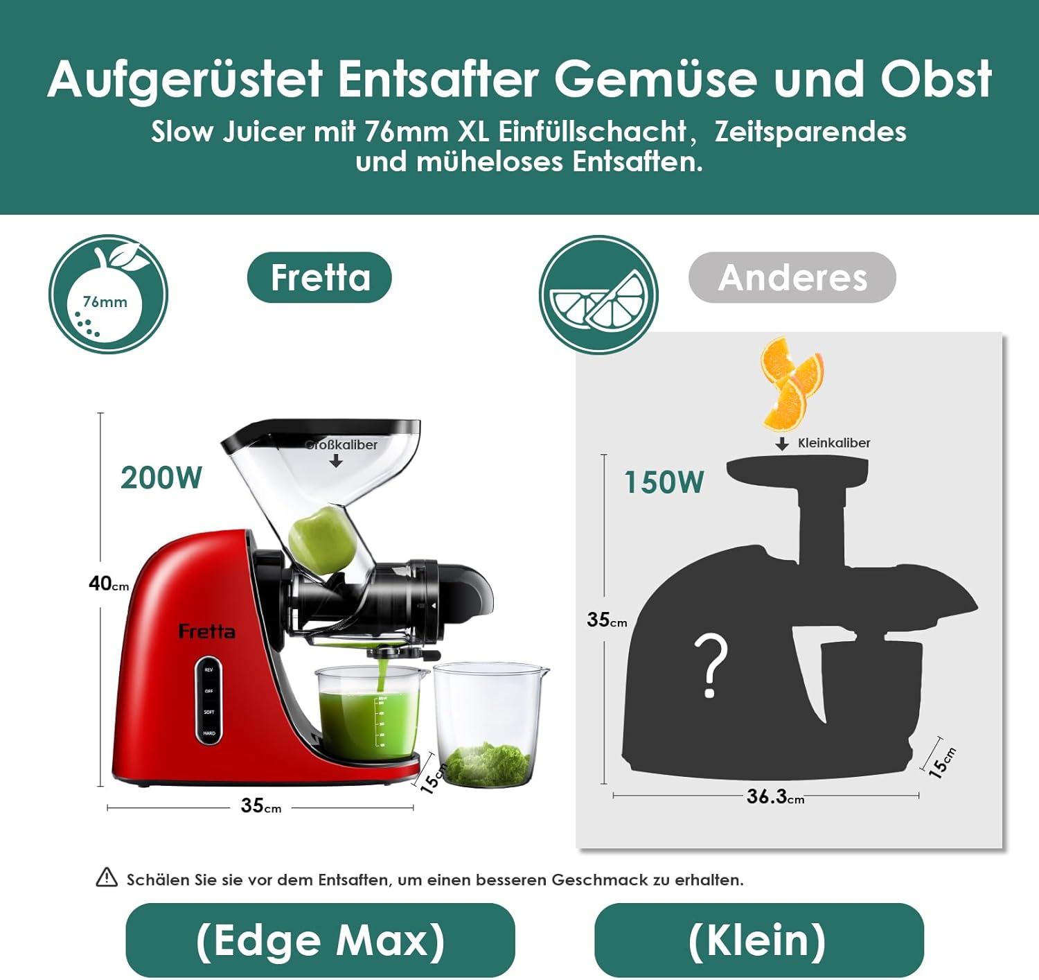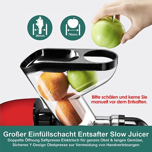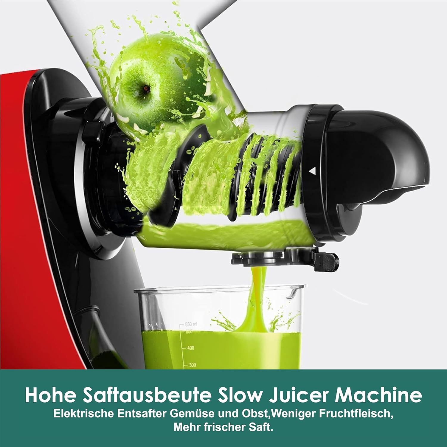 Fretta Slow Juicer Entsafter Gemüse und Obst Gemüse Testsieger, 76mm Öffnung Obstpresse Elektrisch Saftpresse Äpfel Sellerie Juicer Machine Masticating Gemüsepresse BPA-Frei, Einfache Reinigung, Rot | قیمت یورویی 89.99€