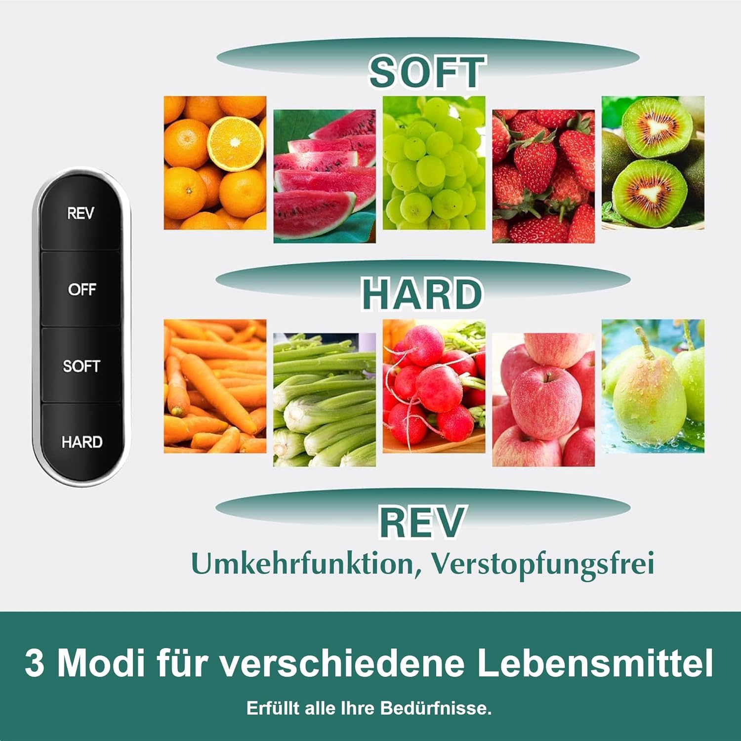【Extrabreiter Einfüllschacht Saftmaschine】Fretta Horizontaler Slow Juicer Entsafter Gemüse und Obst Testsieger mit Bürste und 2 Tassen ist mit einem 76MM Großer Einfüllschacht ausgestattet, der es einfach macht, große Obst- und Gemüsestücke zu entsaften, ohne mühsames Schneiden und so sparen Sie Ihre Zeit. Tipps: Für einen besseren Geschmack ist es ratsam, die Schale vor dem Entsaften zu entfernen. 【BPA Freie für die Gesundhei der Familie】Wir bei Fretta legen großen Wert auf Ihr Wohlbefinden. Deshalb sind unsere Gemüse Entsafter Schnecke aus Tritan und dauerhaft 304 Edelstahl Material hergestellt, das eine BPA-freie Entsafterfahrung garantiert, die sicher ist und schützen Sie und Ihre Familie vor den möglichen Gefahren minderwertiger Materialien. So Horizontale Slowjuicer Entsafter Fruchtpresse Elektrische Saftpresse Testsieger ist ideal für Allergiker. 【Ultrahohe Saftausbeute & reduzierter Abfall】Fortschrittliche Low-Speed-Kaltpressen-Technologie ermöglicht es den Juicer Machine, die maximale Menge an Saft aus Obst und Gemüse zu extrahieren. Bei einer sanften Drehzahl von 80 U/min wird das Obst und Gemüse effizient ausgepresst, wodurch die Schaumbildung minimiert und Verstopfungen verhindert werden, was letztendlich die Saftausbeute maximiert. Verabschieden Sie sich von der Verschwendung und holen Sie das Beste aus Ihren Zutaten heraus! 【Erhöhter Nährwert & köstlicher Geschmack】Kaltpresse Entsafter nutzt die Kaltpress-Technologie mit niedriger Geschwindigkeit, um den Saft schonend zu extrahieren und gleichzeitig wichtige Nährstoffe zu erhalten. Im Gegensatz zu Hochgeschwindigkeits-Zerkleinerungs- und Schleudertechniken minimiert dieser Prozess die Oxidation und verlängert die Frische Ihres Saftes. Genießen Sie jeden einzelnen Schluck, den verbesserten Nährwert und den exquisiten Geschmack Ihres frisch gepressten Saftes! 【Leistungsstarker aber leiser Motor】Fretta Profi Slow Juicer Testsieger Karotten Sellerie Juice Maker Maschine werden von einem robusten 200 W Gleichstrommotor angetrieben. Das Design mit hohem Drehmoment und niedriger Drehzahl arbeitet leise und extrahiert die Nährstoffe aus Ihren Lieblingsfrüchten und -gemüsen. Diese Obstpresse Elektrisch Orangenpresse läuft unter 70DB, so dass er Ihre Nachbarn und Familie nicht stört. 【Sicheres Y-förmiges Design】Der Einfüllschacht der Gute Qualität Selleriesaft Entsafter Obst und Gemüse Saft Maschine verfügt über ein sicheres Y-förmiges Design, das speziell entwickelt wurde, um ein versehentliches Einführen mit der Hand zu verhindern und das Risiko von möglichen Handverletzungen zu minimieren. Fretta Juicer Entsafter Elektrisch als Fruchtsaftpresse, Gemüsesaftpresse und Nussmilch Maschine. 【Doppelte Zuführungsrutsche für mehr Effizienz】Fretta Ingwer Saftpresse Elektrisch Zitruspresse Apfelpresse ist mit einem praktischen doppelten Einfüllschacht ausgestattet. So können Sie mehrere Zutaten gleichzeitig einfüllen, was Ihnen Zeit und Mühe beim Entsaften spart. Darüber hinaus ist der Schieber so konzipiert, dass er eine kontinuierliche Zufuhr ermöglicht, ohne dass er entfernt werden muss, was den Entsaftungsprozess weiter vereinfacht. 【Einfache Montage & Reinigung】Schwarz Presse Obstpresse Elektrische Apfelsaftpresse Fruchtentsafter ist für eine mühelose Verwendung konzipiert. Mit nur einem einzigen Knopfdruck lässt sich der Entsafterkörper leicht abnehmen und unter fließendem Wasser reinigen. Zu Ihrer Bequemlichkeit haben wir auch eine spezielle Bürste beigefügt, mit der Sie mühelos alle kleinen Trester aus dem Entsaftersieb entfernen können. 【2 Modi & Rückwärtsfunktion】Cold Press Juicer Extractor Squeezer bietet 2 Geschwindigkeits Modi und eine praktische Rücklauffunktion. "Soft-Modus" (85-100 U/min) zum Entsaften von Orangen, Wassermelonen, Trauben, Beeren und weichen Früchten."Hard-Modus" (95-110 U/min) für Äpfel, Birnen, Karotten, Rüben, Sellerie, Ingwer, Grünkohl und härtere Zutaten. Die umkehrfunktion verhindert effektiv Verstopfungen während des Entsaftungsvorgangs und sicher kontinuierliches und ununterbrochenes Entsaften. 【Nährstoffhaltiger Säfte & Mehr Kulinarik】Grünes Presse Entsafter Elektrisch für Gemüse und Obst ist mit einem Edelstahlfilter mit einem feinen und dichten Netz ausgestattet, das den Saft angemessen vom Trester trennt und reine Farbe, natürlichen Geschmack, Nährstoffe & Vitamine behält. Jeder Schluck, den Sie nehmen, ist ein reiner, köstlicher Saft. Mehr als Saft, die Verschwendung von Gemüse und Obst vermeiden, können Sie Viele Leckereien wie z.B. kuchen, Kekse, Muffins, Pizza, Suppe. | قیمت یورویی : 89.99€