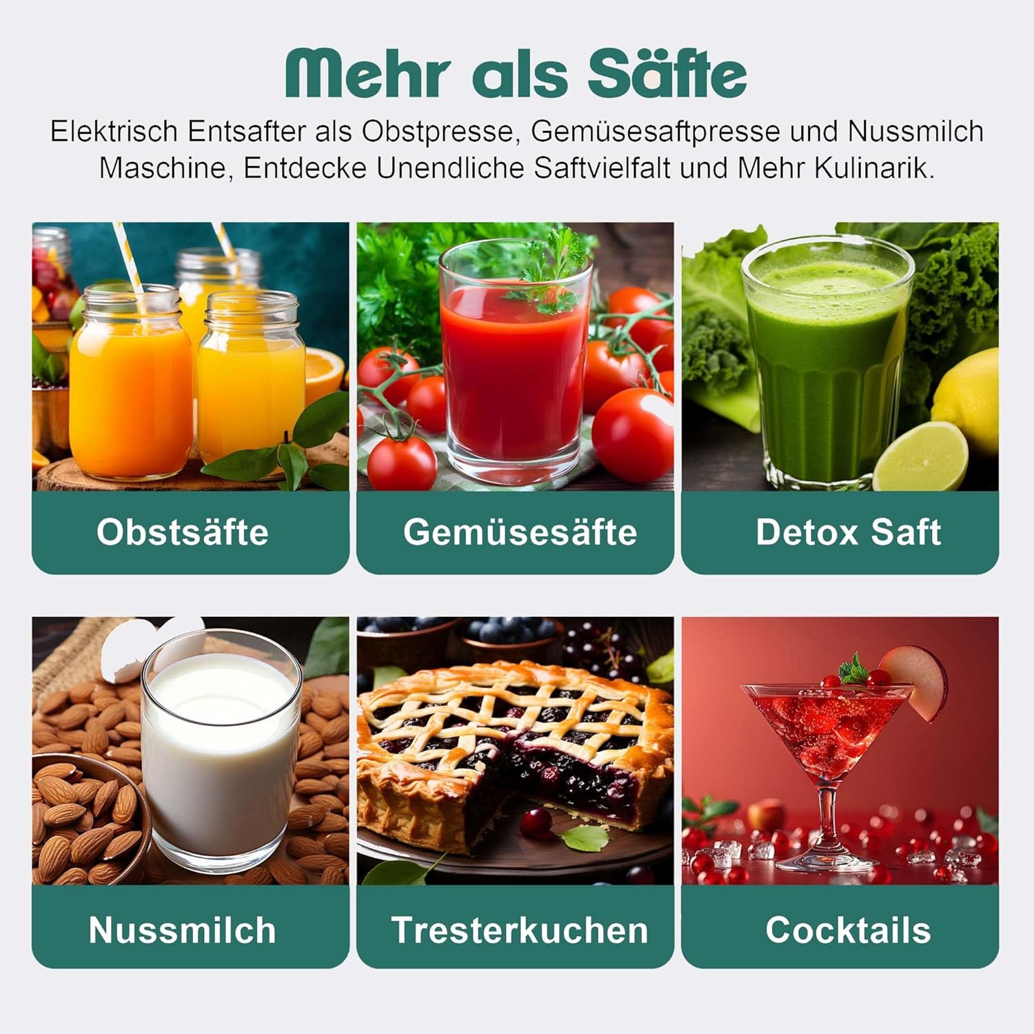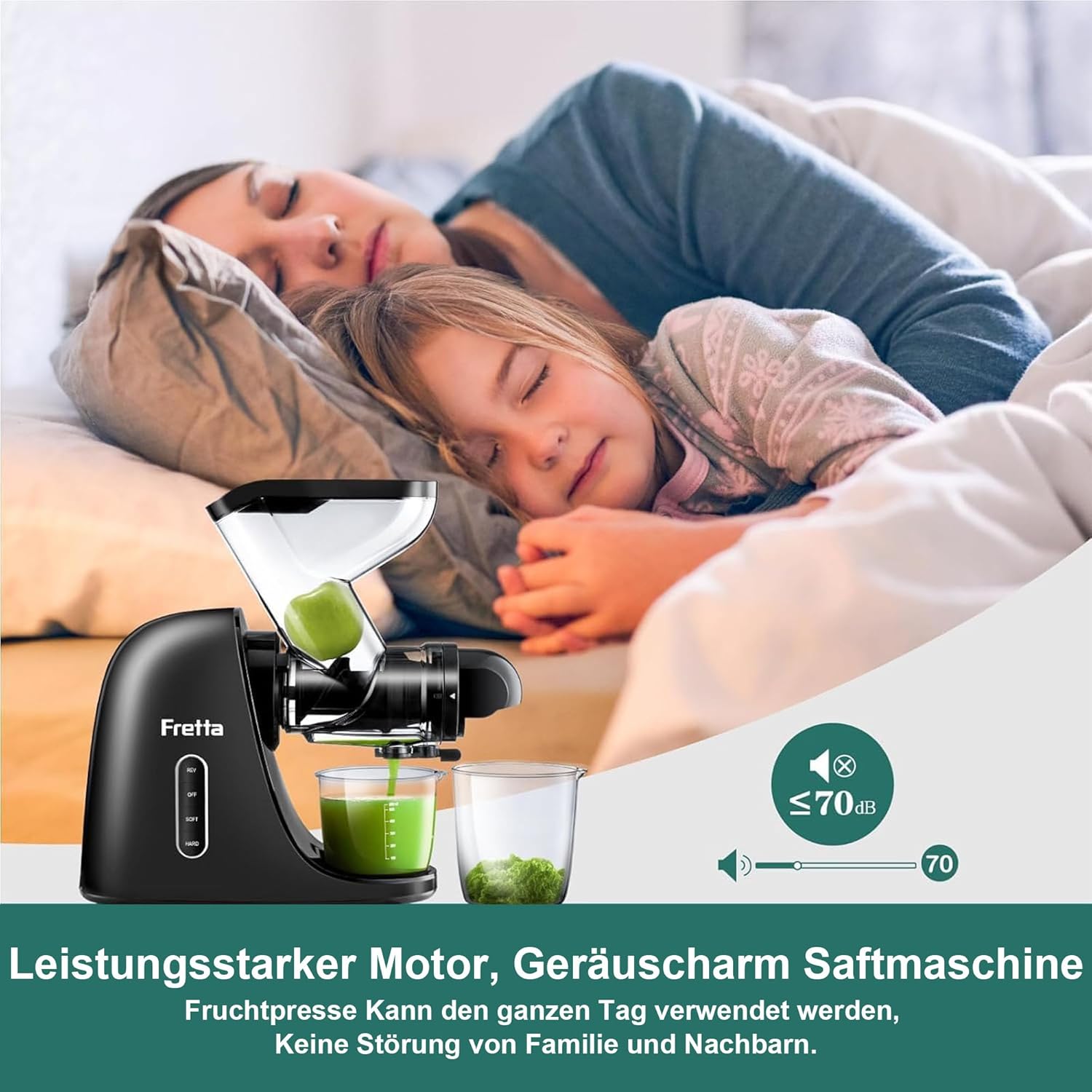 【Extrabreiter Einfüllschacht Saftmaschine】Fretta Horizontaler Slow Juicer Entsafter Gemüse und Obst Testsieger mit Bürste und 2 Tassen ist mit einem 76MM Großer Einfüllschacht ausgestattet, der es einfach macht, große Obst- und Gemüsestücke zu entsaften, ohne mühsames Schneiden und so sparen Sie Ihre Zeit. Tipps: Für einen besseren Geschmack ist es ratsam, die Schale vor dem Entsaften zu entfernen. 【BPA Freie für die Gesundhei der Familie】Wir bei Fretta legen großen Wert auf Ihr Wohlbefinden. Deshalb sind unsere Gemüse Entsafter Schnecke aus Tritan und dauerhaft 304 Edelstahl Material hergestellt, das eine BPA-freie Entsafterfahrung garantiert, die sicher ist und schützen Sie und Ihre Familie vor den möglichen Gefahren minderwertiger Materialien. So Horizontale Slowjuicer Entsafter Fruchtpresse Elektrische Saftpresse Testsieger ist ideal für Allergiker. 【Ultrahohe Saftausbeute & reduzierter Abfall】Fortschrittliche Low-Speed-Kaltpressen-Technologie ermöglicht es den Juicer Machine, die maximale Menge an Saft aus Obst und Gemüse zu extrahieren. Bei einer sanften Drehzahl von 80 U/min wird das Obst und Gemüse effizient ausgepresst, wodurch die Schaumbildung minimiert und Verstopfungen verhindert werden, was letztendlich die Saftausbeute maximiert. Verabschieden Sie sich von der Verschwendung und holen Sie das Beste aus Ihren Zutaten heraus! 【Erhöhter Nährwert & köstlicher Geschmack】Kaltpresse Entsafter nutzt die Kaltpress-Technologie mit niedriger Geschwindigkeit, um den Saft schonend zu extrahieren und gleichzeitig wichtige Nährstoffe zu erhalten. Im Gegensatz zu Hochgeschwindigkeits-Zerkleinerungs- und Schleudertechniken minimiert dieser Prozess die Oxidation und verlängert die Frische Ihres Saftes. Genießen Sie jeden einzelnen Schluck, den verbesserten Nährwert und den exquisiten Geschmack Ihres frisch gepressten Saftes! 【Leistungsstarker aber leiser Motor】Fretta Profi Slow Juicer Testsieger Karotten Sellerie Juice Maker Maschine werden von einem robusten 200 W Gleichstrommotor angetrieben. Das Design mit hohem Drehmoment und niedriger Drehzahl arbeitet leise und extrahiert die Nährstoffe aus Ihren Lieblingsfrüchten und -gemüsen. Diese Obstpresse Elektrisch Orangenpresse läuft unter 70DB, so dass er Ihre Nachbarn und Familie nicht stört. 【Sicheres Y-förmiges Design】Der Einfüllschacht der Gute Qualität Selleriesaft Entsafter Obst und Gemüse Saft Maschine verfügt über ein sicheres Y-förmiges Design, das speziell entwickelt wurde, um ein versehentliches Einführen mit der Hand zu verhindern und das Risiko von möglichen Handverletzungen zu minimieren. Fretta Juicer Entsafter Elektrisch als Fruchtsaftpresse, Gemüsesaftpresse und Nussmilch Maschine. 【Doppelte Zuführungsrutsche für mehr Effizienz】Fretta Ingwer Saftpresse Elektrisch Zitruspresse Apfelpresse ist mit einem praktischen doppelten Einfüllschacht ausgestattet. So können Sie mehrere Zutaten gleichzeitig einfüllen, was Ihnen Zeit und Mühe beim Entsaften spart. Darüber hinaus ist der Schieber so konzipiert, dass er eine kontinuierliche Zufuhr ermöglicht, ohne dass er entfernt werden muss, was den Entsaftungsprozess weiter vereinfacht. 【Einfache Montage & Reinigung】Schwarz Presse Obstpresse Elektrische Apfelsaftpresse Fruchtentsafter ist für eine mühelose Verwendung konzipiert. Mit nur einem einzigen Knopfdruck lässt sich der Entsafterkörper leicht abnehmen und unter fließendem Wasser reinigen. Zu Ihrer Bequemlichkeit haben wir auch eine spezielle Bürste beigefügt, mit der Sie mühelos alle kleinen Trester aus dem Entsaftersieb entfernen können. 【2 Modi & Rückwärtsfunktion】Cold Press Juicer Extractor Squeezer bietet 2 Geschwindigkeits Modi und eine praktische Rücklauffunktion. "Soft-Modus" (85-100 U/min) zum Entsaften von Orangen, Wassermelonen, Trauben, Beeren und weichen Früchten."Hard-Modus" (95-110 U/min) für Äpfel, Birnen, Karotten, Rüben, Sellerie, Ingwer, Grünkohl und härtere Zutaten. Die umkehrfunktion verhindert effektiv Verstopfungen während des Entsaftungsvorgangs und sicher kontinuierliches und ununterbrochenes Entsaften. 【Nährstoffhaltiger Säfte & Mehr Kulinarik】Grünes Presse Entsafter Elektrisch für Gemüse und Obst ist mit einem Edelstahlfilter mit einem feinen und dichten Netz ausgestattet, das den Saft angemessen vom Trester trennt und reine Farbe, natürlichen Geschmack, Nährstoffe & Vitamine behält. Jeder Schluck, den Sie nehmen, ist ein reiner, köstlicher Saft. Mehr als Saft, die Verschwendung von Gemüse und Obst vermeiden, können Sie Viele Leckereien wie z.B. kuchen, Kekse, Muffins, Pizza, Suppe. | قیمت یورویی : 79.99€