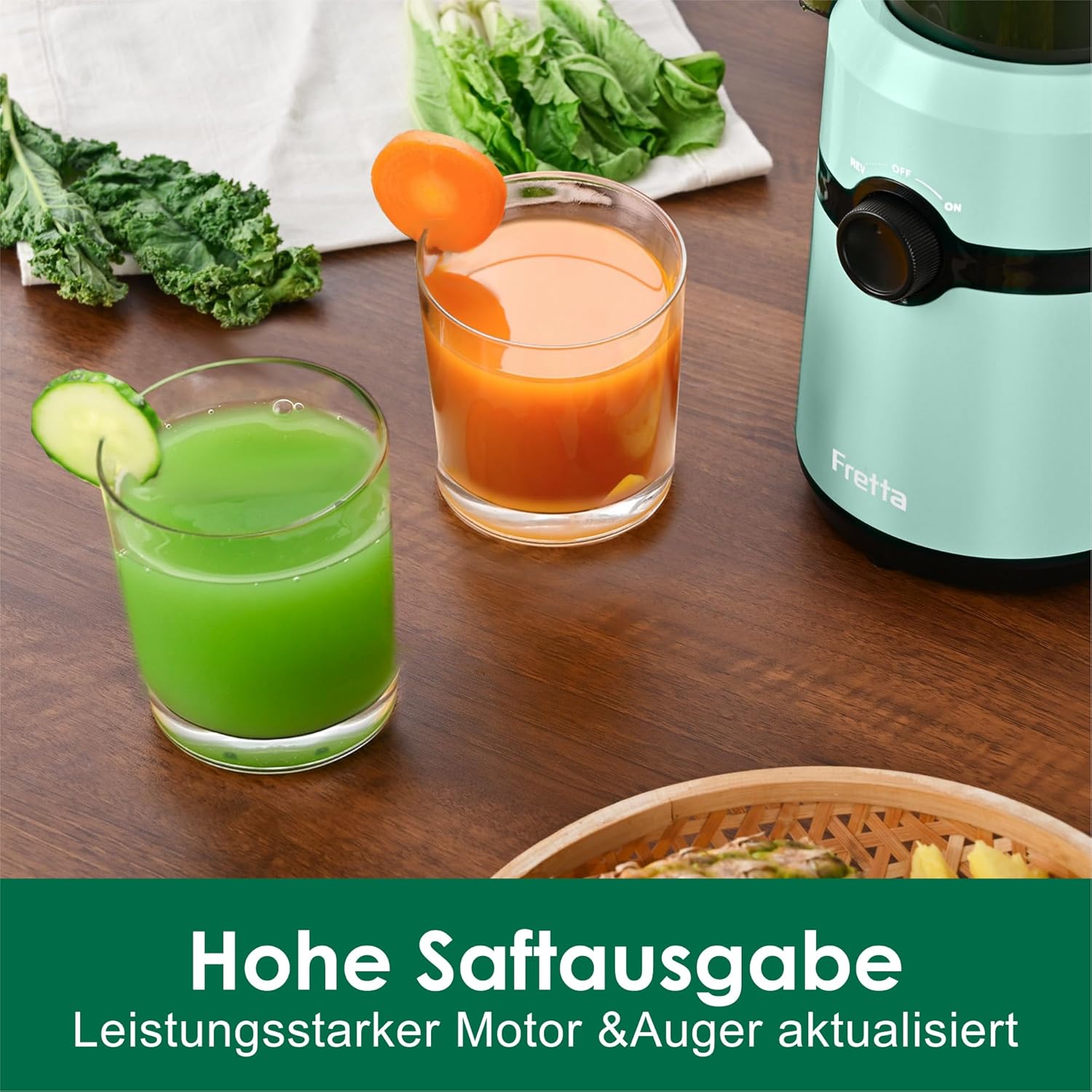 108-mm-Einfüllöffnung und 1L Fassungsvermögen: Fretta Entsafter verarbeitet ganze Früchte und Gemüse ohne Vorschneiden – der Slow Juicer maximiert Ballaststoffe aus Obst und Gemüse Dreifach-Filtersystem für maximale Nährstoffe: Innovative Kaltpresstechnologie mit verbesserter Schnecke sorgt für hohe Saftausbeute, reduziert Oxidation und Schaum, ohne Nährstoffe zu beeinträchtigen . Rücklauffunktion und sicheres Design: Fretta Entsafter mit Rücklauffunktion löst Verstopfungen per Knopfdruck, mit Sicherheitsverriegelung und Überhitzungsschutz zur Vermeidung von Unfällen. Blitzschnelle Reinigung mit Anti-Tropf-Design: Integriertes Design mit tropffreiem Auslass und nahtloser Konstruktion, einfache Demontage für schnelle, stressfreie Reinigung, rutschfester Boden für Stabilität 100% BPA-frei aus Tritan-Material: Garantiert reinen, gesunden Saft ohne Chemikalien, mit werkseitigem Kundendienst, 1 Jahr Garantie und lebenslangem technischen Support Hinweis:1.Bitte lassen Sie die Abdeckung des Einfüllschachts offen, wenn Sie den Entsafter slow juicer zusammenbauen. Aus Sicherheitsgründen kann der Entsafter nur dann eingeschaltet werden, wenn er vollständig zusammengebaut ist und ordnungsgemäß funktioniert.Bitte halten Sie sich strikt an die Installationsschritte in der Montageanleitung. 2.wenn Sie die Saftschale waschen, entfernen Sie bitte das Silikonventil aus dem Sockel, damit es leichter zu reinigen ist. | قیمت یورویی : 89.99€