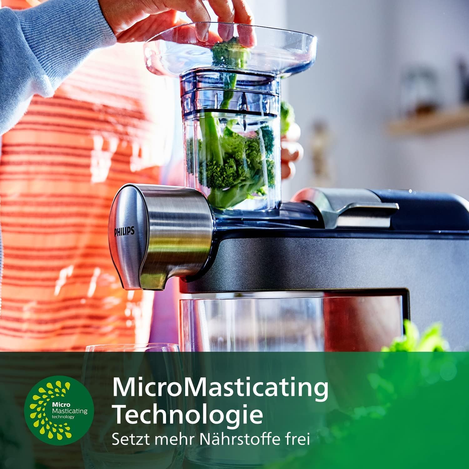 Philips Saftpresse – 200W, 1L, HomeID-Rezepte-App, große Einfüllöffnung, Quick Clean (HR1949/20), Vollmetall