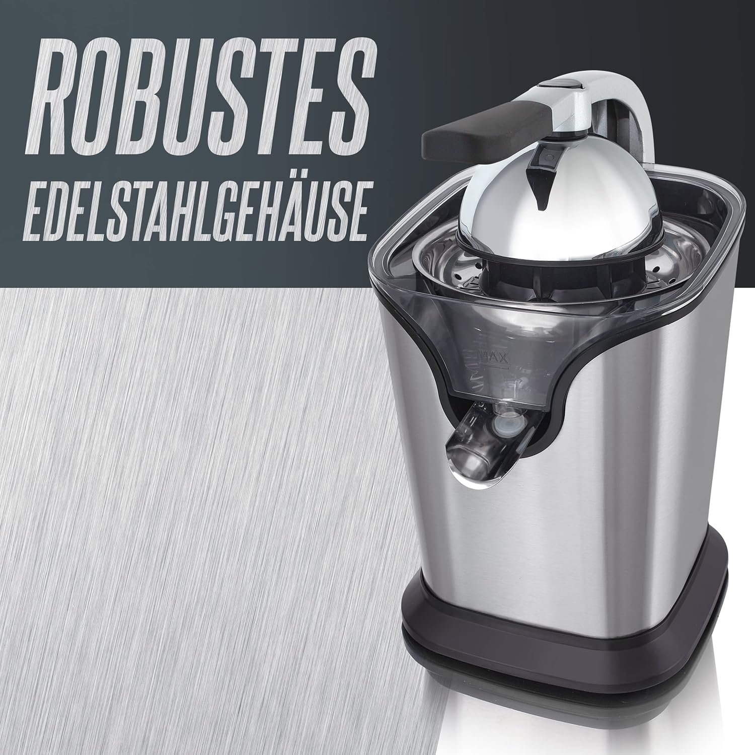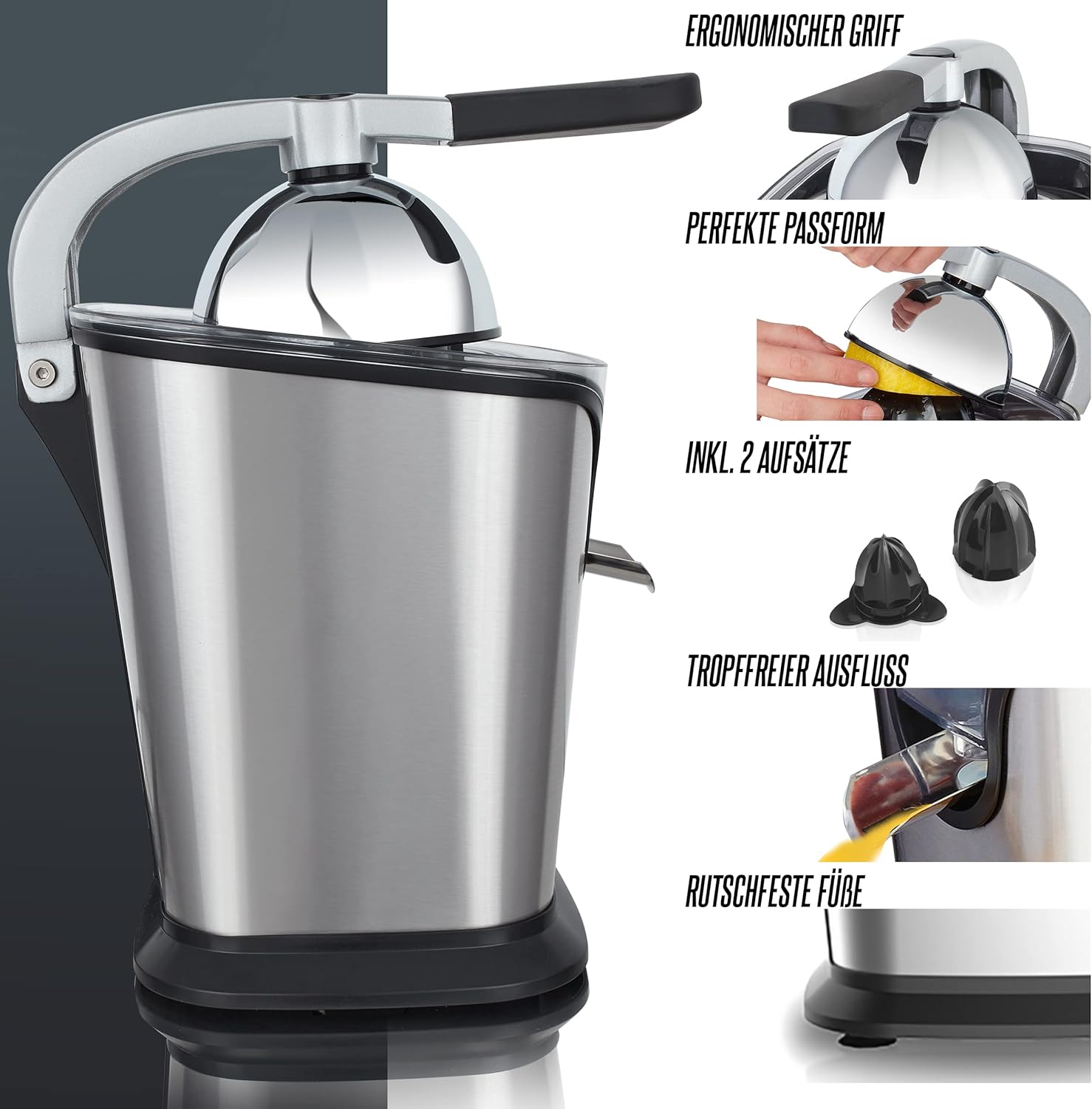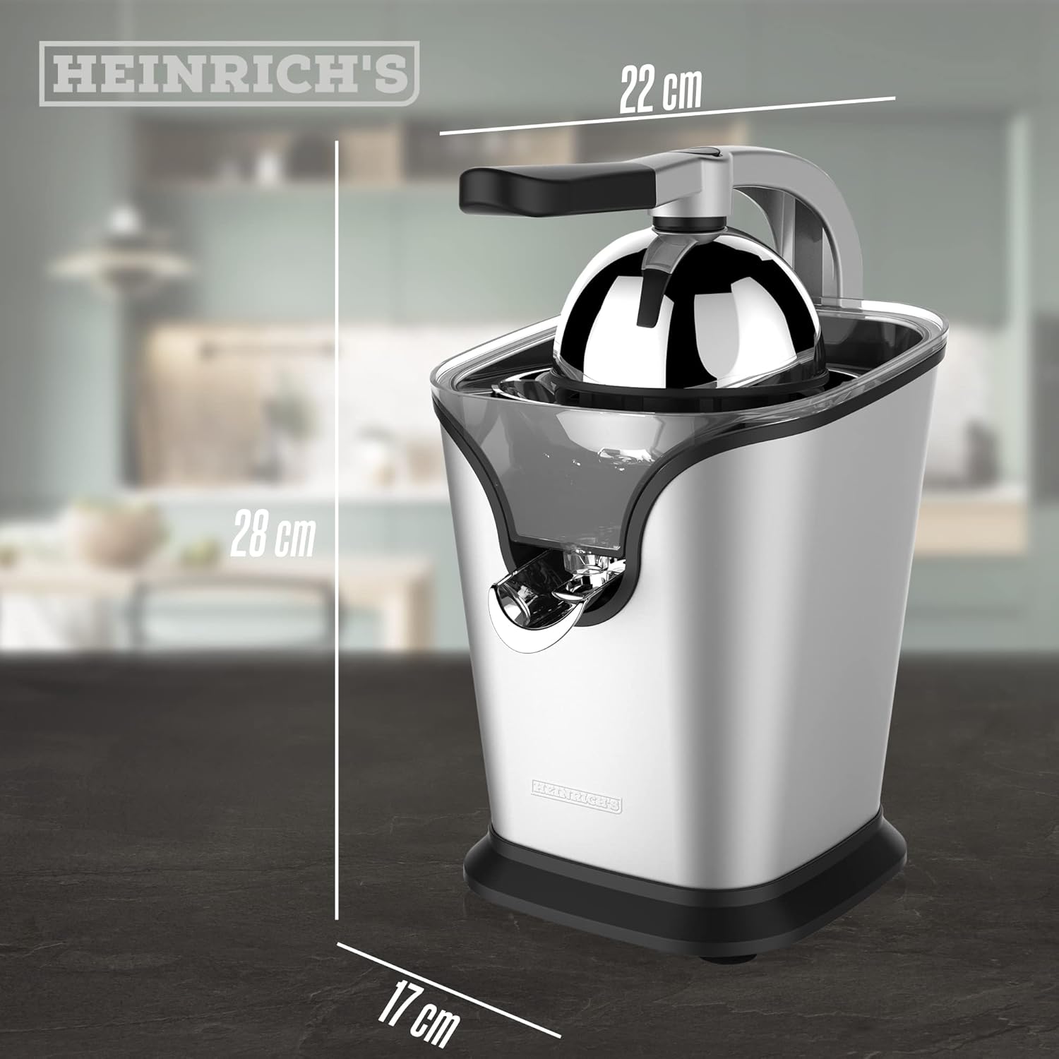 HEINRICHS elektrische Edelstahl Zitruspresse Juicer inkl. Fließstopfunktion professioneller Hebelarm rostfrei Universalaufsatz für Zitrusfrüchte Granatapfelpresse Saftpresse 100Watt, Heinrich´s Steel/Chrome | قیمت یورویی 63.9€