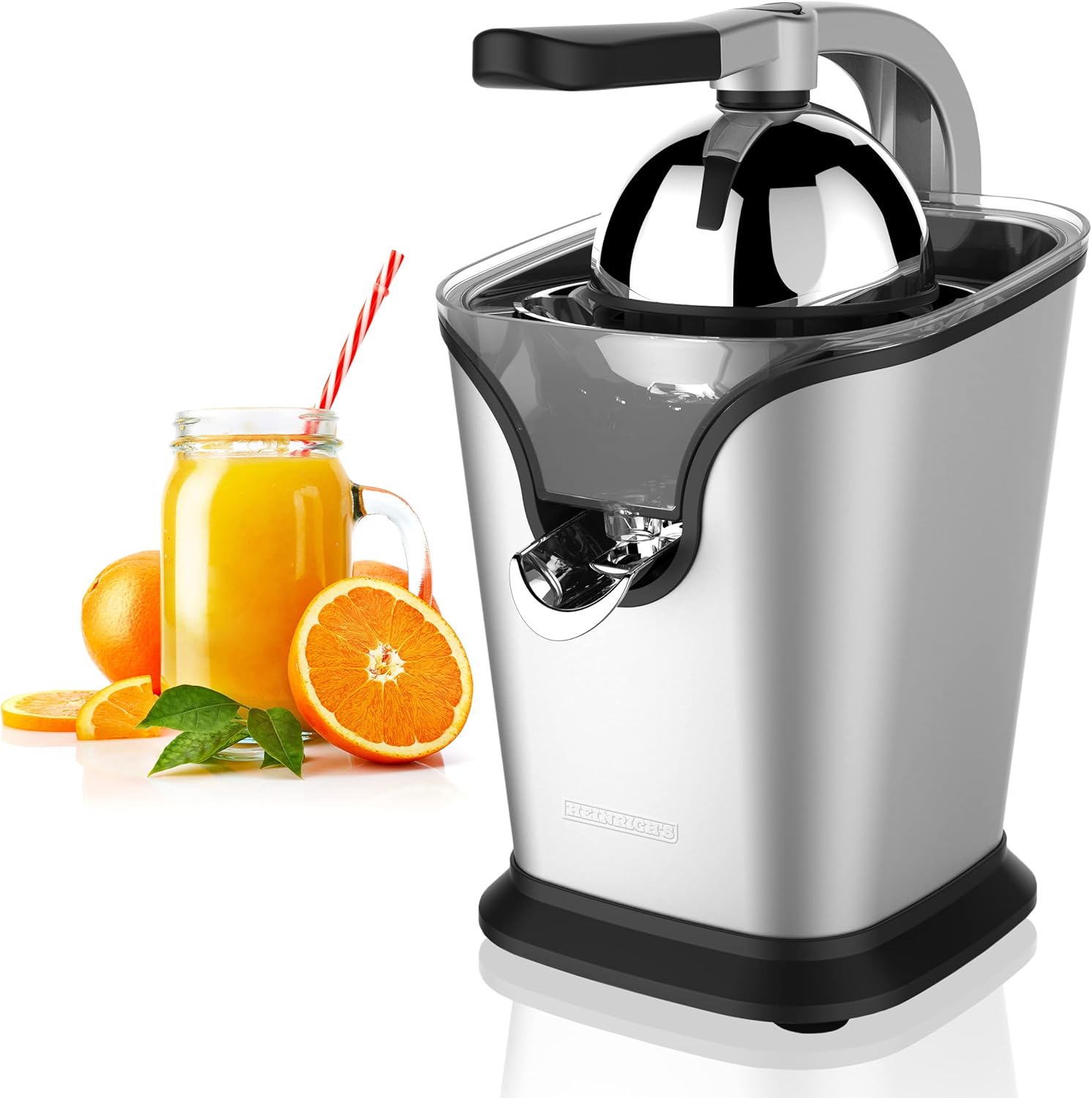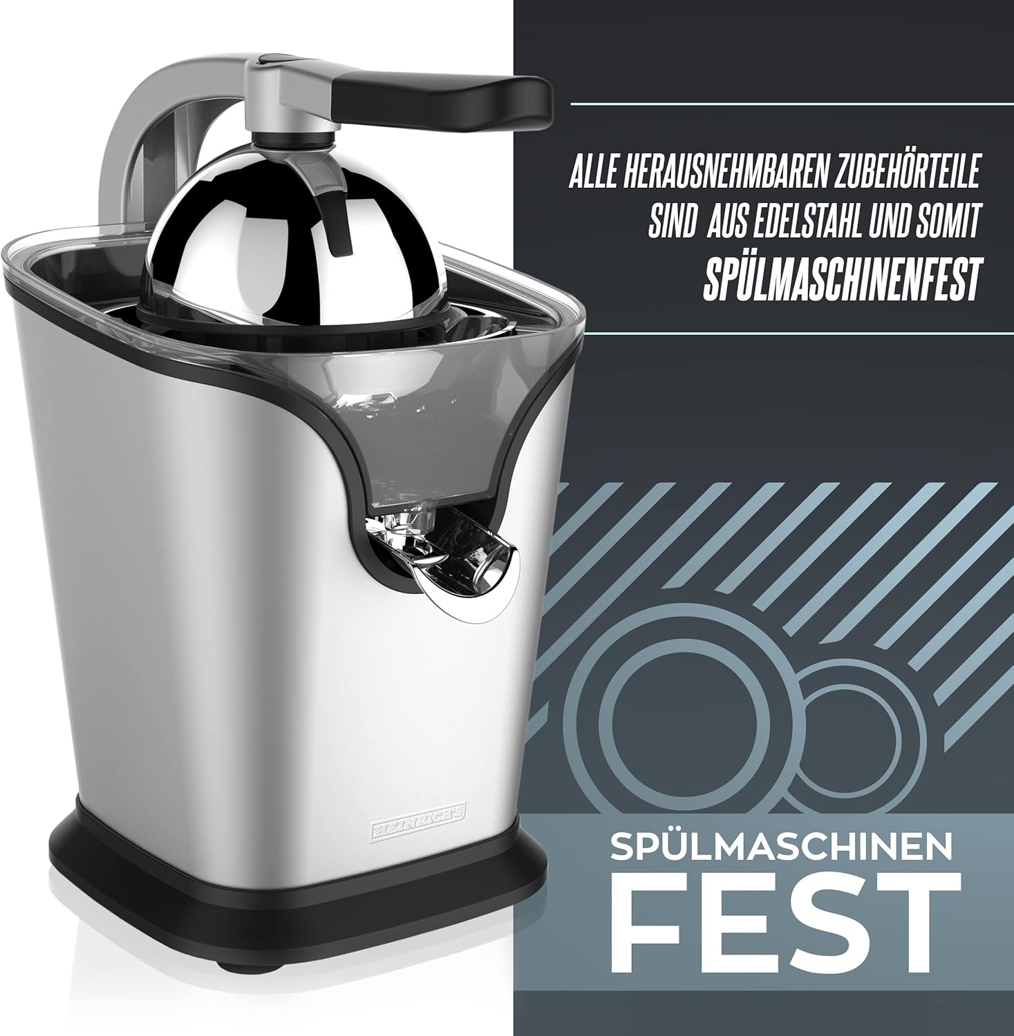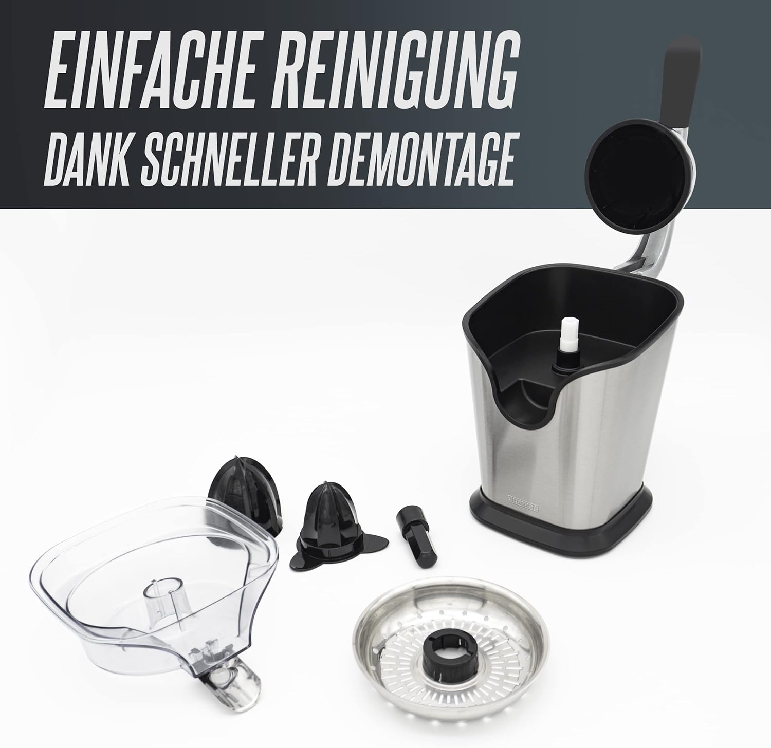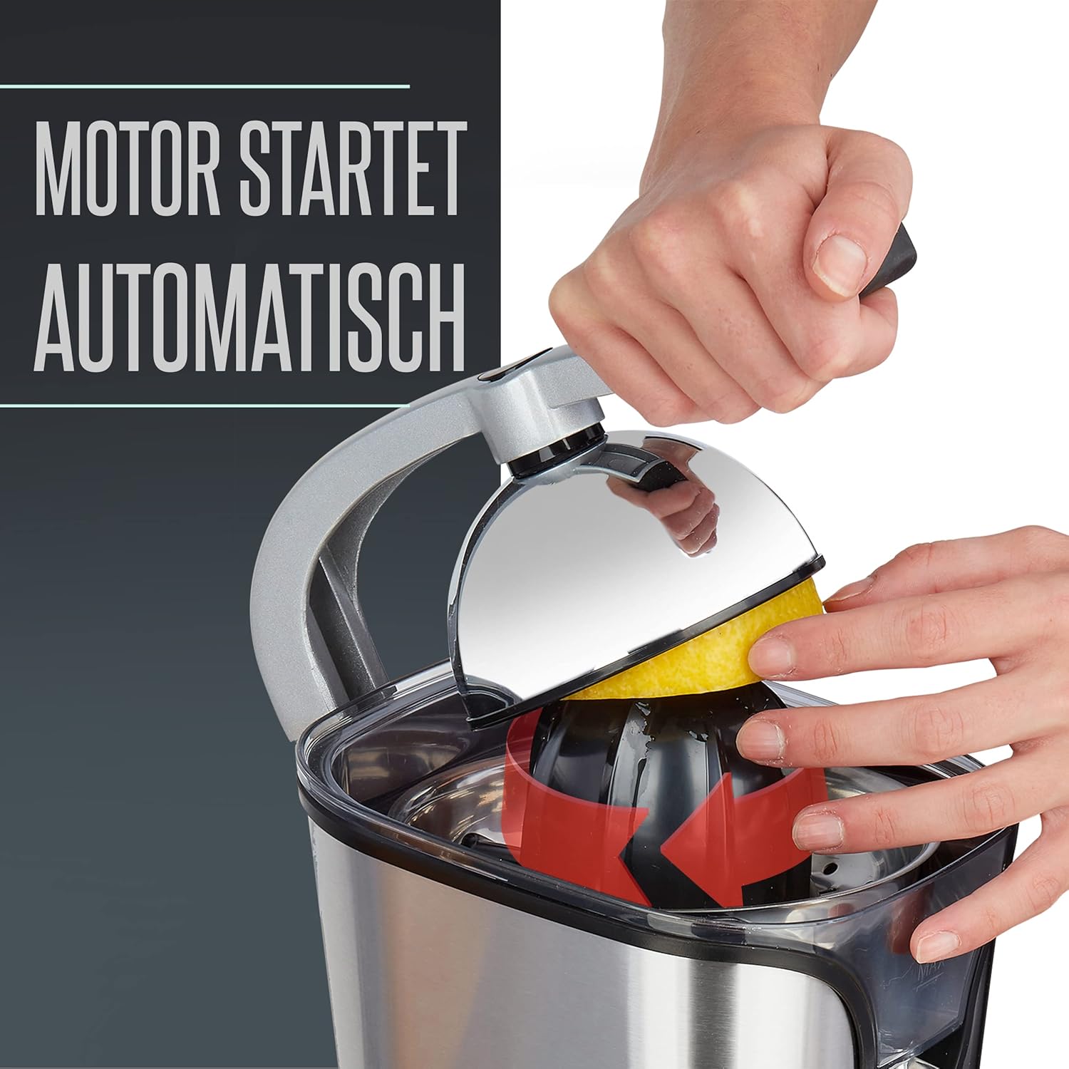 HEINRICHS elektrische Edelstahl Zitruspresse Juicer inkl. Fließstopfunktion professioneller Hebelarm rostfrei Universalaufsatz für Zitrusfrüchte Granatapfelpresse Saftpresse 100Watt, Heinrich´s Steel/Chrome | قیمت یورویی 63.9€