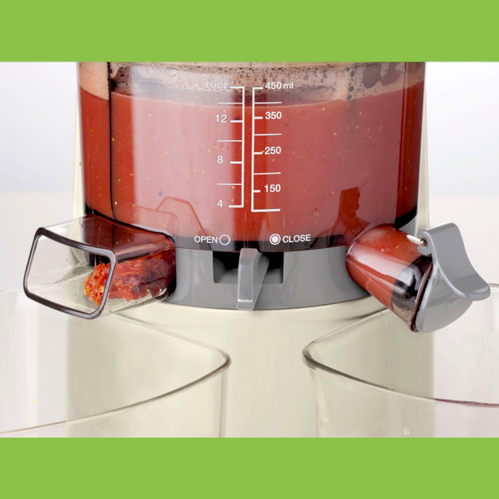 • دهانه ورودی بزرگ این مدل، امکان ورود تکههای بزرگتر میوه را فراهم میکند، در نتیجه نیاز به خرد کردن میوه به قطعات ریز کاهش مییابد.