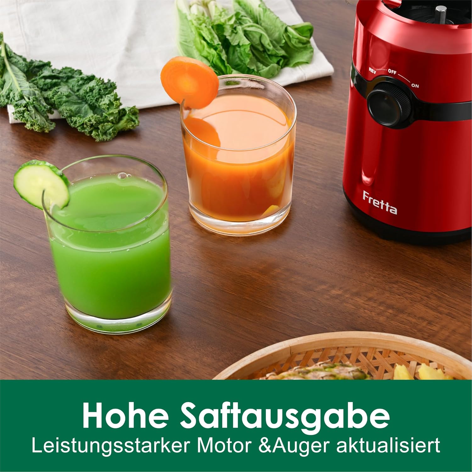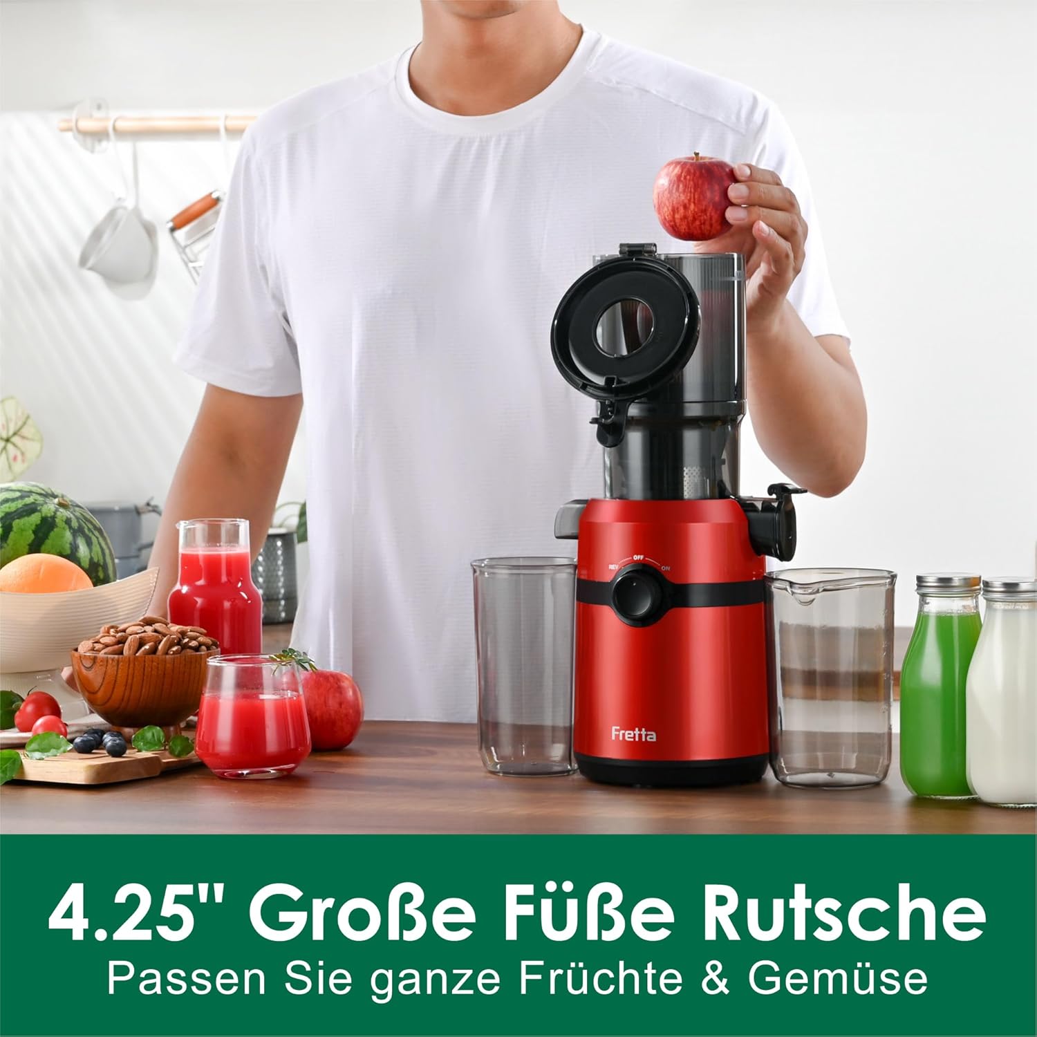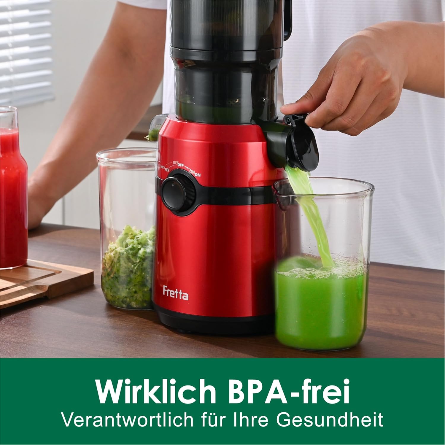 Fretta Entsafter,Slow Juicer mit 108 mm XL Öffnung&1L Kapazität,Entsafter Gemüse und Obst,200W Saftpresse elektrisch mit Cold Press,Einfache Reinigung und Leiser Motor,BPA-frei(Kaiser rot,1L) | قیمت یورویی 89.99€