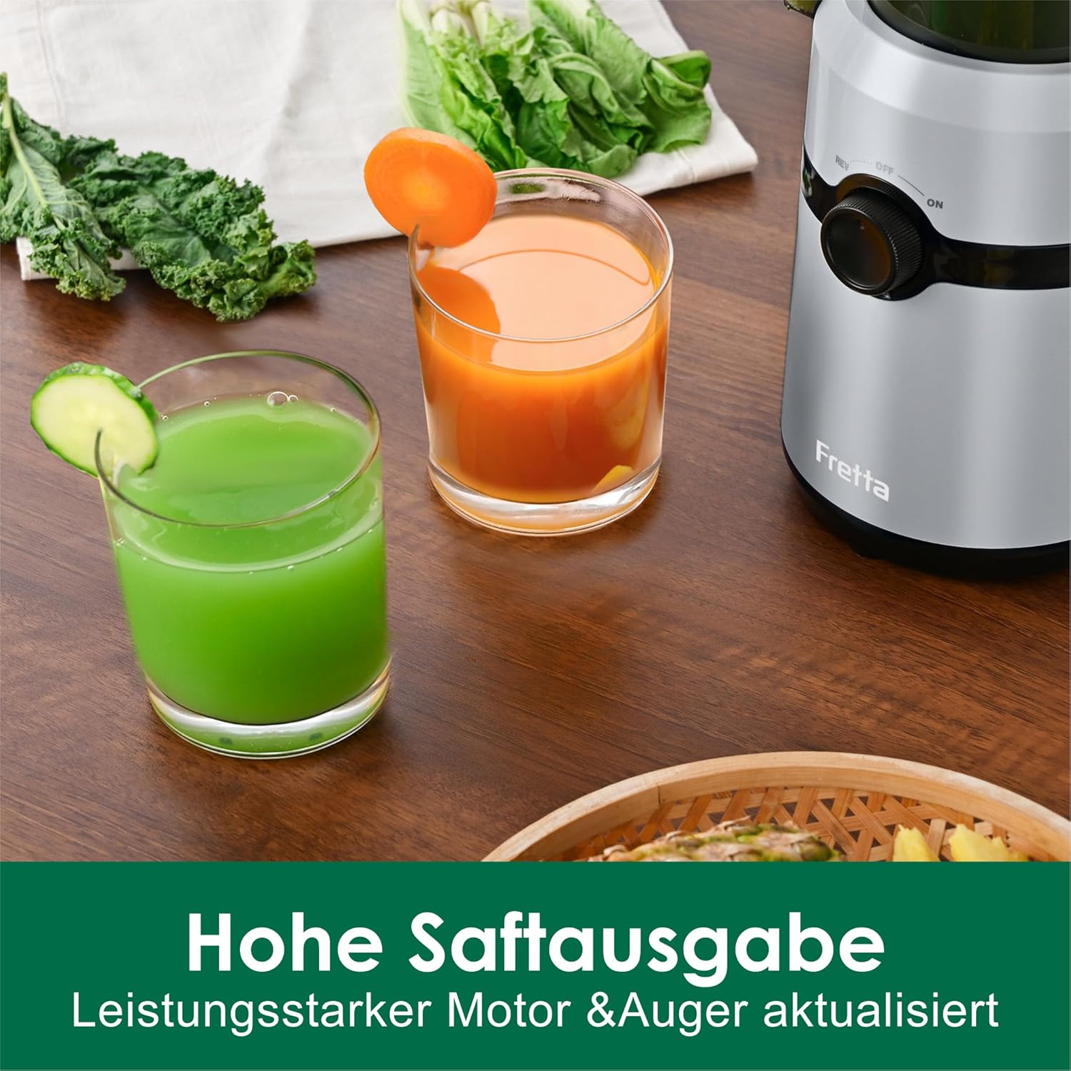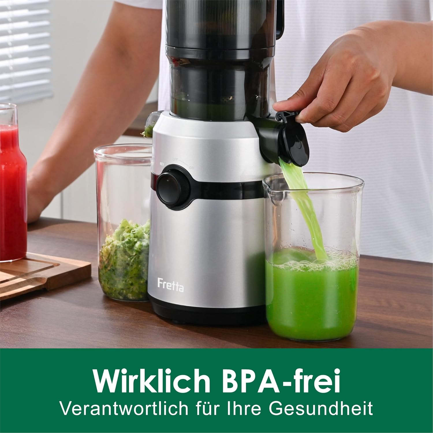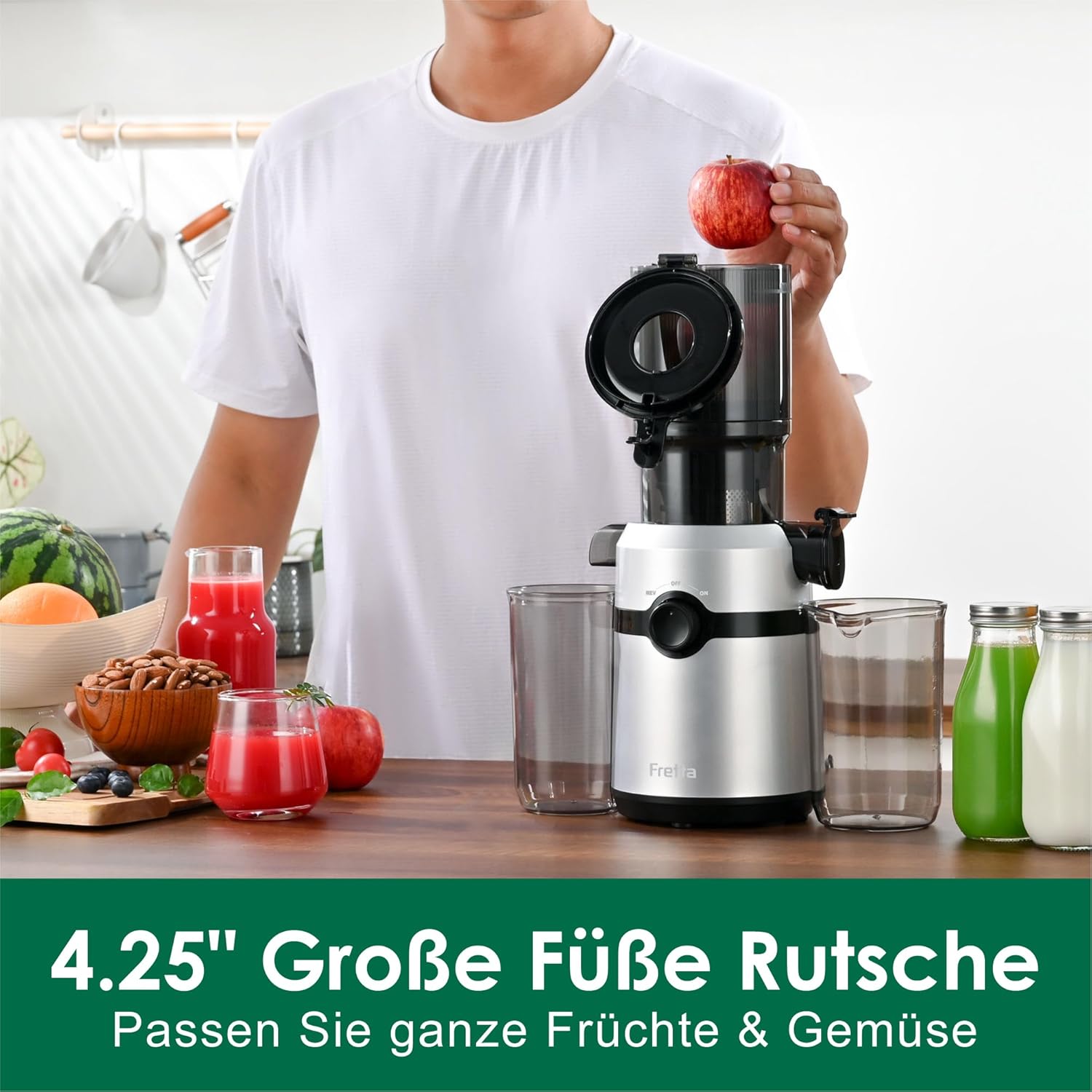 [108 mm Einfüllöffnung & 1 L Großvolumen]: Der Fretta Entsafter für Gemüse und Obst verfügt über eine große Einfüllöffnung. Ganze Äpfel, Gurken, Karotten und anderes Obst/Gemüse können ohne Vorzuschneiden schnell verarbeitet werden. Dies beschleunigt den Entsaftungsprozess, vereinfacht die Handhabung und steigert die Effizienz im Alltag, perfekt für den Haushaltsbedarf. [BPA-FREI & Tritan-Material]: Wirklich BPA-frei: Der Fretta Slow Juicer besteht aus BPA-freiem Tritan-Material der Stufe 1 für Babynahrung, das die Sicherheit und Reinheit Ihres Saftes garantiert. Mit seiner hervorragenden Haltbarkeit wird der Fretta Entsafter Ihr langjähriger Begleiter. Er ist die ideale Wahl für alle, die einen gesunden Lebensstil pflegen. [Kaltpress-Technologie & 3-fach Filtersystem]: Fretta Kaltpress-Entsafter nutzt optimierte Kaltpress- und Slow Juicing Technologie. Kombiniert mit einem leistungsstarken Motor und einem 3-fach Filtersystem stellt er sicher, dass jeder Tropfen Saft aus Obst und Gemüse extrahiert wird. Er überwindet "Nahrungsbarrieren", bewahrt maximale Nährstoffe, reduziert die Oxidation und deckt Ihren täglichen Nährstoffbedarf. [Rückflussfunktion & Sicherheitsdesign]: Die Rückflussfunktion des Fretta Entsafters löst Verstopfungen mühelos. Bei Ansammlungen von Fruchtfleisch während des Entsaftens genügt ein Druck auf die Rücklauftaste, um die Drehrichtung automatisch umzukehren und die Blockade schnell zu beseitigen. Automatischer Stopp beim Öffnen des Deckels und ein integrierter Überhitzungsschutz verhindern Unfälle während der Nutzung. [Einfache Reinigung & Integriertes Design]: Der Fretta Gemüse Obstentsafter verfügt über ein integriertes, nahtloses Design. Kein Verspritzen von Saft, ein tropffreier Auslauf, schnelle Reinigung und Montage. Der rutschfeste Standfuß gewährleistet Stabilität während desBetriebs. Produktionsstufennachdienst: Erstklassiger Kundensupport und lebenslange technische Unterstützung werden garantiert. | قیمت یورویی : 75.04€