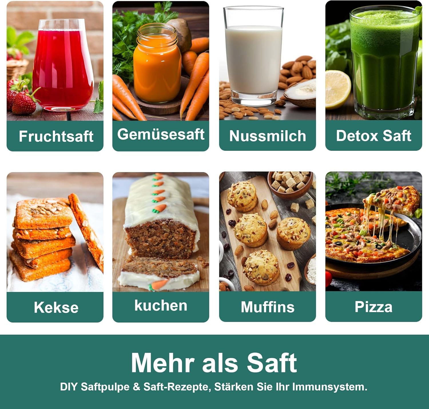 【Extrabreiter Einfüllschacht Saftmaschine】Fretta Horizontaler Slow Juicer Entsafter Gemüse und Obst Testsieger mit Bürste und 2 Tassen ist mit einem 76MM Großer Einfüllschacht ausgestattet, der es einfach macht, große Obst- und Gemüsestücke zu entsaften, ohne mühsames Schneiden und so sparen Sie Ihre Zeit. Tipps: Für einen besseren Geschmack ist es ratsam, die Schale vor dem Entsaften zu entfernen. 【BPA Freie für die Gesundhei der Familie】Wir bei Fretta legen großen Wert auf Ihr Wohlbefinden. Deshalb sind unsere Gemüse Entsafter Schnecke aus Tritan und dauerhaft 304 Edelstahl Material hergestellt, das eine BPA-freie Entsafterfahrung garantiert, die sicher ist und schützen Sie und Ihre Familie vor den möglichen Gefahren minderwertiger Materialien. So Horizontale Slowjuicer Entsafter Fruchtpresse Elektrische Saftpresse Testsieger ist ideal für Allergiker. 【Ultrahohe Saftausbeute & reduzierter Abfall】Fortschrittliche Low-Speed-Kaltpressen-Technologie ermöglicht es den Juicer Machine, die maximale Menge an Saft aus Obst und Gemüse zu extrahieren. Bei einer sanften Drehzahl von 80 U/min wird das Obst und Gemüse effizient ausgepresst, wodurch die Schaumbildung minimiert und Verstopfungen verhindert werden, was letztendlich die Saftausbeute maximiert. Verabschieden Sie sich von der Verschwendung und holen Sie das Beste aus Ihren Zutaten heraus! 【Erhöhter Nährwert & köstlicher Geschmack】Kaltpresse Entsafter nutzt die Kaltpress-Technologie mit niedriger Geschwindigkeit, um den Saft schonend zu extrahieren und gleichzeitig wichtige Nährstoffe zu erhalten. Im Gegensatz zu Hochgeschwindigkeits-Zerkleinerungs- und Schleudertechniken minimiert dieser Prozess die Oxidation und verlängert die Frische Ihres Saftes. Genießen Sie jeden einzelnen Schluck, den verbesserten Nährwert und den exquisiten Geschmack Ihres frisch gepressten Saftes! 【Leistungsstarker aber leiser Motor】Fretta Profi Slow Juicer Testsieger Karotten Sellerie Juice Maker Maschine werden von einem robusten 200 W Gleichstrommotor angetrieben. Das Design mit hohem Drehmoment und niedriger Drehzahl arbeitet leise und extrahiert die Nährstoffe aus Ihren Lieblingsfrüchten und -gemüsen. Diese Obstpresse Elektrisch Orangenpresse läuft unter 70DB, so dass er Ihre Nachbarn und Familie nicht stört. 【Sicheres Y-förmiges Design】Der Einfüllschacht der Gute Qualität Selleriesaft Entsafter Obst und Gemüse Saft Maschine verfügt über ein sicheres Y-förmiges Design, das speziell entwickelt wurde, um ein versehentliches Einführen mit der Hand zu verhindern und das Risiko von möglichen Handverletzungen zu minimieren. Fretta Juicer Entsafter Elektrisch als Fruchtsaftpresse, Gemüsesaftpresse und Nussmilch Maschine. 【Doppelte Zuführungsrutsche für mehr Effizienz】Fretta Ingwer Saftpresse Elektrisch Zitruspresse Apfelpresse ist mit einem praktischen doppelten Einfüllschacht ausgestattet. So können Sie mehrere Zutaten gleichzeitig einfüllen, was Ihnen Zeit und Mühe beim Entsaften spart. Darüber hinaus ist der Schieber so konzipiert, dass er eine kontinuierliche Zufuhr ermöglicht, ohne dass er entfernt werden muss, was den Entsaftungsprozess weiter vereinfacht. 【Einfache Montage & Reinigung】Schwarz Presse Obstpresse Elektrische Apfelsaftpresse Fruchtentsafter ist für eine mühelose Verwendung konzipiert. Mit nur einem einzigen Knopfdruck lässt sich der Entsafterkörper leicht abnehmen und unter fließendem Wasser reinigen. Zu Ihrer Bequemlichkeit haben wir auch eine spezielle Bürste beigefügt, mit der Sie mühelos alle kleinen Trester aus dem Entsaftersieb entfernen können. 【2 Modi & Rückwärtsfunktion】Cold Press Juicer Extractor Squeezer bietet 2 Geschwindigkeits Modi und eine praktische Rücklauffunktion. "Soft-Modus" (85-100 U/min) zum Entsaften von Orangen, Wassermelonen, Trauben, Beeren und weichen Früchten."Hard-Modus" (95-110 U/min) für Äpfel, Birnen, Karotten, Rüben, Sellerie, Ingwer, Grünkohl und härtere Zutaten. Die umkehrfunktion verhindert effektiv Verstopfungen während des Entsaftungsvorgangs und sicher kontinuierliches und ununterbrochenes Entsaften. 【Saft ohne Fruchtfleisch & Mehr Kulinarik】Grünes Presse Entsafter Elektrisch für Gemüse und Obst ist mit einem Edelstahlfilter mit einem feinen und dichten Netz ausgestattet, das den Saft angemessen vom Trester trennt und reine Farbe, natürlichen Geschmack, Nährstoffe & Vitamine behält. Jeder Schluck, den Sie nehmen, ist ein reiner, köstlicher Saft. Mehr als Saft, die Verschwendung von Gemüse und Obst vermeiden, können Sie Viele Leckereien wie z.B. kuchen, Kekse, Muffins, Pizza, Suppe. | قیمت یورویی : 79.99€