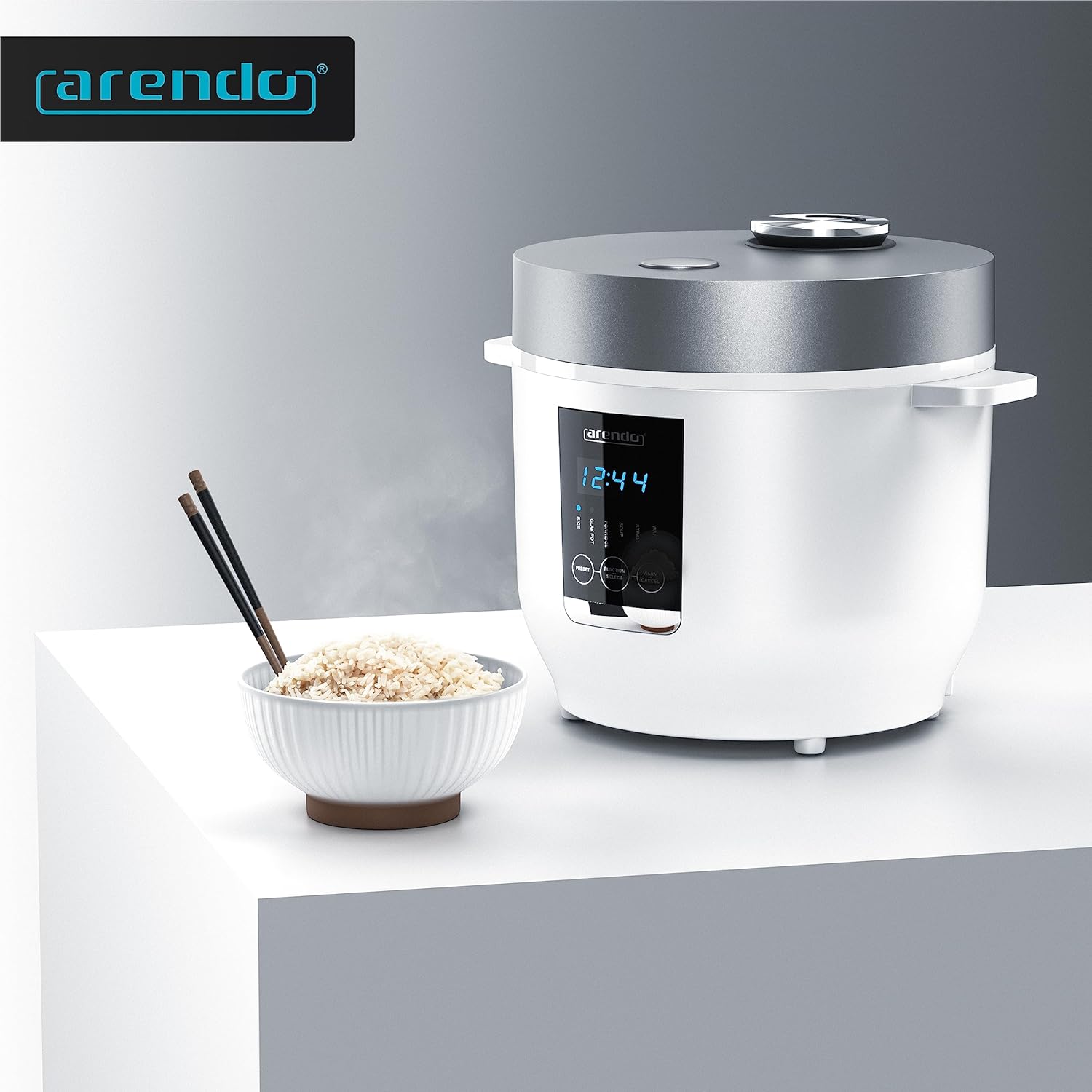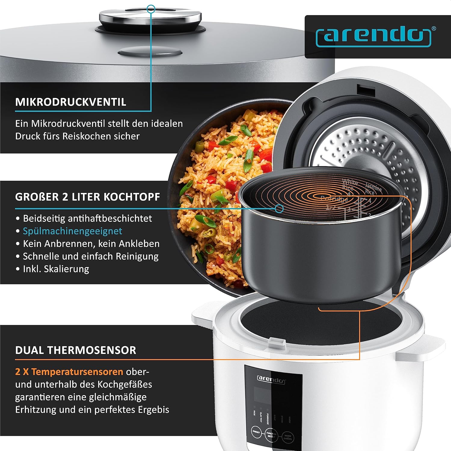 آرندو - پلوپز دیجیتالی - پلوپز چندکاره - بخارپز - 2 لیتر - عملکرد گرم نگه داشتن - قابلمه نچسب، قاشق برنج و پیمانه - پلوپز آرام پز برای سبزیجات و ماهی و غیره