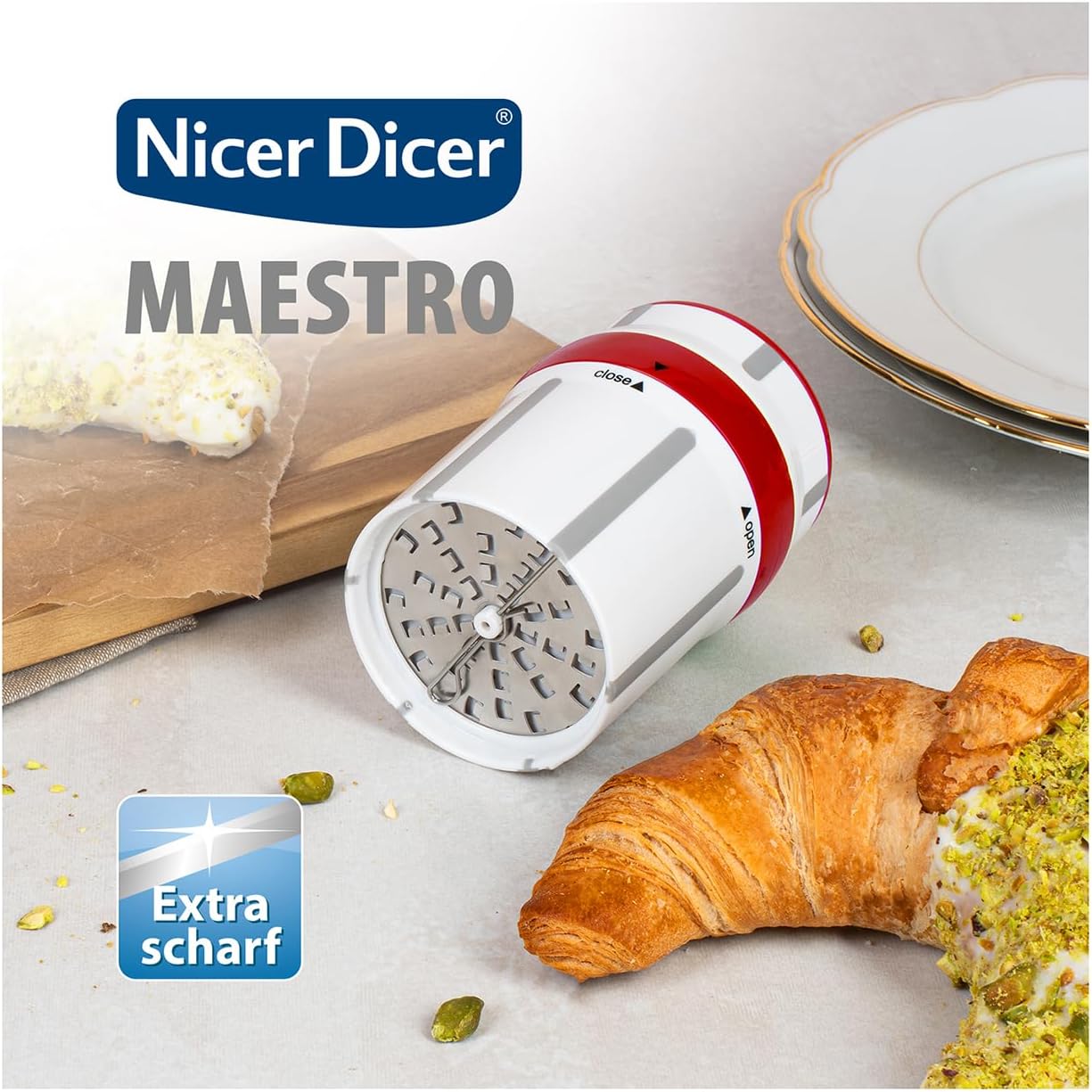 آسیاب ادویه جات جنیوس Nicer Dicer Maestro با 3 تیغه، ست 6 تکه، پنیر رنده، جوز هندی، رنده پارمزان با ظرف و درب، خلال پنیر، رنده سیر، رنده آشپزخانه با انبار، قرمز