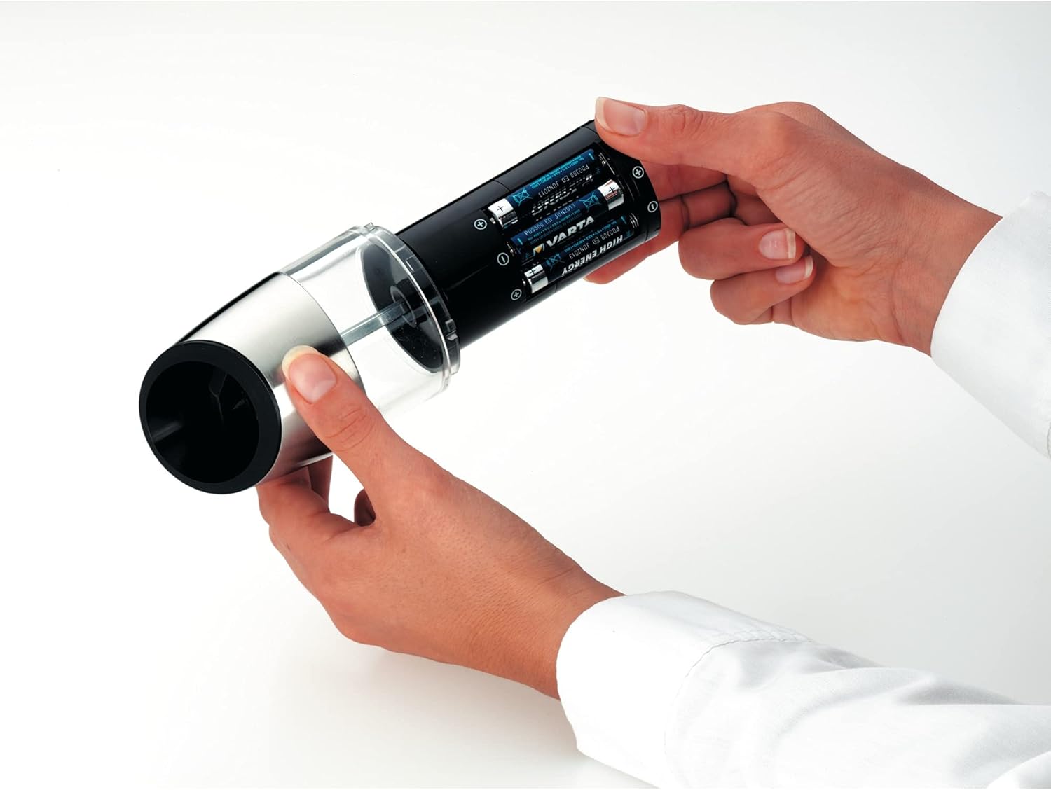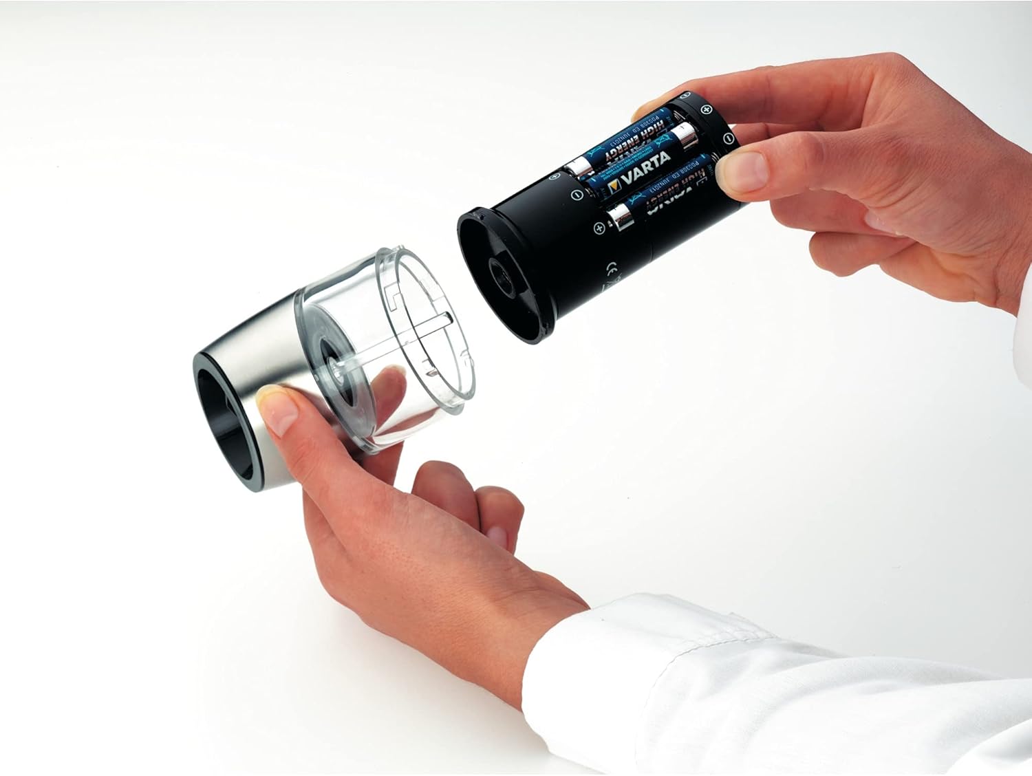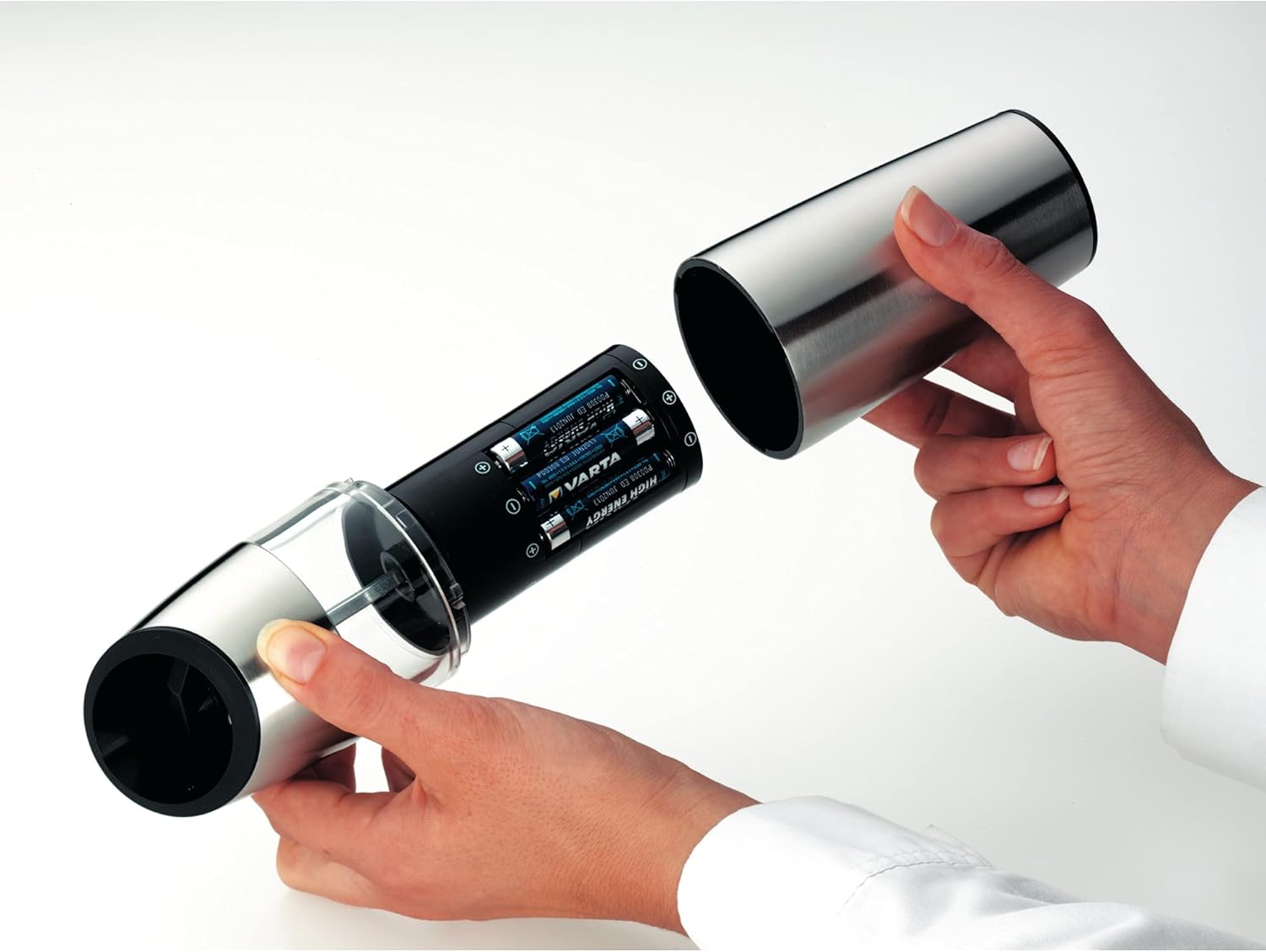 Inhalt: 1x Gewürzmühle elektrisch (Höhe 20 cm) inkl. 6 Batterien AAA 1,5 V - Artikelnummer: 0667346030 Material: Cromargan Edelstahl 18/10, mattiert, Acrylglas, Kunststoffkappe, Keramik-Mahlwerk - der Glasbehälter ist spülmaschinengeeignet Das Mahlwerk schaltet sich automatisch ein und aus, wenn die Mühle geneigt wird. Der starke Elektromotor lässt einen hohen Mahldurchsatz zu. Stufenlose Einstellung der Mahlstärke von grob bis fein Keramikmahlwerk ist härter als Stahl, korrosions- und verschleißfrei. Es mahlt Pfeffer und Salzkörner, getrocknete Kräuter (Chillischoten) und Gewürze. Keramik ist lebensmittelneutral und abriebfrei Herstellergarantie: 10 Jahre auf das Keramikmahlwerk. Die Garantiebedingungen finden Sie unter „Weitere technische Informationen“ | قیمت یورویی : 54.99€