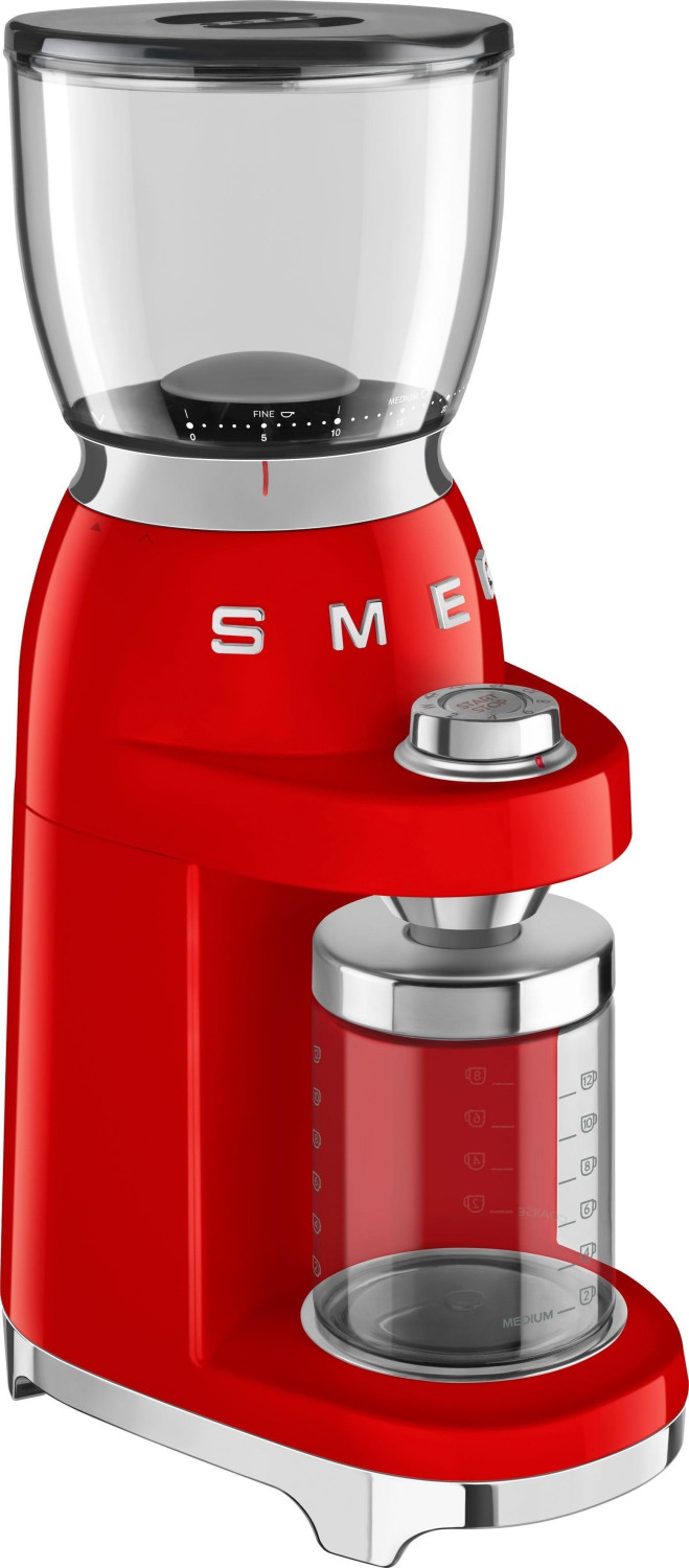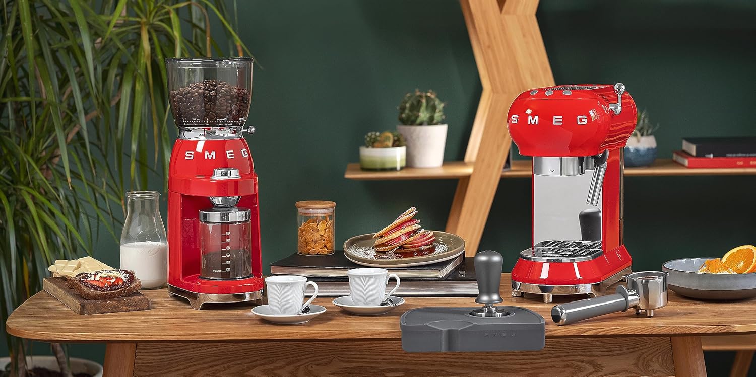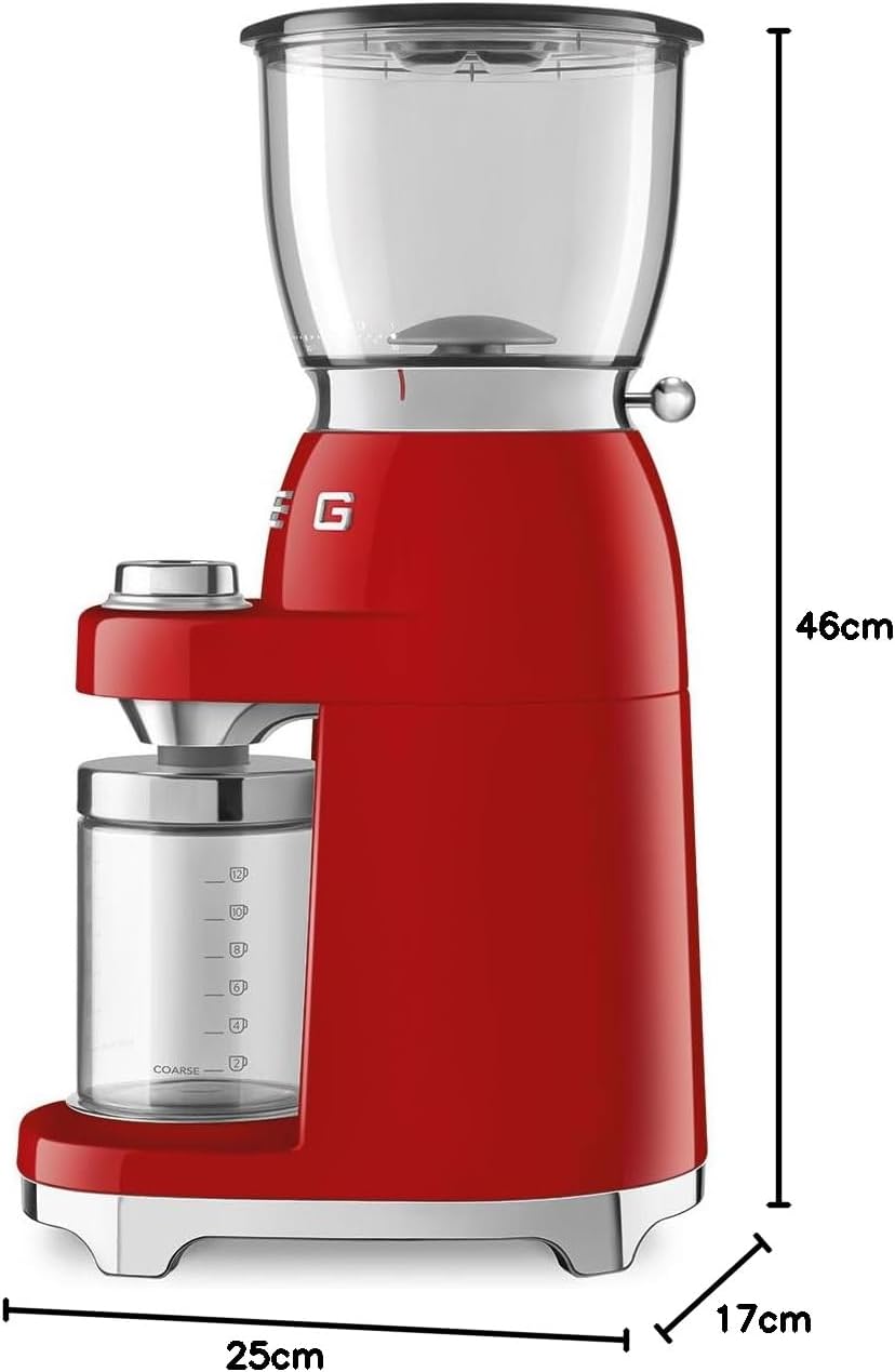 آسیاب قهوه اسمگ مدل CGF01 با طراحی رترو دهه ۵۰ میلادی و رنگ خاص قرمز، ظاهری زیبا و کلاسیک را با عملکرد حرفهای ترکیب میکند. این آسیاب با تیغه استیل مخروطی، دانههای قهوه را با دقت و یکنواختی آسیاب میکند.