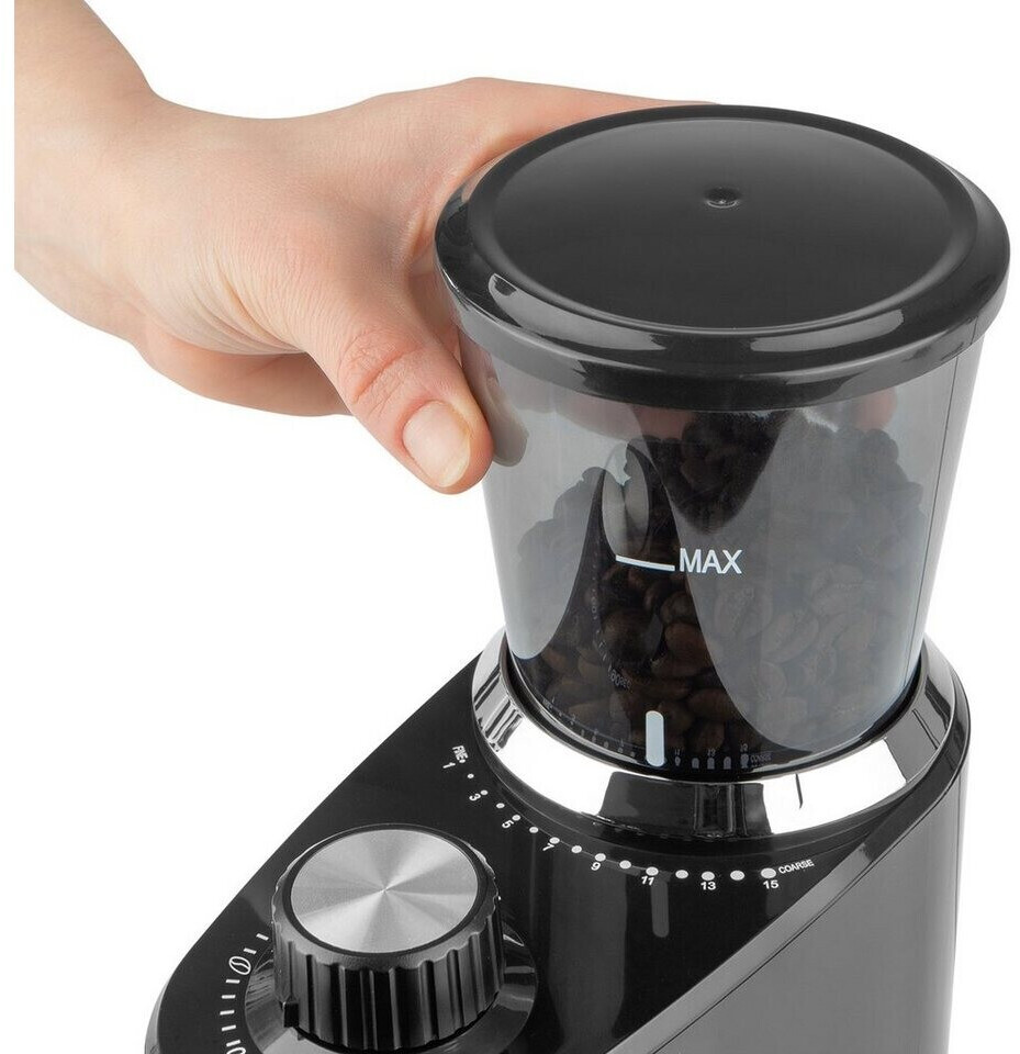 با قابلیت تنظیم ۱۵ درجهای، امکان انتخاب نوع آسیاب مناسب برای تهیه اسپرسو، قهوه فرانسه یا فرنچ پرس وجود دارد. این مدل دارای مخزن دانه قهوه با ظرفیت ۱۶۰ گرم و مخزن پودر با ظرفیت ۱۰۰ گرم است و میتواند برای ۲ تا ۱۲ فنجان قهوه آسیاب کند.