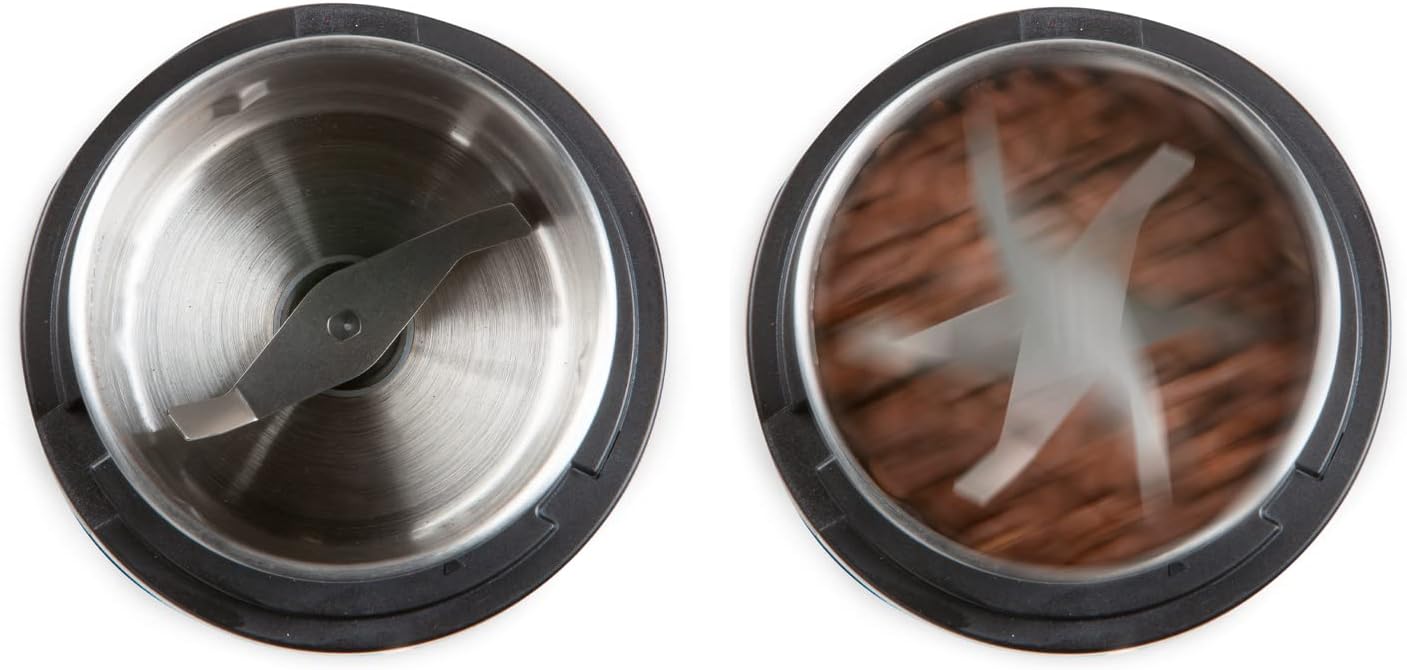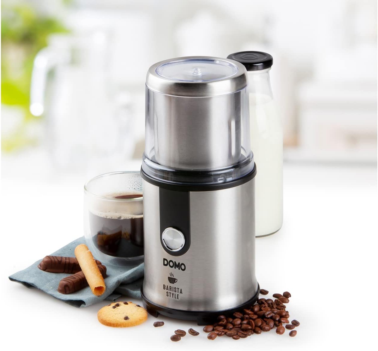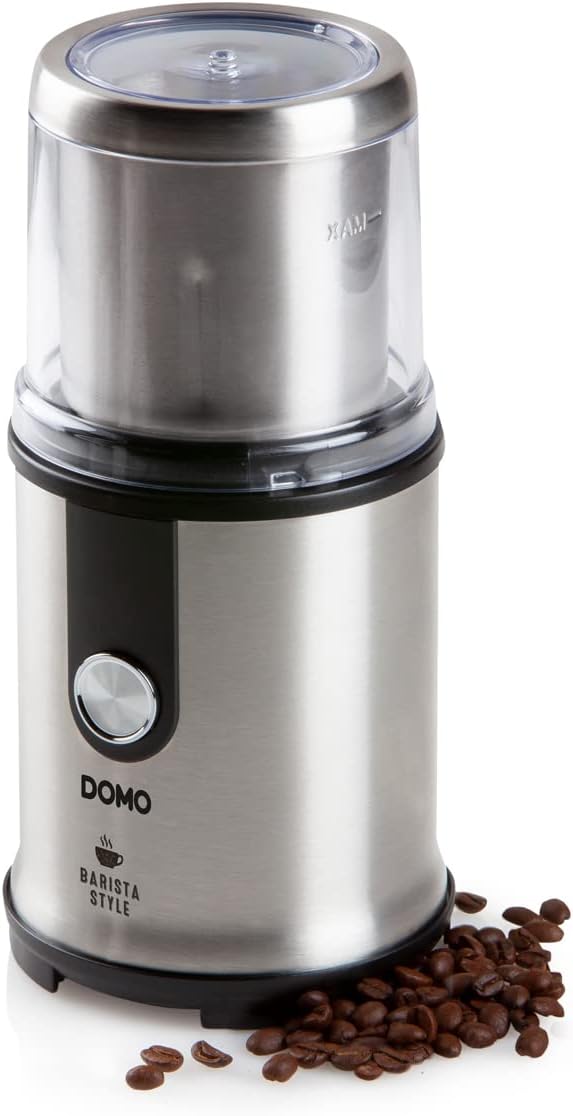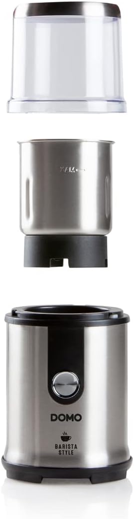 FRISCH GEMAHLENER KAFFEE IN SEKUNDEN - Die DOMO Elektrische Kaffeemühle DO723K mit Edelstahl-Mahlwerk mahlt bis zu 110 g Bohnen für perfekten Kaffeegenuss direkt aus der eigenen Küche INDIVIDUELLER MAHLGRAD NACH WUNSCH - Die Mahlstärke der DOMO Kaffeemühle lässt sich manuell über die Dauer bestimmen, für grobes oder feines Kaffeepulver ganz nach deinem Geschmack KAPAZITÄT FÜR BIS ZU 14 TASSEN - Mit 110 g Fassungsvermögen eignet sich die DOMO Elektrische Kaffeemühle ideal für die Zubereitung von Kaffee für dich allein oder für Gäste KOMPAKT UND BENUTZERFREUNDLICH - Diese Elektrische Kaffeemühle ist platzsparend, leicht zu bedienen und mit praktischer Kabelaufwicklung ausgestattet – ideal für jede Küche EINFACHE REINIGUNG DANK ENTFERNBAREM BEHÄLTER - Der gemahlene Kaffee kann direkt aus dem entnehmbaren Behälter entnommen werden, was die DOMO Kaffeemühle besonders hygienisch macht ROBUST UND SICHER - Die DOMO DO723K überzeugt mit Edelstahlgehäuse, 300-Watt-Leistung und eingebauter Sicherheitsfunktion für zuverlässiges und sicheres Mahlen zu Hause | قیمت یورویی : 39.99€