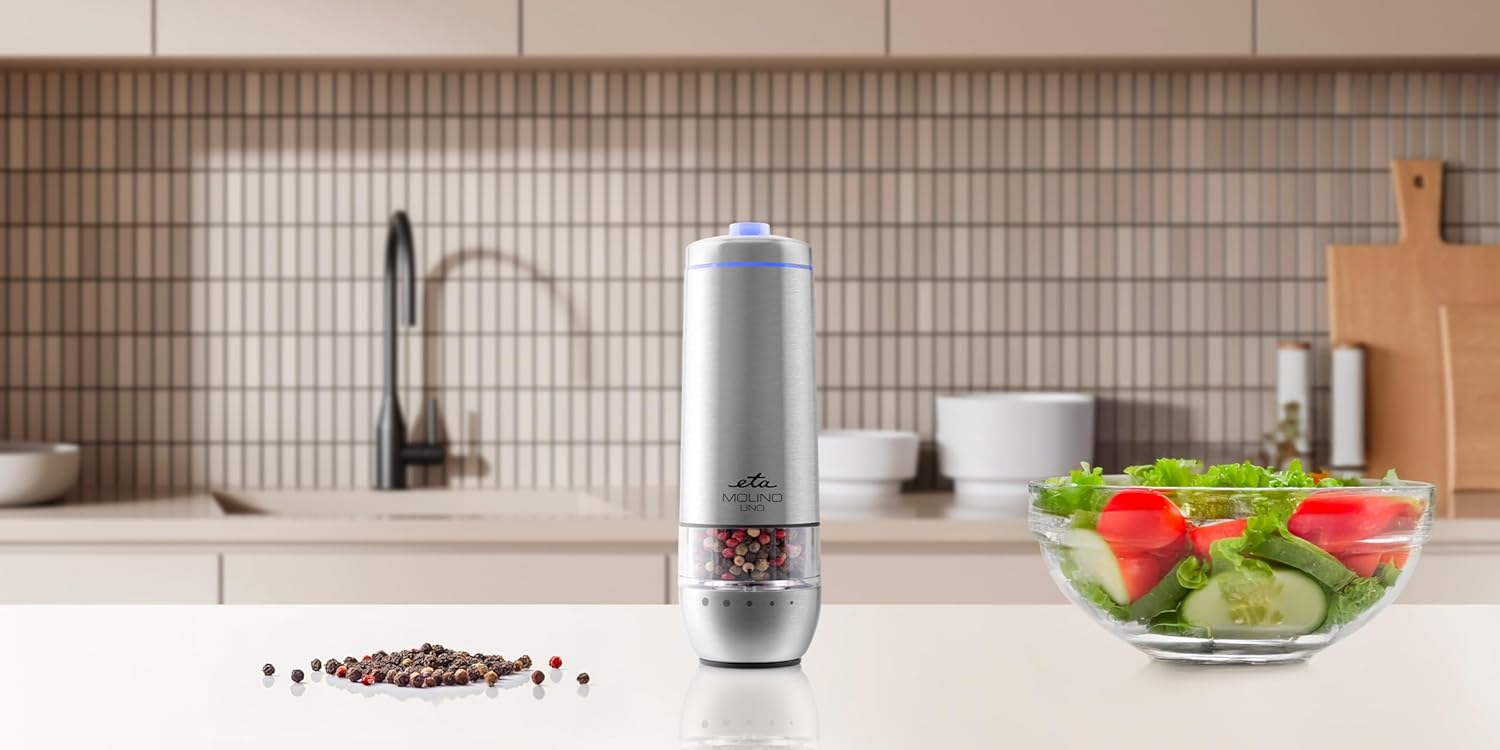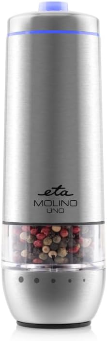 آسیاب نمک و فلفل برقی ETA با آسیاب سرامیکی Molino Uno | قابل شارژ با USB-C | سطح آسیاب قابل تنظیم | طراحی مدرن | برای نمک، فلفل و ادویه