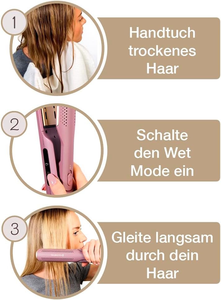 2-IN-1-STYLER FÜR NASS- & TROCKENHAAR – Mit zwei Styling-Modi: Trocknet und glättet nasses Haar schonend, stylt und glättet trockenes Haar. Im WetMode sorgt ein konzentrierter Luftstrom in Kombination mit niedrig temperierten Stylingplatten für effektives Trocknen ohne schädliche Hitze. Bewahrt die natürliche Feuchtigkeit bis zu 24 Std. (In REMINGTON Labortests nach 24 Stunden im WetMode nachgewiesen). FRIZZ-FREIER GLANZ DANK IONIC AIR TECHNOLOGIE – Ionic Air-Technologie gibt Millionen von Ionen ab, reduziert statische Aufladung und kühlt das Haar für ein glattes, glänzendes Finish. WÄRMEAKTIVIERTE MIKROWIRKSTOFFE MIT NEUER ANTI-FRIZZ-FORMEL – Mikrowirkstoffe werden beim Stylen freigesetzt und schützen das Haar den ganzen Tag vor Frizz. (Wie im REMINGTON -Labortest nach 24 Stunden gezeigt) AKTIV GEKÜHLTES, ABGERUNDETES GEHÄUSE – Kreiere schwungvolle Locken, Flicks oder Wellen mit mehr Kontrolle SCHNELL & SICHER STYLEN – Heizt in nur 30 Sek. auf, mit LED-Anzeige, federnd gelagerten 35mm Stylingplatten für schnelles Glätten und automatischer Abschaltung – perfekt für deinen aktiven Alltag. | قیمت یورویی : 129.99€