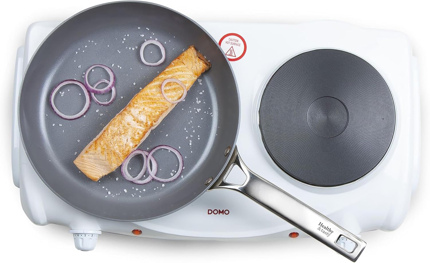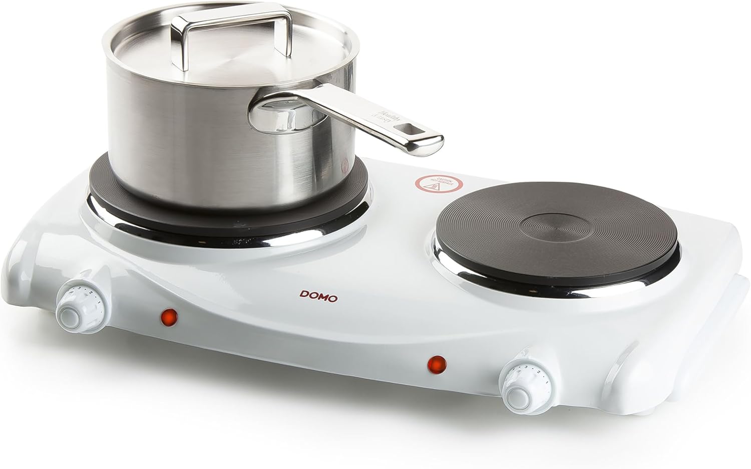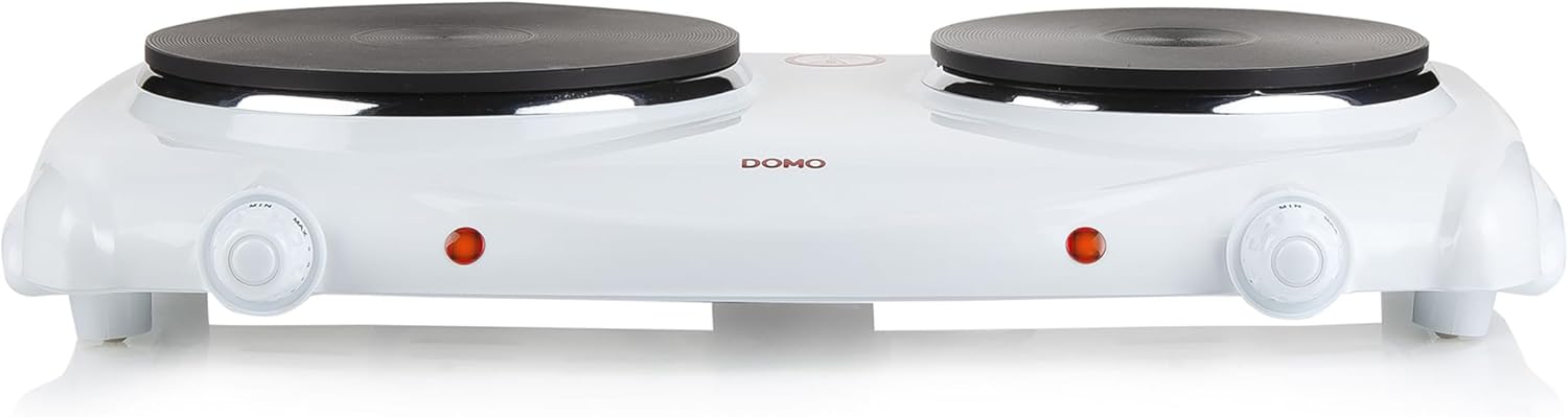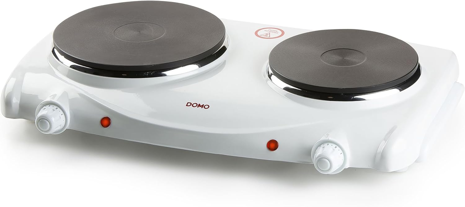 DOMO DO310KP Kochplatte - 2 Kochfelder لینک آمازون : https://www.amazon.de/dp/B002BA58WW?th=1&psc=1 صفحه پخت دو شعله با قطر ۱۵.۵ و ۱۸.۵ سانتیمتر، ترموستات قابل تنظیم ۶ مرحلهای، دستههای مقاوم در برابر حرارت، صفحه آلومینیومی ریختهگری شده، ۲۳۰ ولت - ۵۰ هرتز - ۱۰۰۰-۱۵۰۰ وات