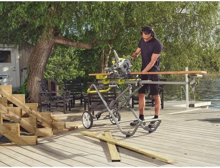 اره چرخدار شارژی RYOBI 18 V ONE+ R18MS216-0، اره چرخدار با قابلیت کشش، زاویه میتر بدون پله، زاویه شیب 0° - 45 درجه، رویه میز ساخته شده از آلومینیوم دایکاست، بدون باتری و شارژر