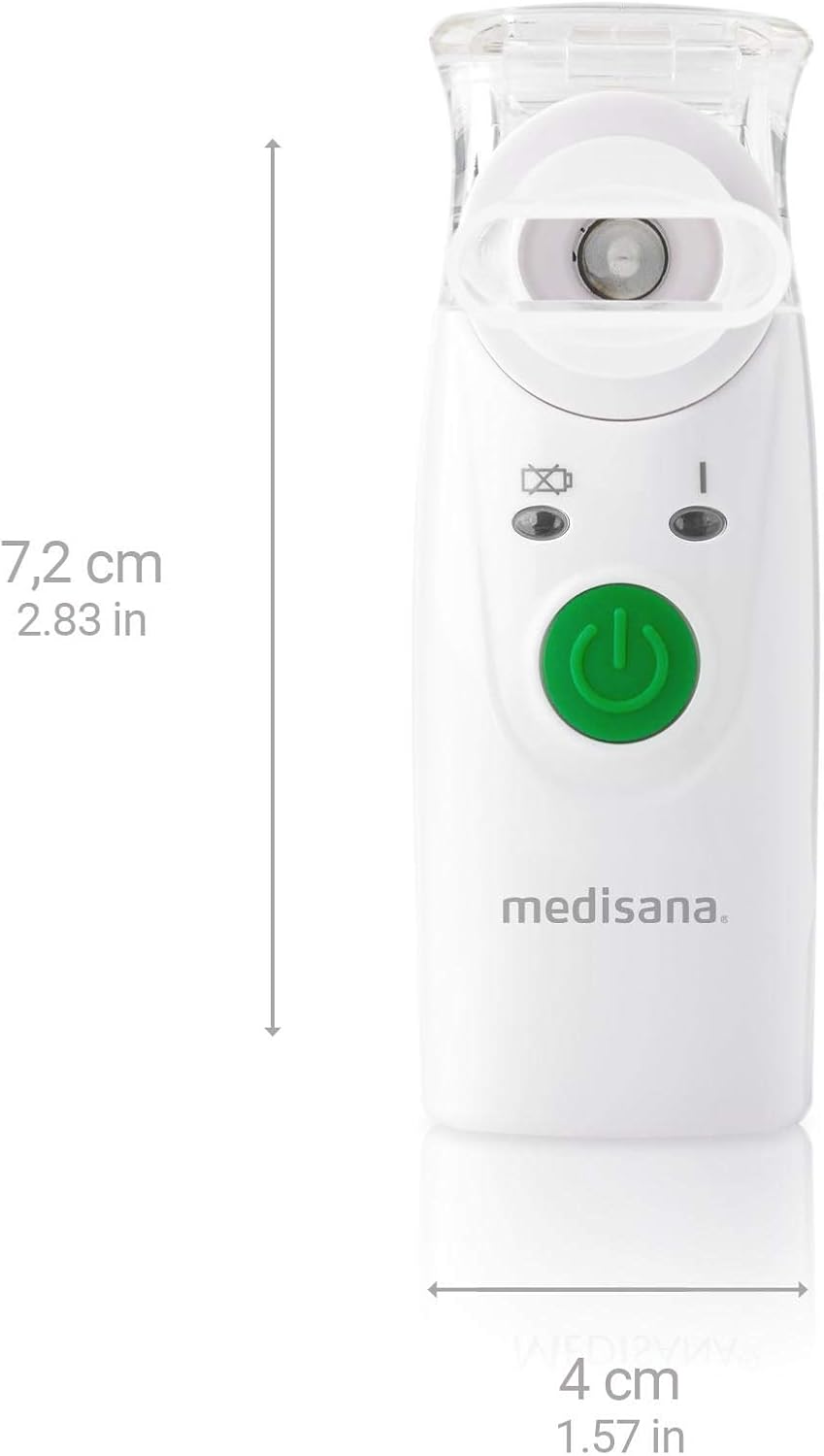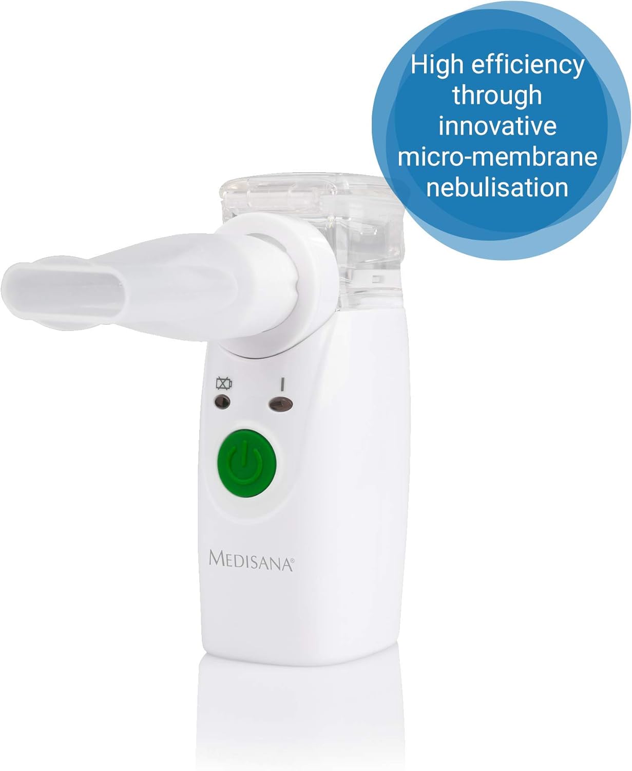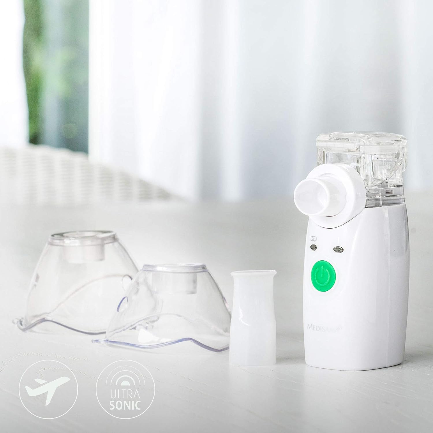 استنشاقی مدیسانا IN 525 برای استفاده در حال حرکت، دستگاه استنشاقی سیار با دهانه و ماسک برای بزرگسالان و کودکان، نبولایزر استنشاقی برای سرماخوردگی یا آسم با لوازم جانبی اضافی با فناوری اولتراسوند