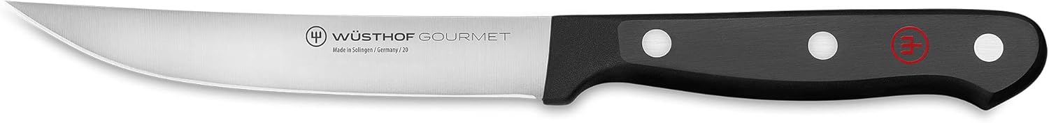 Mit Gourmet hat Wüsthof Messer Basics im Angebot, die als scharfe Kochmesser nicht nur durch besondere Qualität und einen günstigen Preis begeistern, sondern als sehr gute Solinger Messer – so wie dieses Spezialmesser (auch als Steak Messerset erhältlich) Spezialklinge für mehr Fleisch-Genuss – das ultrascharfe Steak Messer für Fleisch gleitet mühelos durch Fleisch-Fasern, ohne sie zu zerreißen. So schont das Schneidemesser das gute Fleisch-Aroma: ob Rumpsteak, Schweinfilet oder Grill-Fest – mmhhh lecker Scharf und stabil – die ausgelaserte Messerklinge wird in 35 Arbeitsgängen so verarbeitet, dass sie durch eine Härte von 56° Rockwell und der Verlängerung unter dem Griff mit der Stabilität und Schärfe geschmiedeter Profi Küchenmesser vergleichbar ist Agil und spülmaschinengeeignet – der ergonomische Griff aus Spezialkunststoff ist 3-fach vernietet und absolut pflegeleicht. Dank des geringen Gewichts ermöglicht das Fleischmesser Profi Messer präzises, schwungvolles Schneiden – also viel Spaß beim BBQ Wüsthof Gourmet überzeugt durch ein sehr gutes Preis-Leistungsverhältnis und ist als Starterset für den Privat-Haushalt ebenso interessant wie als Grundausstattung für die Gastronomie (Profiküche). Küchen Messer – Made in Germany, hergestellt in Solingen | قیمت یورویی : 29.9€