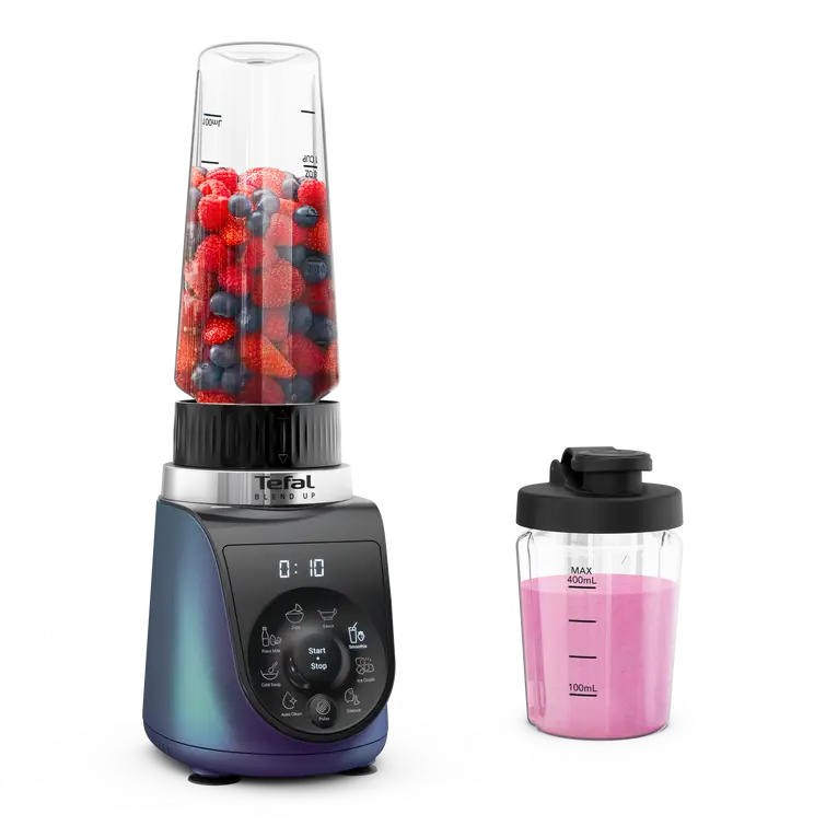 مخلوطکن Blend Up هر آنچه را که دوست دارید در یکجا دارد: یک مخلوطکن کوچک اما مقاوم با فناوری بیسابقه و طراحی آسان برای تمیز کردن. به لطف اندازه جمعوجور و طرح رنگ متمایزش، این مخلوطکن قطعاً در آشپزخانه شما چشمنواز خواهد بود. از همه چیز، از اسموتیهای سالم و نوشیدنیهای گیاهی گرفته تا سسهای خوشمزه، سوپها، دیپها و موارد دیگر لذت ببرید. به لطف ایدههای متنوع دستور پخت در برنامه تفال، مطمئناً هرگز ایدههایتان تمام نمیشود. نوشیدنیها را مستقیماً در بطریهای قابل حمل مخلوط کنید و آنها را هر کجا که میروید با خود ببرید. حتی یک حالت سکوت ویژه برای استفاده بدون وقفه در صبح و عصر وجود دارد!
