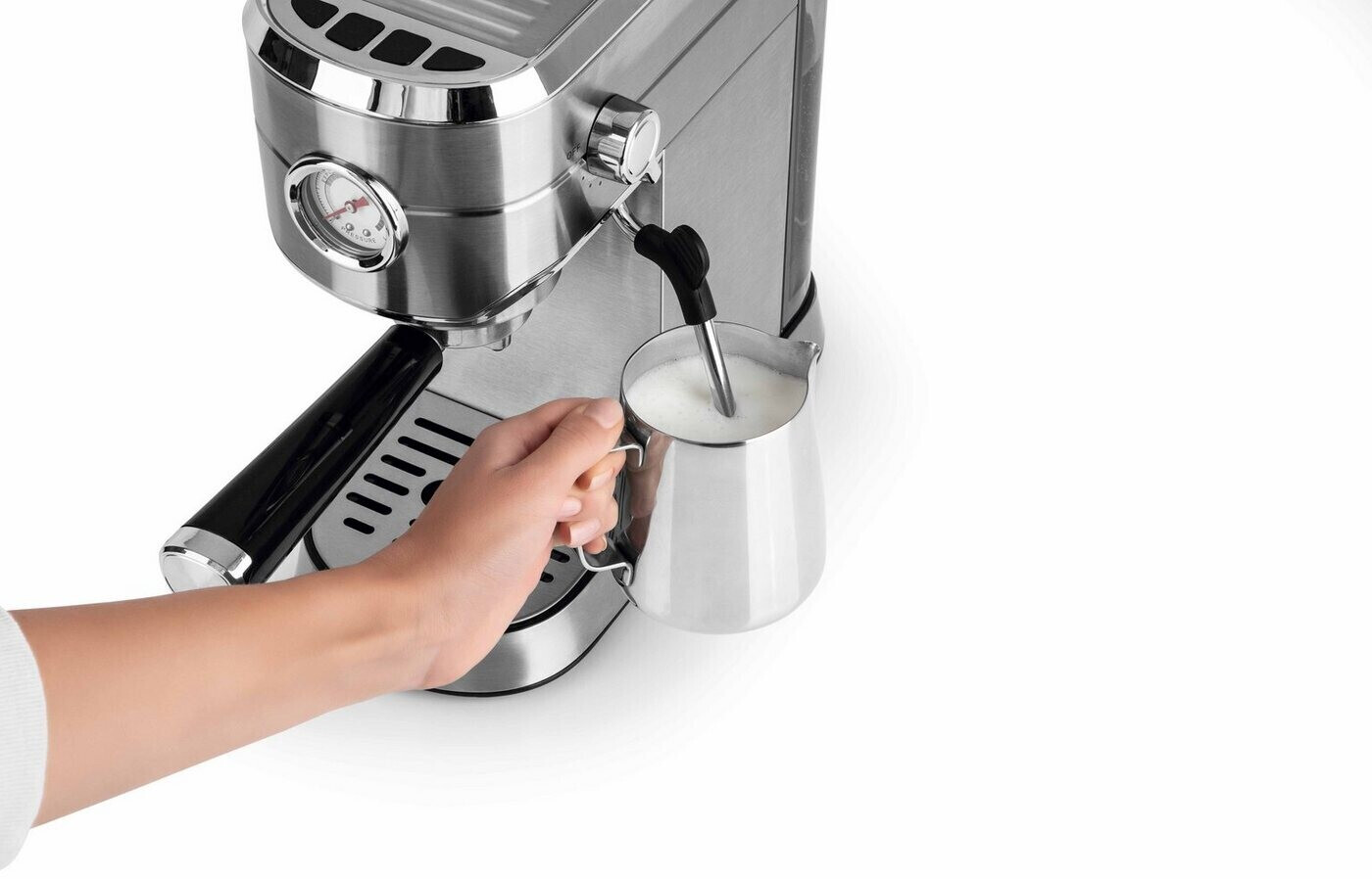 مجهز به نازل بخار قدرتمند برای تهیهی کف شیر غلیظ، و پرتافیلتر حرفهای جهت استفاده از پودر قهوه یا پد (E.S.E)، این دستگاه عملکردی در حد اسپرسو ماشینهای نیمهحرفهای دارد. سیستم گرمایش سریع (Thermoblock) و طراحی استیل ضدزنگ برسخورده، نهتنها ظاهری مدرن و زیبا به دستگاه میبخشد، بلکه دوام بالایی نیز تضمین میکند.