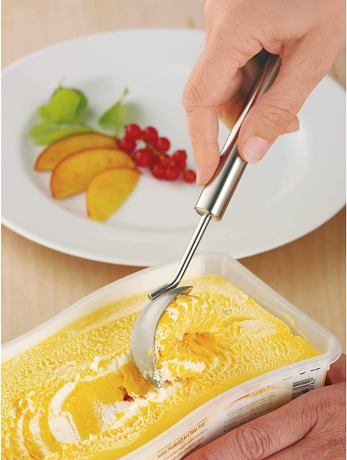 محتویات: ۱ عدد اسکوپ بستنی (طول ۲۱.۵ سانتیمتر، شکل اسکوپ تقریباً ۵ سانتیمتر) - شماره کالا: ۱۸۷۱۴۱۶۰۳۰ جنس: استیل ضد زنگ Cromargan® 18/10، روکش نیمه مات. ضد زنگ، قابل شستشو در ماشین ظرفشویی، دارای ثبات ابعادی، بهداشتی، مقاوم در برابر اسید و عملاً غیر قابل خراب شدن. بستنی را به سرعت و به راحتی از مچ دست جدا کنید - حتی برای بستنیهای خیلی سفت هم مناسب است. هم افراد راست دست و هم چپ دست میتوانند از آن استفاده کنند. این ظرف بستنی همچنین برای سرو کردن برنج، ماست میوهای، خمیر کیک و کلوچه، توپهای خربزه، پوره سیبزمینی یا حتی کوفته قلقلی ایدهآل است. قطعات کاربردی محکم به دسته چسبانده شدهاند. دارای یک روزنه کاربردی برای نگهداری روی ریل آویز با قلاب است.