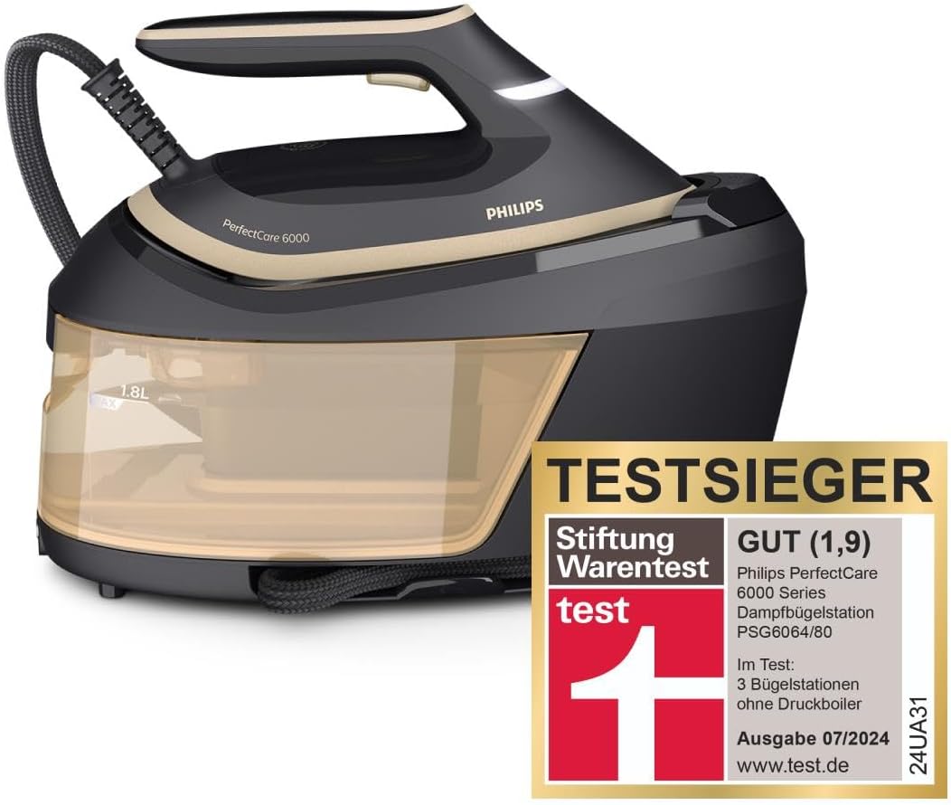 Philips PerfectCare 6000 Dampfbügelstation - 2400 Watt, 600 g Dampfstoß, 8 Bar, OptimalTEMP-Technologie, 1,8 l Wassertank, Schwarz/Gold (PSG6064/80) | قیمت یورویی 184.99€