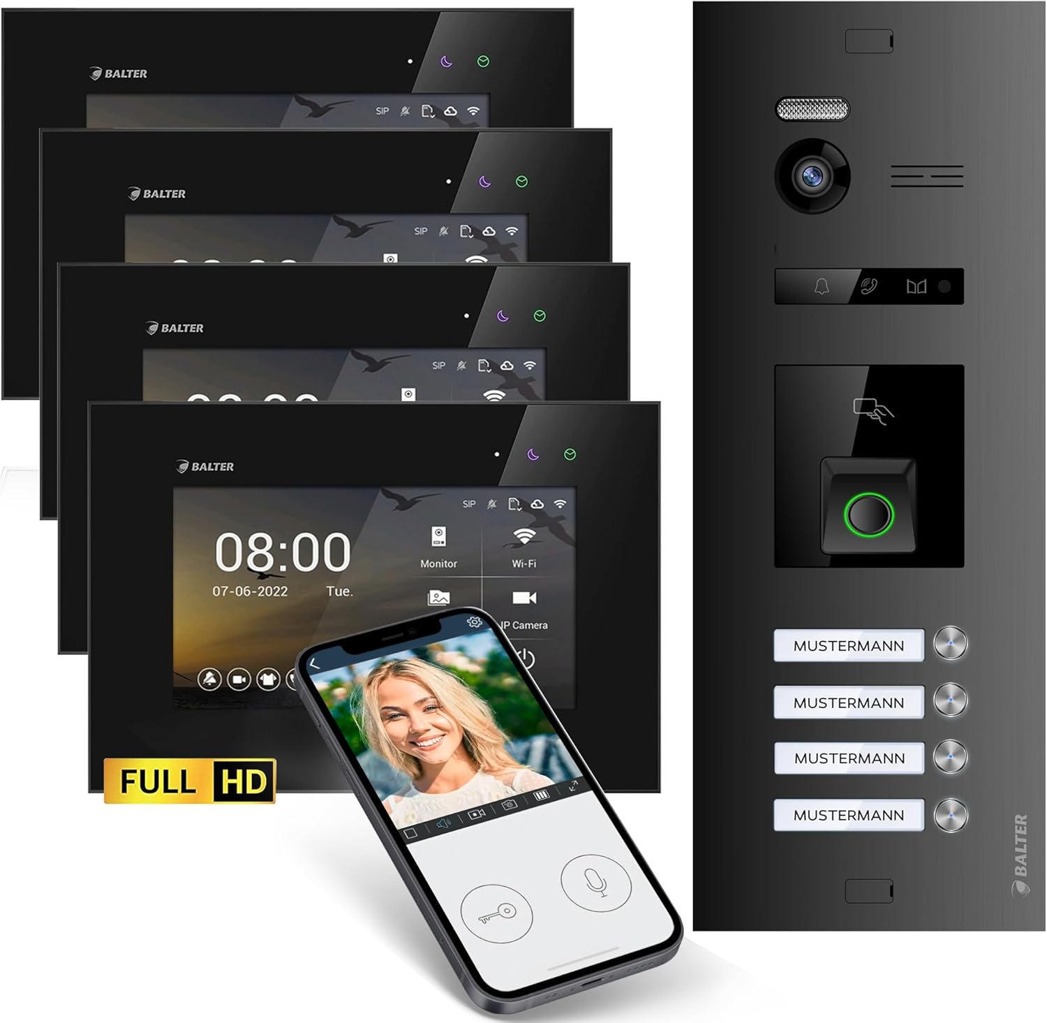 Balter EVO-HD Video Türsprechanlage mit Fingerprint, Video Türklingel, Smartphone App, 4 Familienhaus, 4X 7 Zoll Monitore, Türklingel mit Kamera Full HD, 2 Draht Bus, 175° Weitwinkel, RFID,1080P | قیمت یورویی 2459€