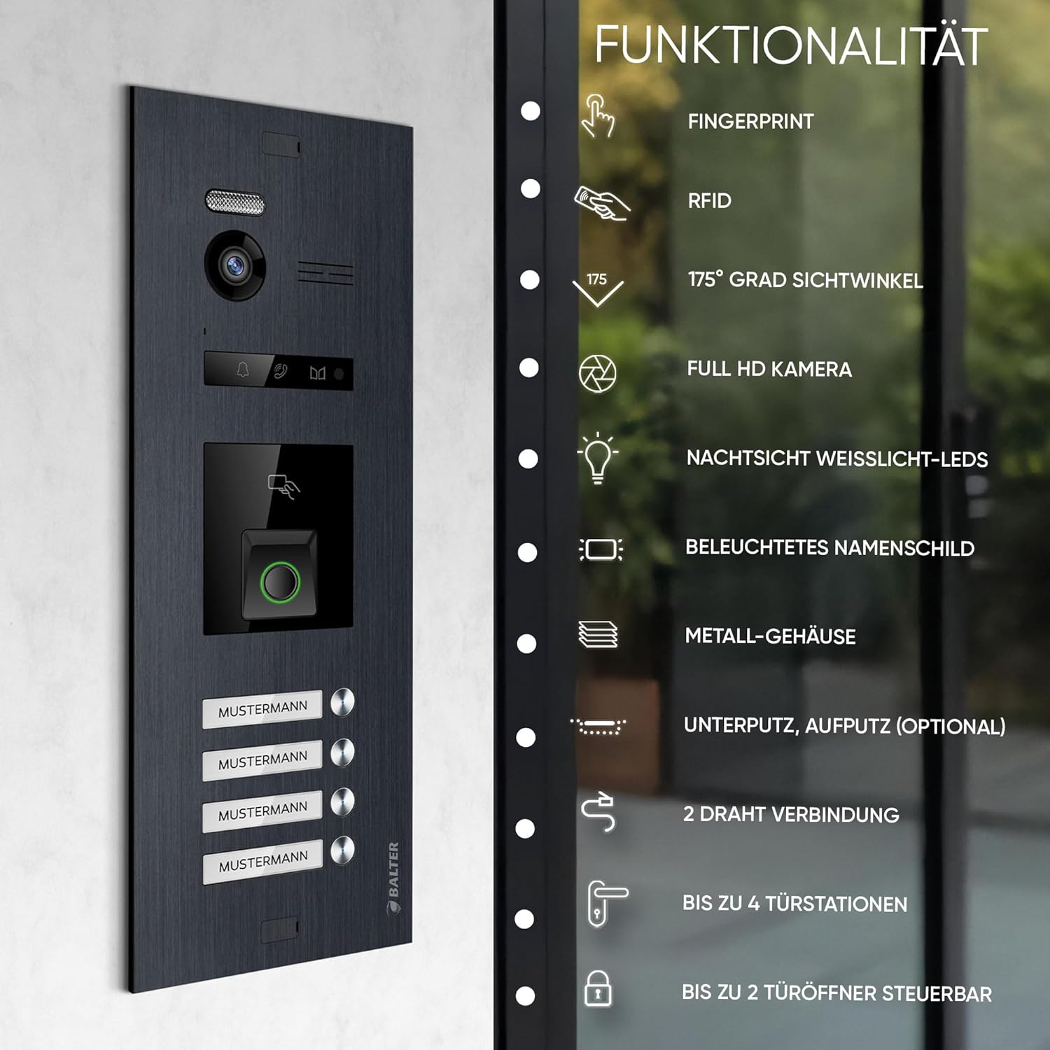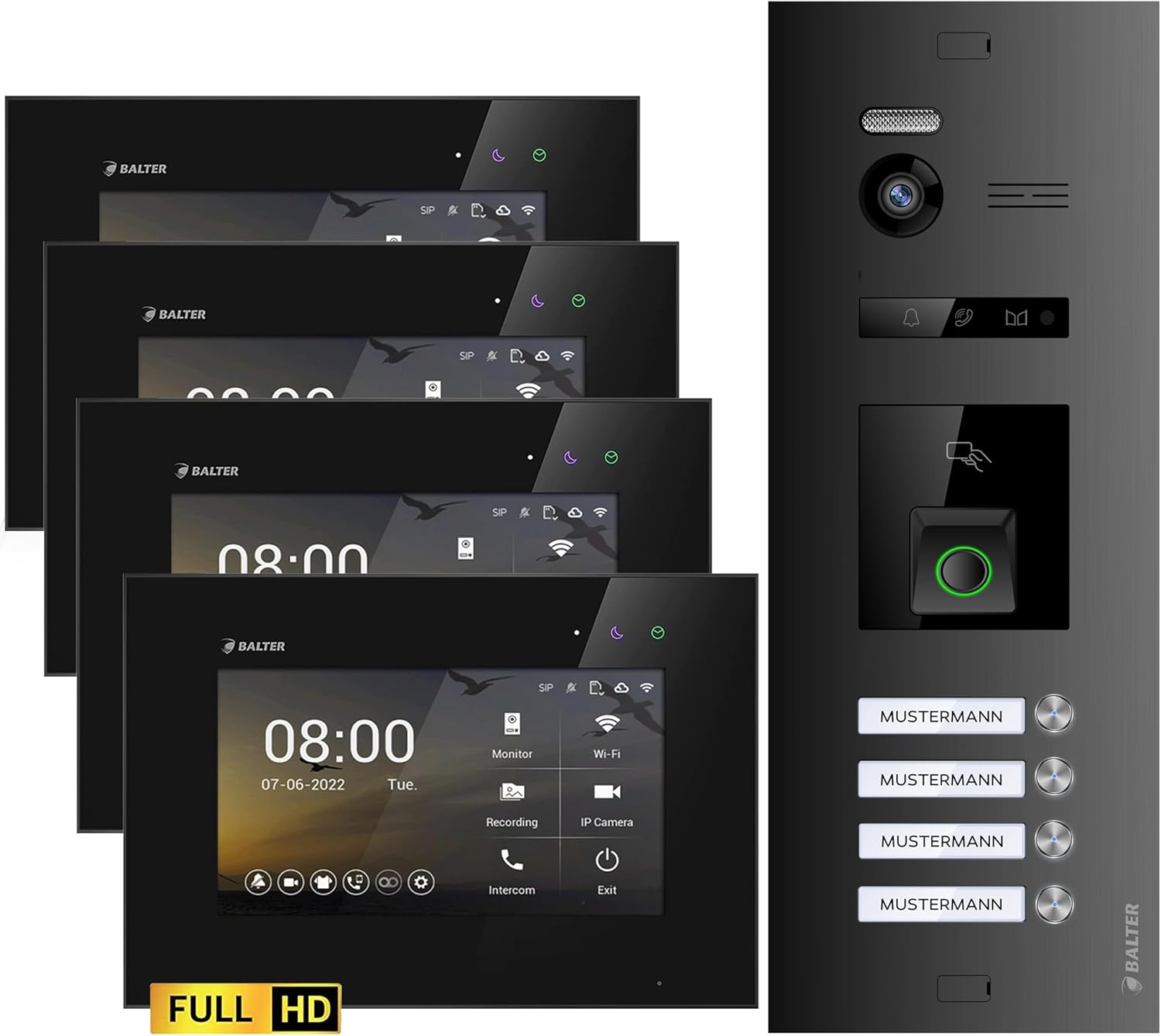 KOMPLETTSET FÜR 4-FAMILIENHAUS: Erleben Sie im Handumdrehen die Sicherheit und den Komfort einer leistungsstarken Full HD Video Türsprechanlage mit Fingerprint mit diesem Komplettpaket für Ihr Vierfamilienhaus. Das EVO HD Set besteht aus vier 7-Zoll HD Monitore mit Touchscreen-Display, einer eleganten Türstation und Stromversorgungsmodul FINGERPRINT UND RFID - Die EVO HD Video Türsprechanlage bietet durch integrierte Fingerprint- und RFID-Module zusätzliche Sicherheit und Komfort. Öffnen Sie Ihre Tür schnell und sicher ohne Schlüssel, einfach mit Ihrem Fingerabdruck oder RFID-Karte. Diese modernen Technologien sorgen für extra Schutz und Bequemlichkeit, ideal für Ihre Türklingel und ein sicheres Zuhause. FULL HD KAMERA - 175° ULTRA-WEITWINKEL: Die kristallklaren und gestochen scharfen Bilder in Full HD Auflösung und der 175° Ultra Weitwinkelobjektiv unserer hochauflösenden Video Türklingel mit Kamera (Full HD) ermöglichen es Ihnen, Besucher in größerer Entfernung zu erkennen, die nicht direkt vor der Kamera stehen. Mit der integrierten Weißlicht-LED Nachtsicht-Funktion haben Sie selbst bei vollständiger Dunkelheit klare und deutliche Sicht auf Ihre Besucher. UMFANGREICHE FUNKTIONEN - Profitieren Sie von dem Komfort der Türöffnung per Fingerprint oder RFID und Kommunikation zwischen den hausinternen Monitoren und Nachbarn. Die automatische Bildspeicherfunktion sorgt dafür, dass Sie bei Abwesenheit nichts verpassen. Sabotageschutz und Türöffnung per Fingerprint oder RFID bieten extra Sicherheit und Komfort für Ihre Klingel Haustür. ✔ SERVICE & SUPPORT AUS DEUTSCHLAND - BALTER ist Ihr zuverlässiger Partner für hochwertige Türsprechanlagen. Mit über 17 Jahren Erfahrung bieten wir eine breite Palette innovativer Video-Türsprechanlagen an. | قیمت یورویی : 1939€