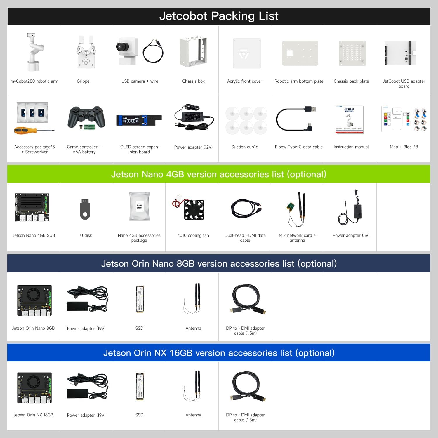 【3 Master Control】Three master controls to choose from, one for educational robotic arms that seamlessly integrates with the Jetson Nano/Orin Nano/Orin NX ecosystem.Build and run Ubuntu 20.04 based on three main controls, making it an ideal development tool for developing robots and programming.Equipped with Jetson Orin Nano 8GB and Jetson Orin NX 16GB, it supports multiple fields such as robot algorithm development and ROS simulation learning.☆Orin NX 16GB version is recommended. 【UR-type mechanical structure】The 7axis collaborative robot developed for user-defined programming has greater flexibility than traditional robotic arms.The smooth body and adaptive gripper have a larger range of motion and can reach more and more precise positioning.Using AI to control its movement and speed, it can achieve millimeter-level positioning and operation.It can work safely with people,is compact, and has many interfaces,making it a collaborative partner on your desktop. 【Programmable&ROS system】Explore the possibilities of RoboFlow,the industrial robot software of elephant robot.Relying on the original Jetson Nano open source ecosystem,Jetcobot provides rich development interfaces, Python driver libraries and built-in ROS environment to make your development easier and faster. It supports multiple programming languages, various software interaction methods and is for a wide range of app. Explore the unlimited potential of this collaborative robot arm. 【AI Vision&Remote Control】Equipped with wooden blocks and stickers,it can realize recognition, tracking, and grasping actions, fully reflecting the AI-Type characteristics of the robot arm. Most functions can be operated through a multi-function app (Android);equipped with a USB game controller remote control to achieve the best control experience;create Jupyter Lab pages online.The APP cannot control the gripper,it is recommended to use a USB controller. 【Tutorials provided】All information and instructions are in English.We provide high-quality technical support services. If you need help, please contact Yahboom.Jetcobot is recommended for individuals with a basic understanding of programming, not for beginners.Considering the threshold of product use,we strongly recommend that you read the instructions carefully before operation.Please pay attention to the power adapters in the list.If you use them interchangeably, they will burn out. | قیمت یورویی : 919€