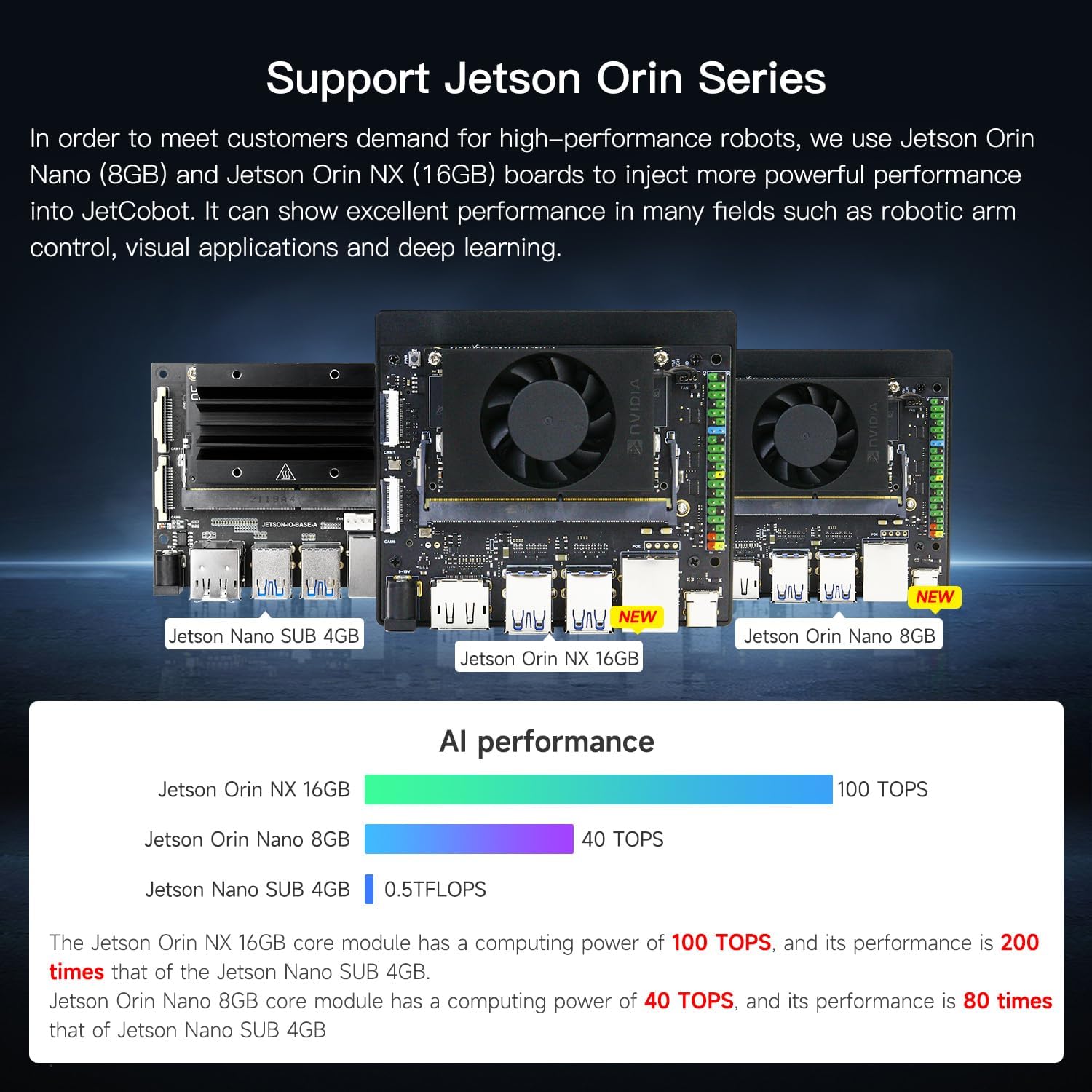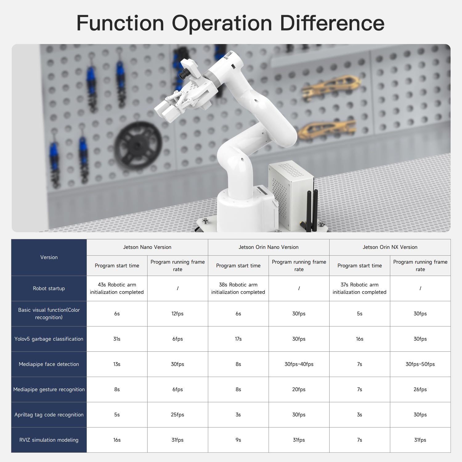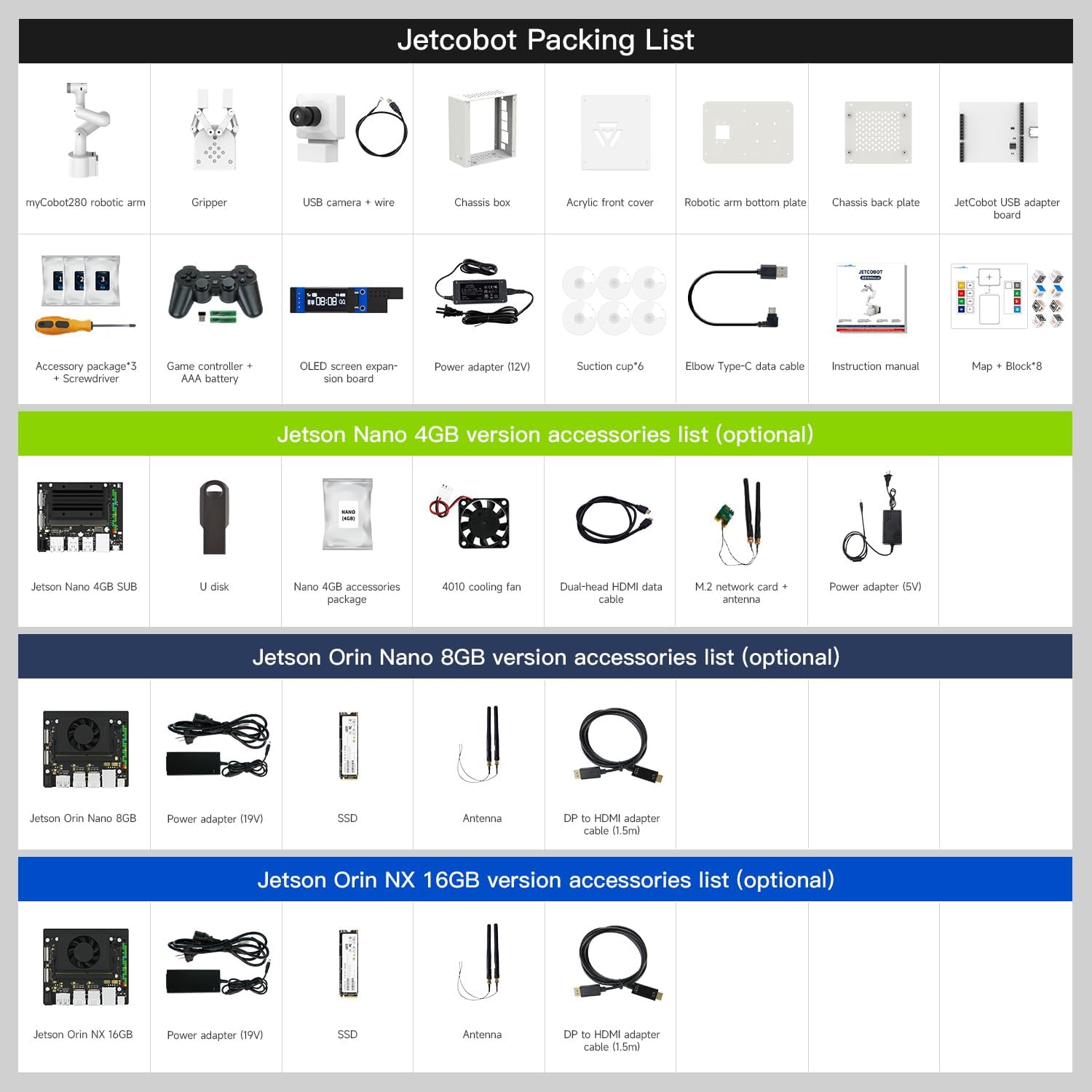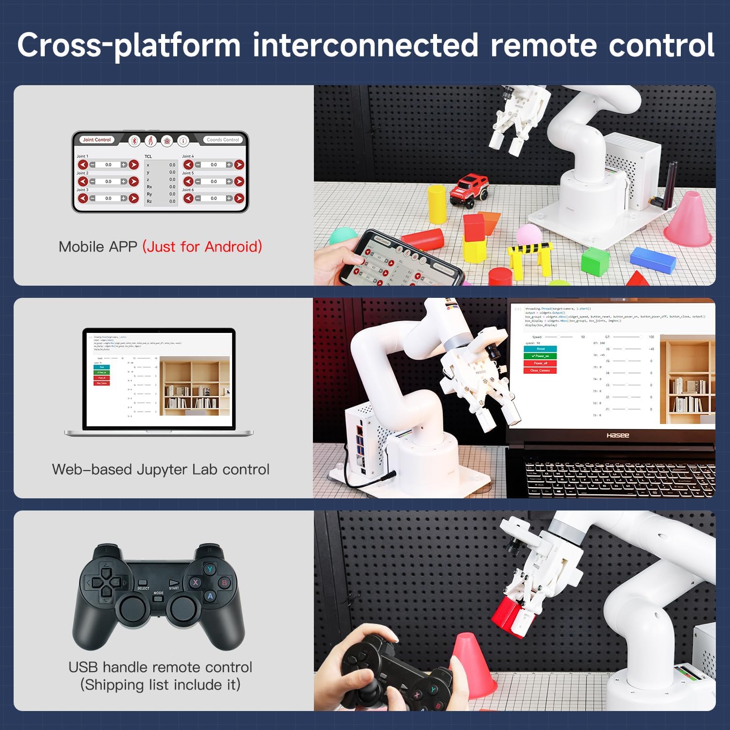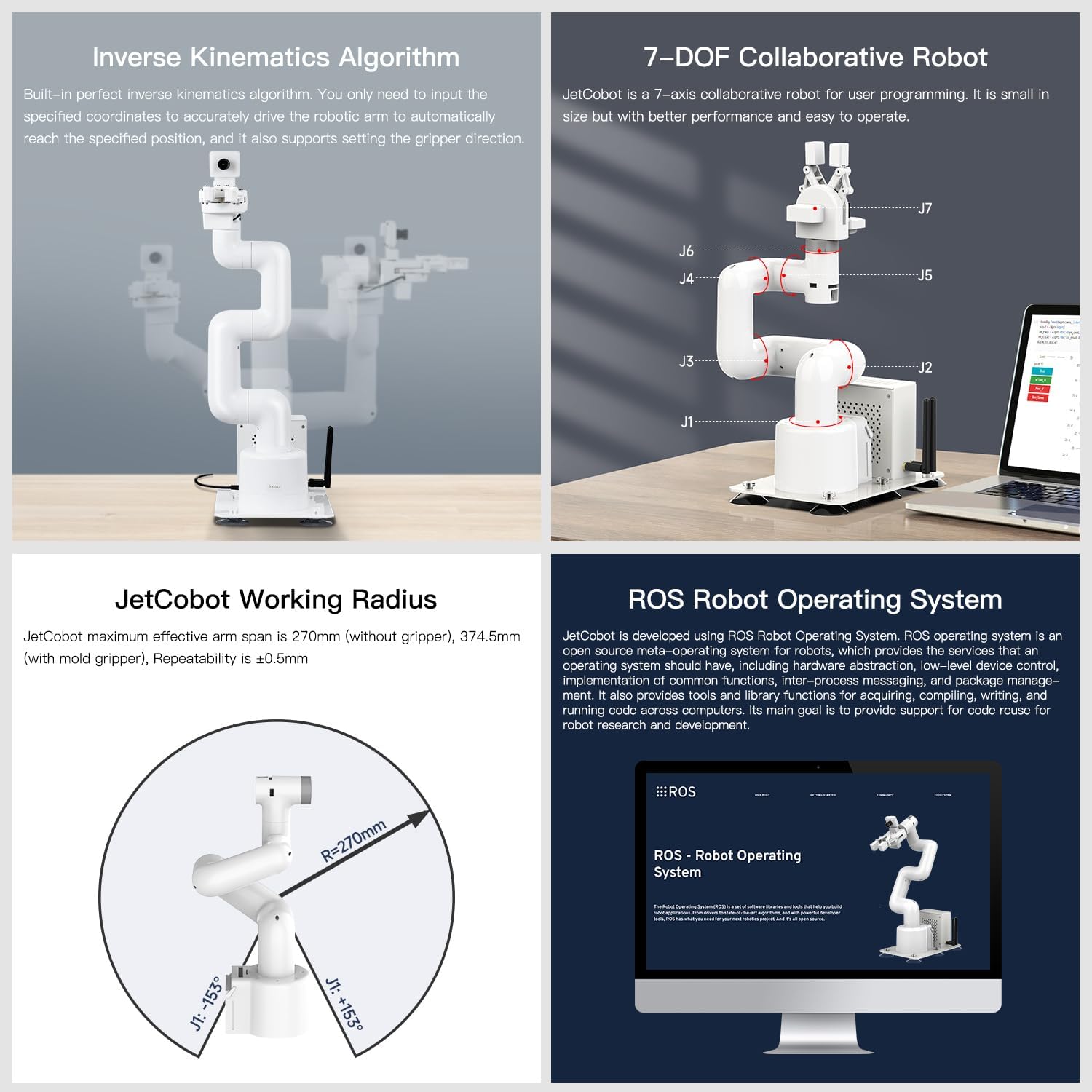 【3 Master Control】Three master controls to choose from, one for educational robotic arms that seamlessly integrates with the Jetson Nano/Orin Nano/Orin NX ecosystem.Build and run Ubuntu 20.04 based on three main controls, making it an ideal development tool for developing robots and programming.Equipped with Jetson Orin Nano 8GB and Jetson Orin NX 16GB, it supports multiple fields such as robot algorithm development and ROS simulation learning.☆Orin NX 16GB version is recommended. 【UR-type mechanical structure】The 7axis collaborative robot developed for user-defined programming has greater flexibility than traditional robotic arms.The smooth body and adaptive gripper have a larger range of motion and can reach more and more precise positioning.Using AI to control its movement and speed, it can achieve millimeter-level positioning and operation.It can work safely with people,is compact, and has many interfaces,making it a collaborative partner on your desktop. 【Programmable&ROS system】Explore the possibilities of RoboFlow,the industrial robot software of elephant robot.Relying on the original Jetson Nano open source ecosystem,Jetcobot provides rich development interfaces, Python driver libraries and built-in ROS environment to make your development easier and faster. It supports multiple programming languages, various software interaction methods and is for a wide range of app. Explore the unlimited potential of this collaborative robot arm. 【AI Vision&Remote Control】Equipped with wooden blocks and stickers,it can realize recognition, tracking, and grasping actions, fully reflecting the AI-Type characteristics of the robot arm. Most functions can be operated through a multi-function app (Android);equipped with a USB game controller remote control to achieve the best control experience;create Jupyter Lab pages online.The APP cannot control the gripper,it is recommended to use a USB controller. 【Tutorials provided】All information and instructions are in English.We provide high-quality technical support services. If you need help, please contact Yahboom.Jetcobot is recommended for individuals with a basic understanding of programming, not for beginners.Considering the threshold of product use,we strongly recommend that you read the instructions carefully before operation.Please pay attention to the power adapters in the list.If you use them interchangeably, they will burn out. | قیمت یورویی : 1925€