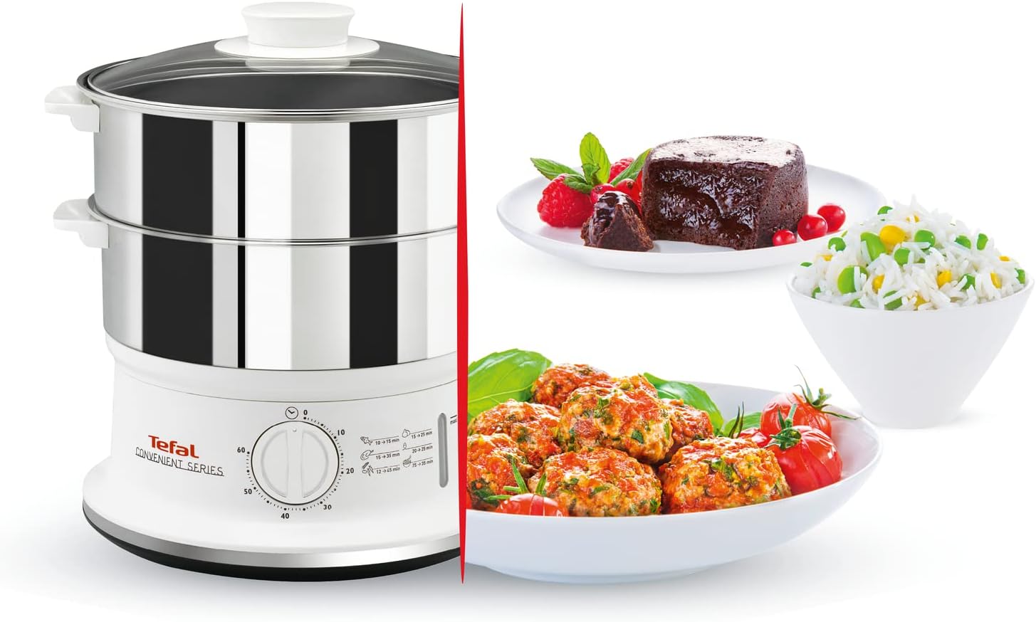 Tefal Dampfgarer VC1451 | 2 Edelstahlbehälter | 6L Fassungsvermögen | 24cm Durchmesser | Timer und automatische Abschaltung | 900W | Weiß CONVENIENT SERIES | قیمت یورویی 62.56€