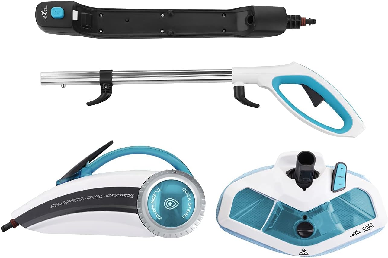 Dampfreiniger mit 30 Sekunden aufheizzeit und 1500 W Leistung. 2 in 1 ! Leistunsstarker Dampfreiniger und Handdampfreiniger in einem Gerät. Mit dem umfangreichen Zubehör können Sie nicht nur verschiedene Böden reinigen, sondern auch Bäder, Waschbecken, Fugen, sowie Autoinnenräume und Räder reinigen. Der heiße Dampf tötet außerdem bis zu 99 % der Bakterien ab und desinfiziert effektiv alle Oberflächen. Der Dampfreiniger schafft schnell, einfach und ohne Reinigungsmittel eine hygienisch saubere Umgebung in Ihrer Wohnung. Mit einem 400-ml-Wassertank bietet der ETA Azurit eine Dampfdauer von bis zu 15 Minuten. Als ob dies nicht genug wäre. Dank des abnehmbaren Wassertanks können Sie das Wasser jederzeit problemlos nachfüllen. | قیمت یورویی : 96.24€