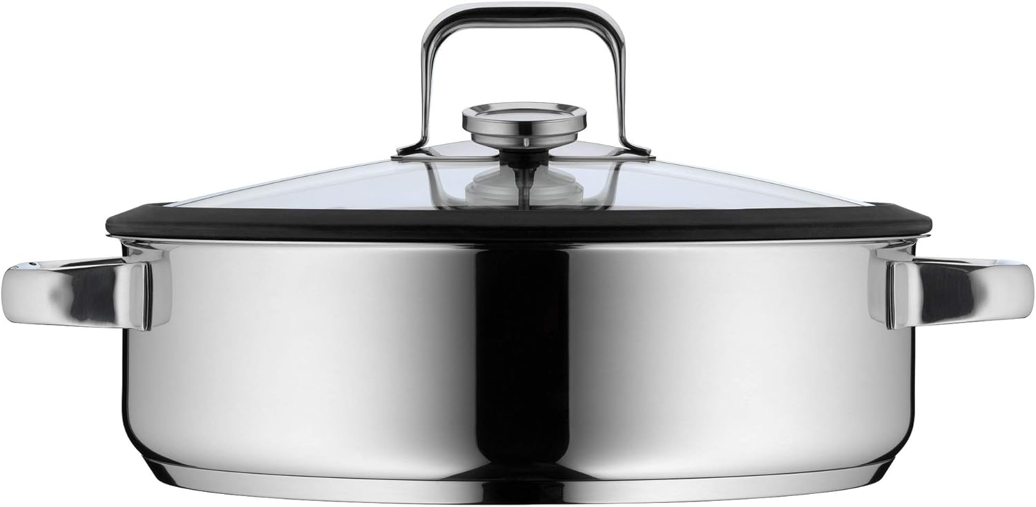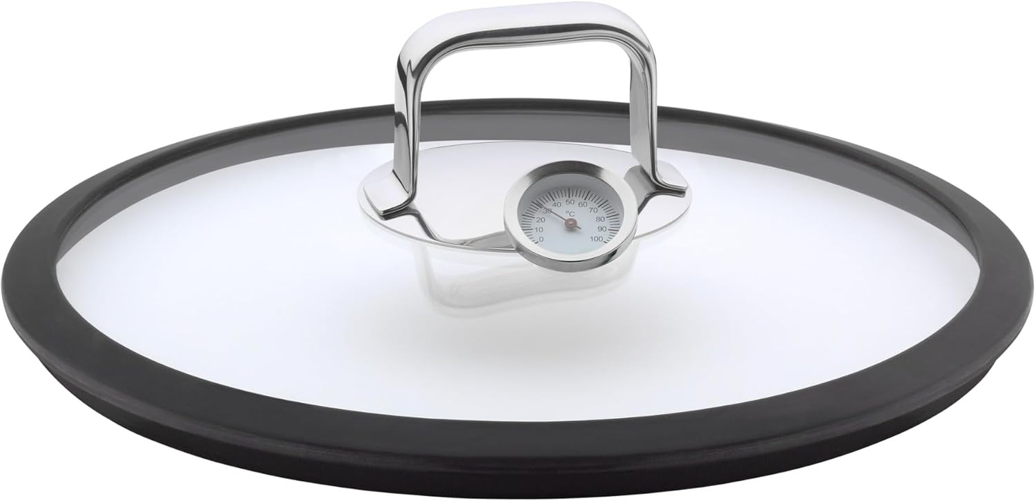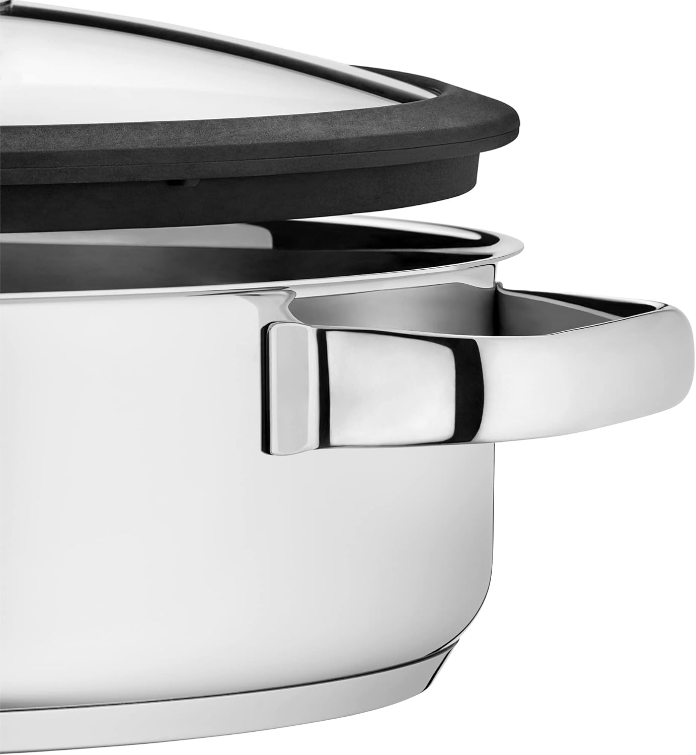 Inhalt: 1x Schmortopf/ Bräter (Ø 28 cm, Volumen 5,0l, Höhe 7,8 cm), 1x Garblech (Ø 24 x 5 cm), 1x Einsatz-Steg, 1x Glasdeckel mit Silikondichtung mit herausnehmbaren Thermometer - Artikelnummer: 1743016040 Material: Cromargan Edelstahl Rostfrei 18/10, Glas, Silikonlippe - spülmaschinengeeignet, hitzebeständig und backofengeeignet bis 250°C. Der Deckel ist (ohne Thermometer) backofenfest bis 180°C Für alle Herdarten geeignet: Glaskeramik-, Gas-, Elektro- und Induktions-Herde. Die Bodenkonstruktion (TransTherm-Allherdboden) sorgt für gleichmäßige Wärmeverteilung und lange Wärmespeicherung für energiesparendes Kochen Multifunktional in der Küche: eignet sich zum Garen, Dampfgaren, Kochen, Braten auf dem Herd oder Schmoren im Backofen Für variantenreiches Kochen: mit Einsatz ideal für gesundes Dampfgaren von Gemüse oder Fisch und ohne Einsatz als Bräter für den deftigen Braten | قیمت یورویی : 89.27€
