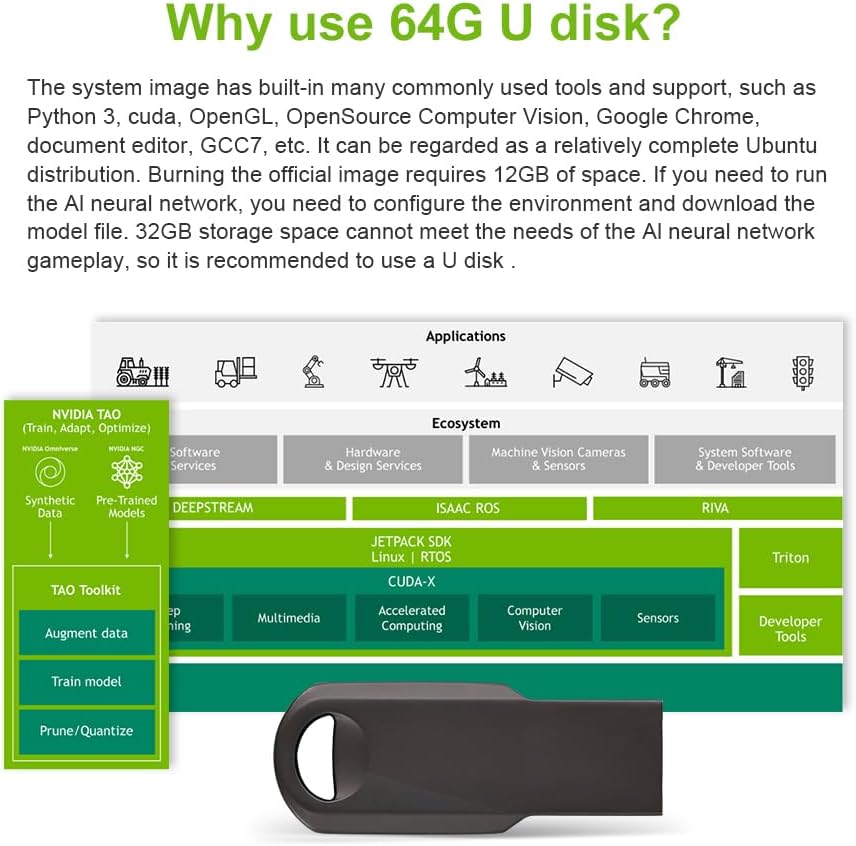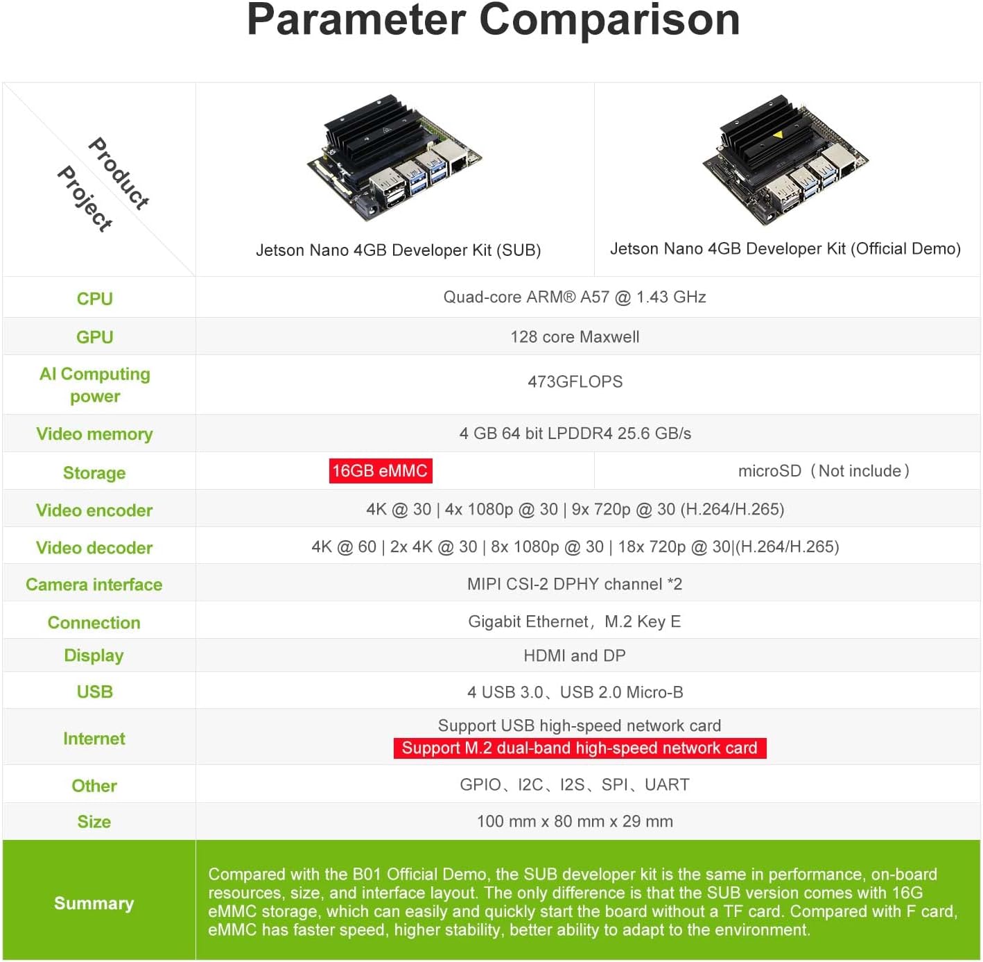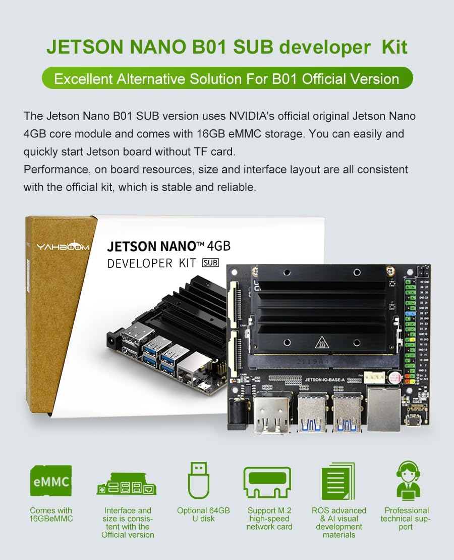 Jetson Nano SUB Core Parameters; GPU: 128-Core Maxwell ★AI Computing Power: 473GFLOPS ★CPU: Quad-Core ARMA57 @1,43 GHz ★ Netzwerk: Unterstützt High-Speed-USB-Netzwerkkarte, Unterstützung M.2 Dual-Band High-Speed-Netzwerkkarte ★Speicher: Unterstützt 16 GB eMMC (SUHinweise: B Motherboard Door Es gibt keinen SD-Kartensteckplatz) Leistungsstarke Schnittstellen: Vier USB 3.2 Gen 1 High-Speed-Schnittstellen können auf mehr und mehrere Peripheriegeräte zugreifen, USB3.2Gen 1 High-Speed-Übertragung; unterstützt 2 CSI Kameras oder 1 binokular Kamera, sehr geeignet für die Verwendung von Parallax Algorithm Ranging für Face-Recognithm ion, live body detektor ection, VR vision recording and other applications; supports DisplayPort interface and HDMI high-definition interface. 【Comparison between】Both have the same motherboard performance, onboard resources, size, and interface layout. The only difference is that the SUB version comes with 16GB eMMC storage, and you can easily and quickly start the motherboard without a TF card. Compared with TF cards, eMMC is faster, more stable, and more capable of adapting to the environment, and is more in line with the system environment construction of current edge devices. 【Packaging List】★Erweiterungsset: Jetson Nano 4GB Kit*1, Power Adapter * 1, Acrylic Shell * 1, 64GB USB Flash Drive * 1, Cooling Fan*1, DP to HDMI Cable*1, LAN Cable*1; ★Wifi Advanced Kit: Expansion Kit + IMX219-77° Camera *1, Camera Housing*1. 1, M.2 Drahtlose Netzwerkkarte * 1; Mini-Computer-Kit: Erweiterung des Sets, Acryl-Gehäuse + Mini-Jetson Mini-Gehäuse + USB-Kamera + kabellose Netzwerkkarte; Flagship-Set: Mini-Computer + 10,1 Zoll Display + kabellose Tastatur und Maus Set. 【Breite Anwendung】Dieses Produkt ist geeignet für KI-Roboter, Drohnenverarbeitung, Stadtkennung, medizinische Datenverarbeitung, Roboter-Dogs und andere Felder. Yahboom has a strong after-sales technical support team, providing Ubuntu 18.04 system and AI vision and ROS development materials. Bietet relevante Informationen. | قیمت یورویی : 262€