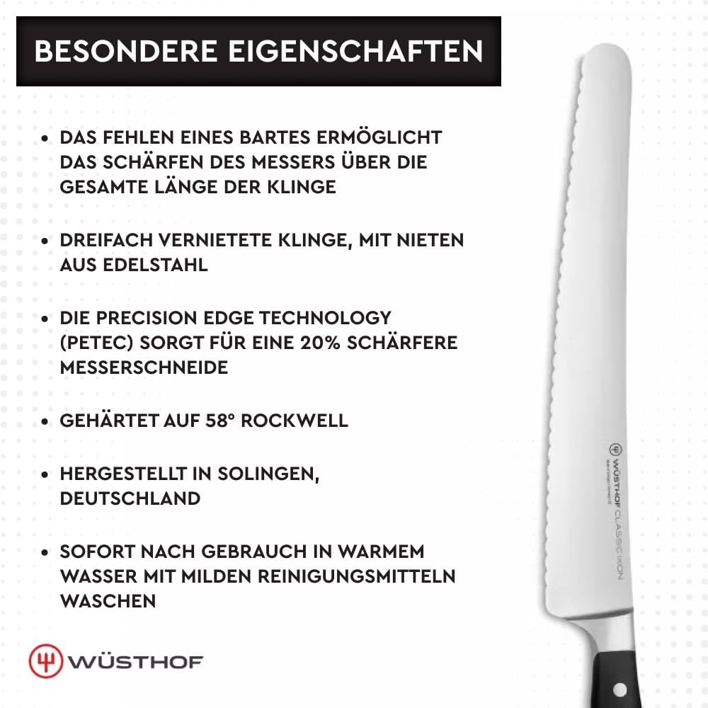 Als elegante Profi-Messer aus Solingen beeindrucken die Wüsthof Messer der Classic Ikon Serie selbst anspruchsvolle Perfektionisten. So ist auch dieses sehr scharfe Wellenschliff-Messer ein kompromisslos gutes Küchenmesser mit zeitlosem Design Mit der nach außen geformten Welle an der langen 26cm Klinge gelingen mühelos feine Schnittbilder – ideales Allzweckmesser für glatte Schnitte durch Torten, Brote, Sandwiches (z.B. in der Gastronomie), große Früchte, Gemüse oder als Tranchiermesser Der scharfe Spezialwellenschliff sorgt für präzise Schnitte und beeindruckt mit langer Schnitthaltigkeit. Die widerstandfähige Klinge (58° Rockwell-Härte) des Kochmesser Profi Messer erhält in Handarbeit den finalen Polierabzug, also ihre extreme Schärfe Ergonomischer Griff – durch die kleine Wölbung im vorderen Bereich liegt das ultrascharfe Schneidemesser besonders sicher in der Hand. Die pflegeleichten Griffschalen sind mit Edelstahl-Nieten fugenlos vernietet und sehen in jeder Küche sehr gut aus Als ideal ausbalanciertes Kochmesser beeindruckt Wüsthof Classic Ikon jeden Profi-Koch und ist dank der scharfen Messerklinge das offizielle Kochwerkzeug der deutschen Nationalmannschaft der Köche. Premiummesser – Made in Germany, geschmiedet in Solingen | قیمت یورویی : 151.25€