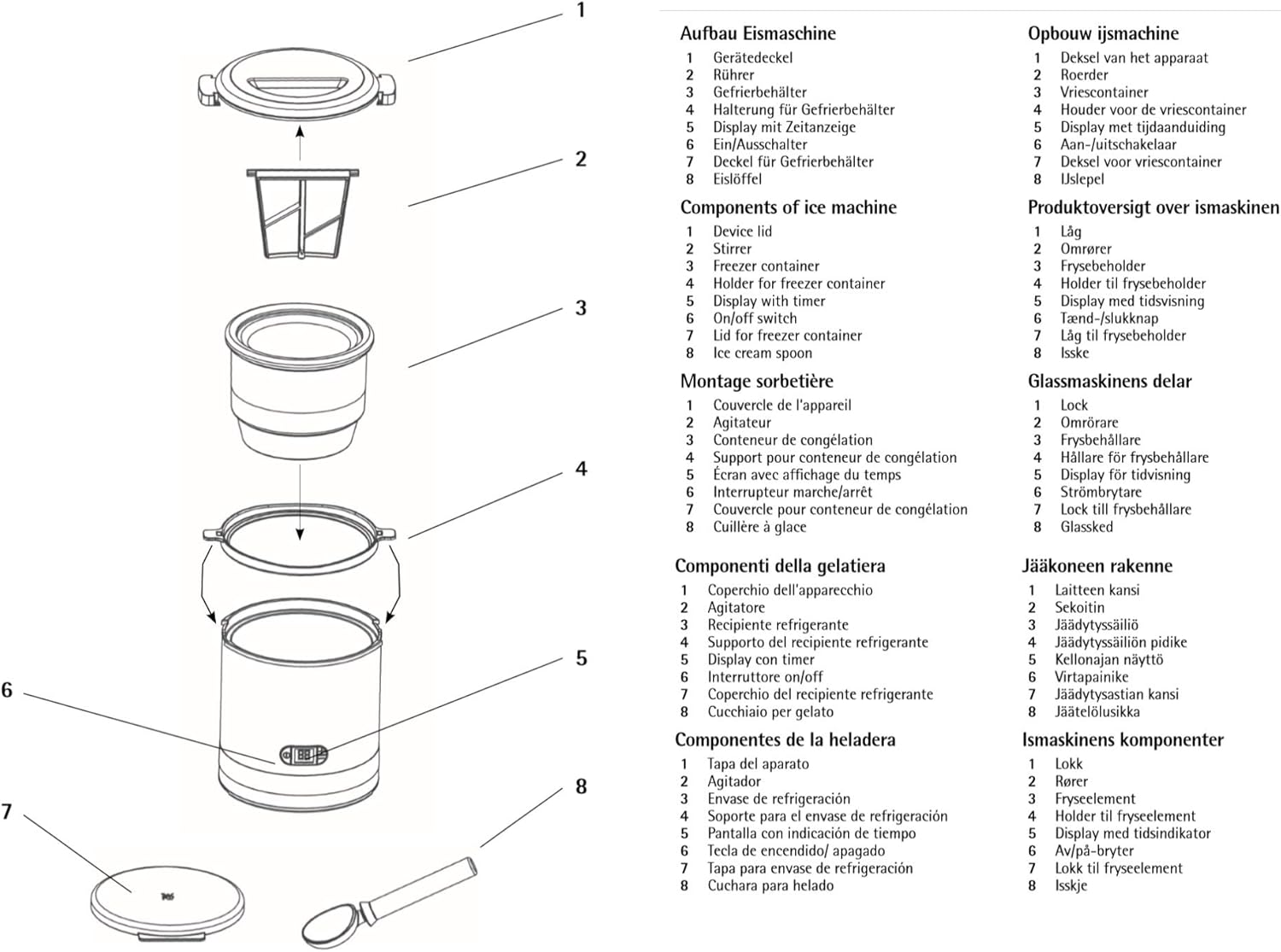 WMF Küchenminis 3in1 Eismaschine, für Frozen Joghurt, Sorbet und Eiscreme, Gefrierbehälter 300 ml, Eisportionierer, 30-Minuten-Time, spülmaschinengeeignete Teile, Ice Cream Maker لینک آمازون : https://www.amazon.de/dp/B01IVDWIVG?th=1&psc=1 محتویات: ۱ عدد دستگاه بستنیساز (۱۸ × ۱۶ × ۱۹.۵ سانتیمتر، ۱۲ وات، کابل ۰.۸ متر)، ظرف فریزر با درب (۱۴.۵ × ۱۱.۵ سانتیمتر، ۳۰۰ میلیلیتر - در هر محفظه فریزر استانداردی جا میشود)، اسکوپ بستنی، شامل دستور پخت - شماره کالا: ۰۴۱۶۴۵۰۰۱۱ به لطف عملکرد ۳ در ۱، این بستنیساز کمحجم میتواند به عنوان بستنیساز (مثلاً بستنی نرم)، بستنیساز سوربت و همچنین به عنوان ظرف یخ مکعبی ایدهآل استفاده شود. ظرف خالی و سرد شده فریزر را (حداقل ۱۲ ساعت قبل از استفاده، در دمای تقریباً -۱۸ درجه سانتیگراد) داخل بستنی ساز قرار دهید، دستگاه را روشن کنید و سپس مخلوط بستنی را داخل آن بریزید. تایمر به شما این امکان را میدهد که به راحتی بستنی مورد علاقه خود را در حین انجام کارهای دیگر درست کنید. زمان آمادهسازی را میتوان از ۱ تا ۳۰ دقیقه تنظیم کرد. تمیز کردن آسان، زیرا درب ظرف فریزر، همزن و نگهدارنده ظرف فریزر را میتوان در ماشین ظرفشویی تمیز کرد.