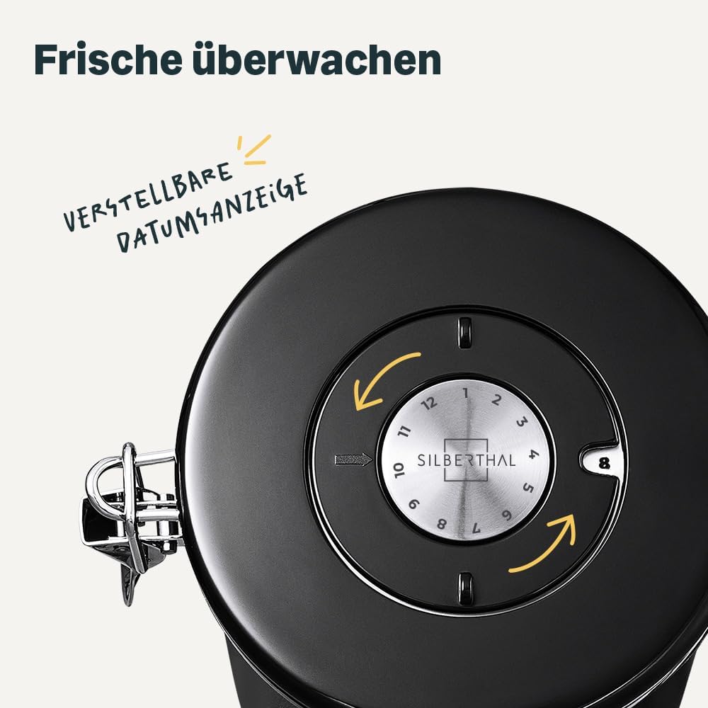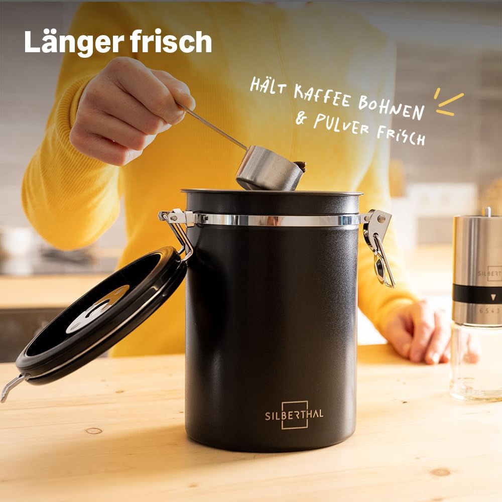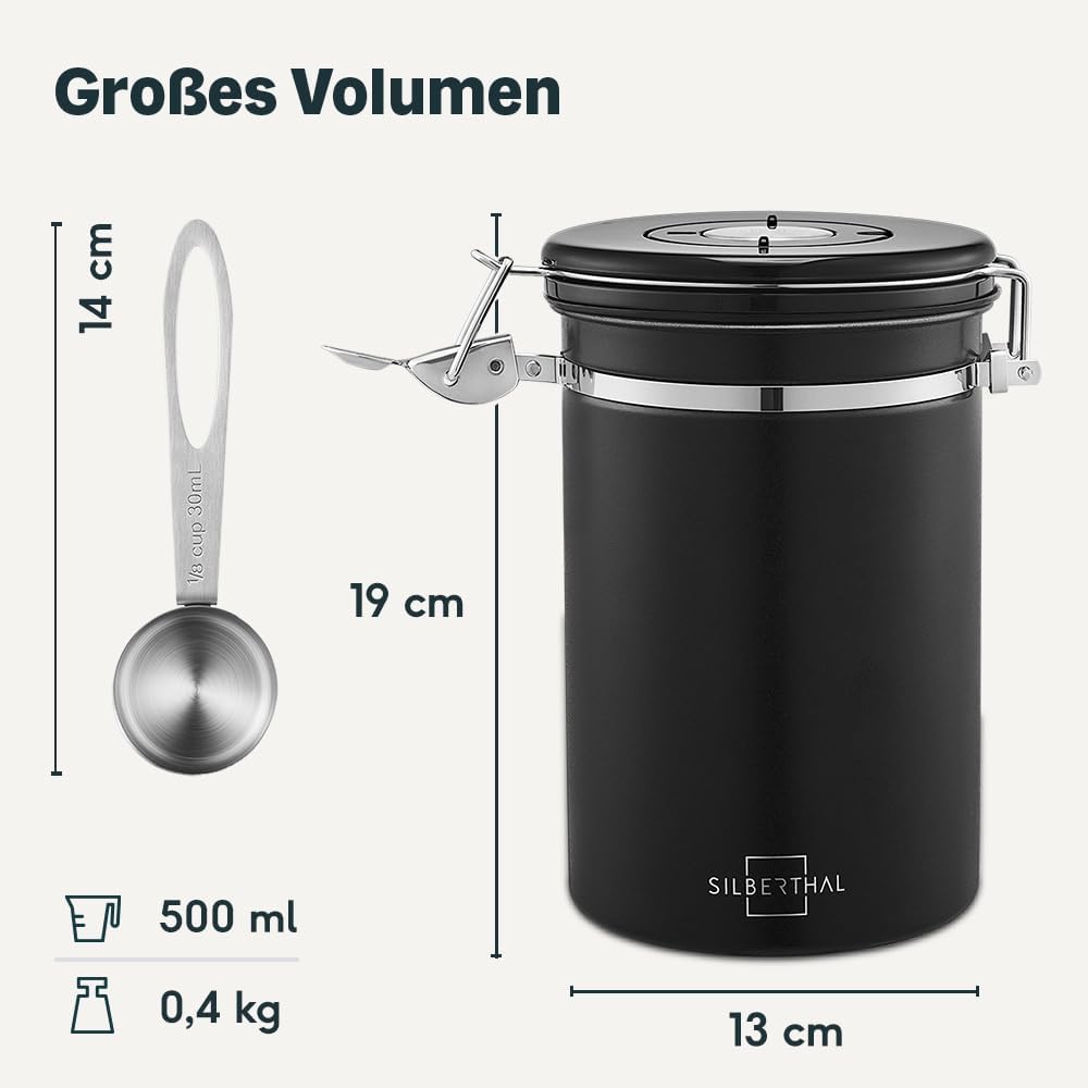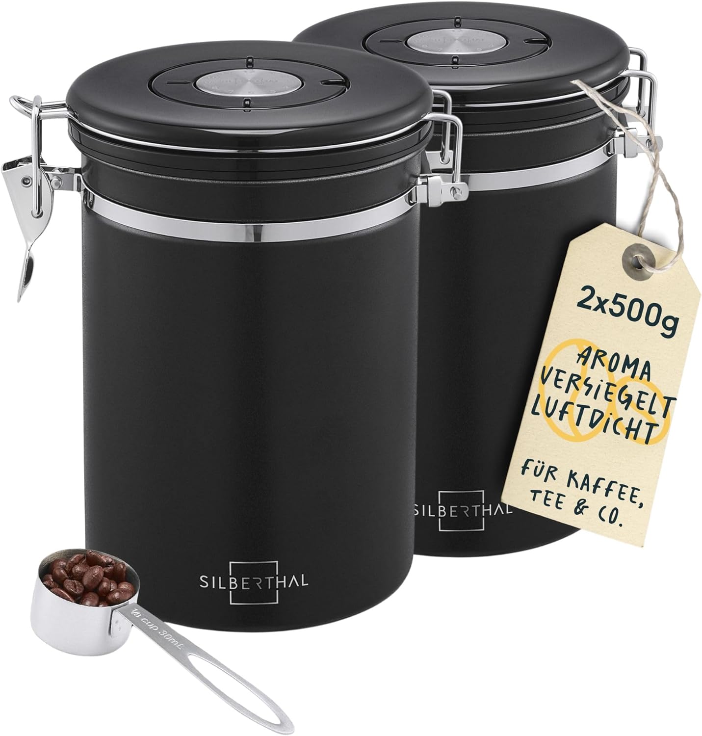 SILBERTHAL Kaffeedose 2er Set luftdicht 500g - Aromadichte Aufbewahrungsdose für Bohnen & Pulver - Inkl. CO2-Ventil & Dosierlöffel - Schwarz 2 x 500g | قیمت یورویی 46.39€