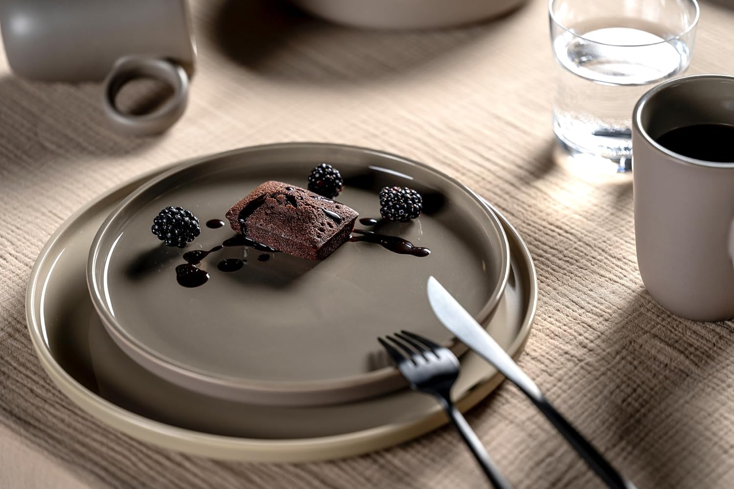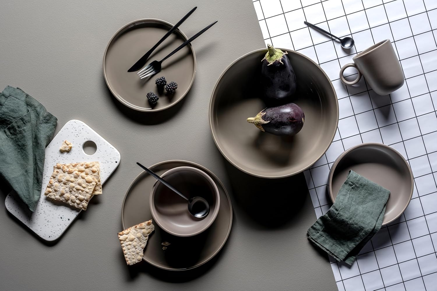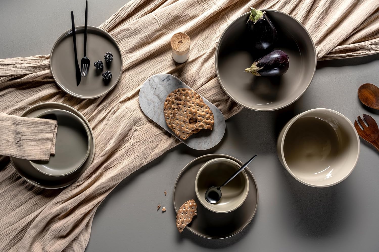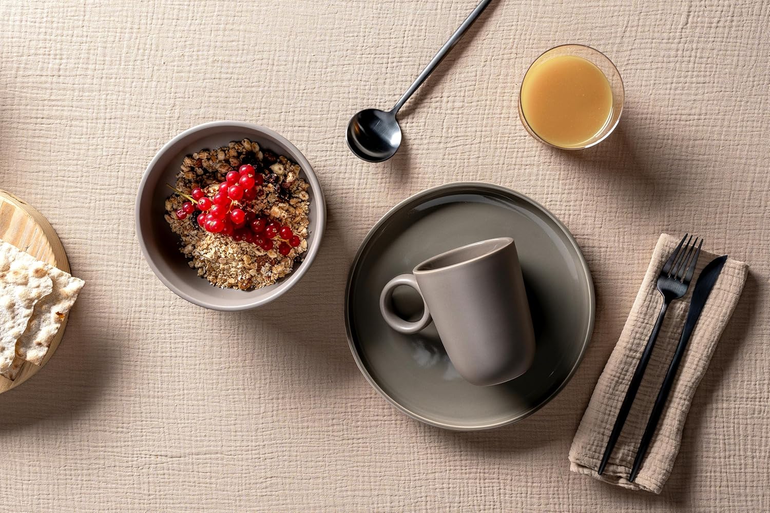 LEONARDO HOME Speiseteller ROMA 6er Set • Ø 22 cm • Mikrowellen- & Spülmaschinengeeignet • stapelbar • Keramik Geschirr für 6 Personen • Steingut-Teller mit glasierter Oberfläche • taupe • 027921 لینک آمازون : https://www.amazon.de/dp/B0F32JP42F?th=1&psc=1 کاربردی: به طور طبیعی مناسب برای ماشین ظرفشویی و مایکروویو - بشقابهای صبحانه به راحتی روی هم چیده میشوند و برای استفاده روزمره ایدهآل هستند. طراحی مدرن: شکل و رنگ سری ROMA زیبا، غیررسمی و ساده به نظر میرسد و تصویری هماهنگ را در هر چیدمان میز تضمین میکند. ترکیب رنگ به عنوان یک عنصر برجسته: محصولات سری روما را با یکدیگر یا با کاسههای آلوئو یا لیوانهای نوشیدنی باندا نرا ترکیب کنید - به این ترتیب یک چیدمان میز زیبا و تمیز خواهید داشت. مجموعه کاربردی: این مجموعه شامل شش بشقاب سرامیکی کاربردی است - کاسهها و لیوانهای همان سری (روما) افزودنیهای ایدهآلی هستند - مناسب برای سرو صبحانه، کیک یا پیشغذا دامنه تحویل و ابعاد: ۶ بشقاب غذاخوری، رنگ خاکستری مایل به قهوهای، ابعاد هر بشقاب: قطر ۲۲ سانتیمتر، ارتفاع لبه بشقاب ۲.۳ سانتیمتر، وزن ۶۲۰ گرم