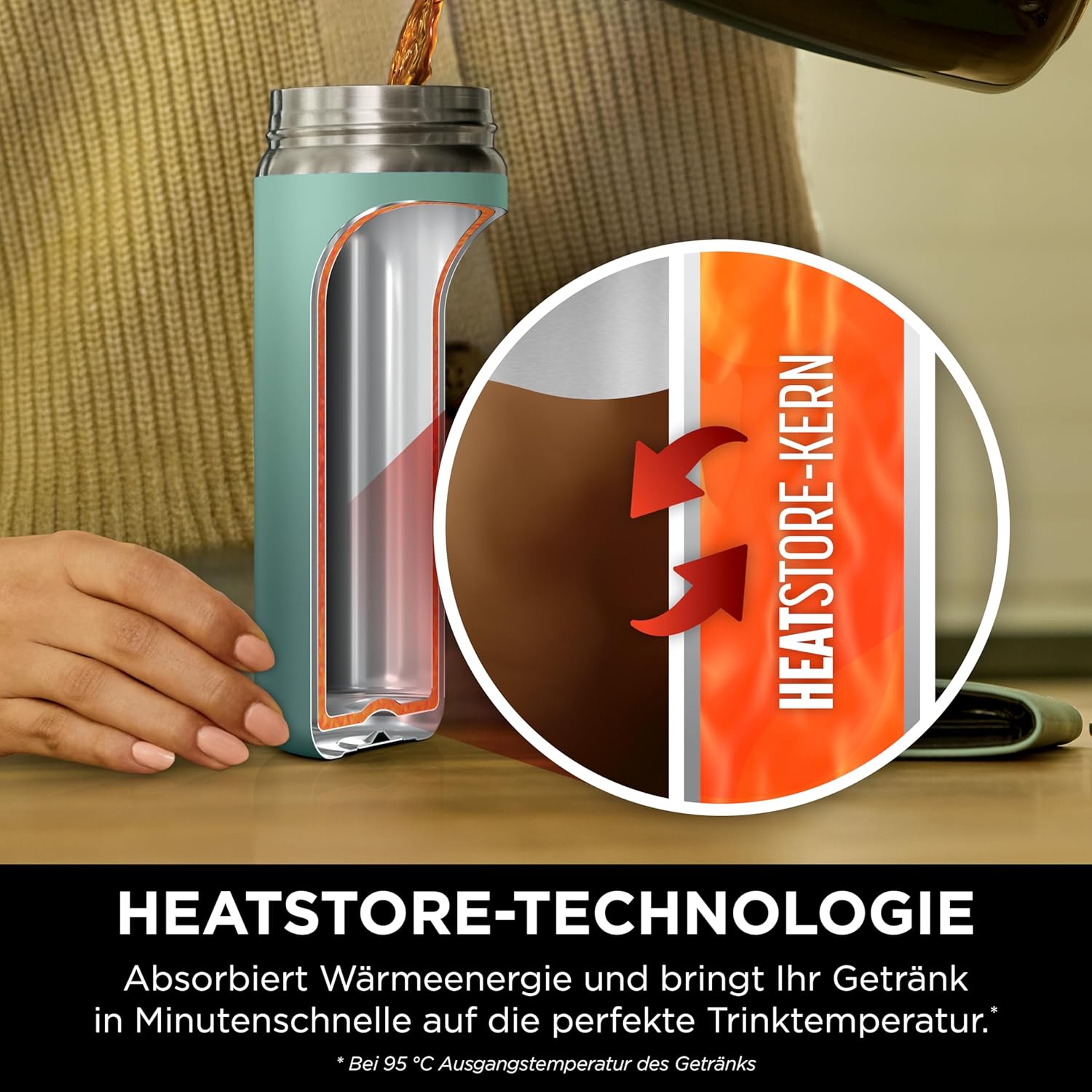 HEATSTORE-Technologie: Absorbiert die Wärme und bringt heiße Getränke in wenigen Minuten* auf die perfekte Trinktemperatur und hält diese über Stunden konstant (*Anfängliche Getränketemperatur 95 °C) AUSLAUFSICHERER DECKEL: Die LockLeak-Technologie verfügt über einen Verschlussmechanismus, der verhindert, dass Getränke verschüttet werden oder auslaufen – auch unterwegs oder in der Tasche THERMOSFLASCHE: Die Flasche fühlt sich auch dann kühl an, wenn sie mit heißen Flüssigkeiten gefüllt ist SPÜLMASCHINENFEST: Die leicht zu reinigende Flasche ist spülmaschinenfest und kann per Hand in warmem Seifenwasser gewaschen werden. Für eine gründliche Reinigung können Sie die Dichtungen vom Deckel entfernen ABMESSUNGEN: H: 22 cm x B: 7,7 cm x T: 7,7 cm. Gewicht: 530 g. Kapazität: 400 ml. Farbe: Grün. 5 Jahre Garantie – limitierte Garantie gegen Herstellerfehler. Nach Registrierung bei Ninja | قیمت یورویی : 30.25€