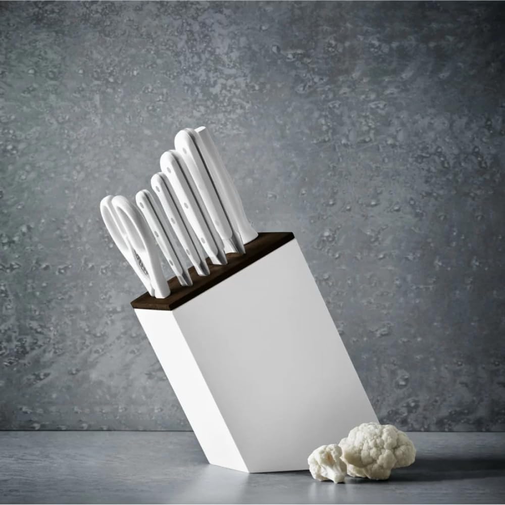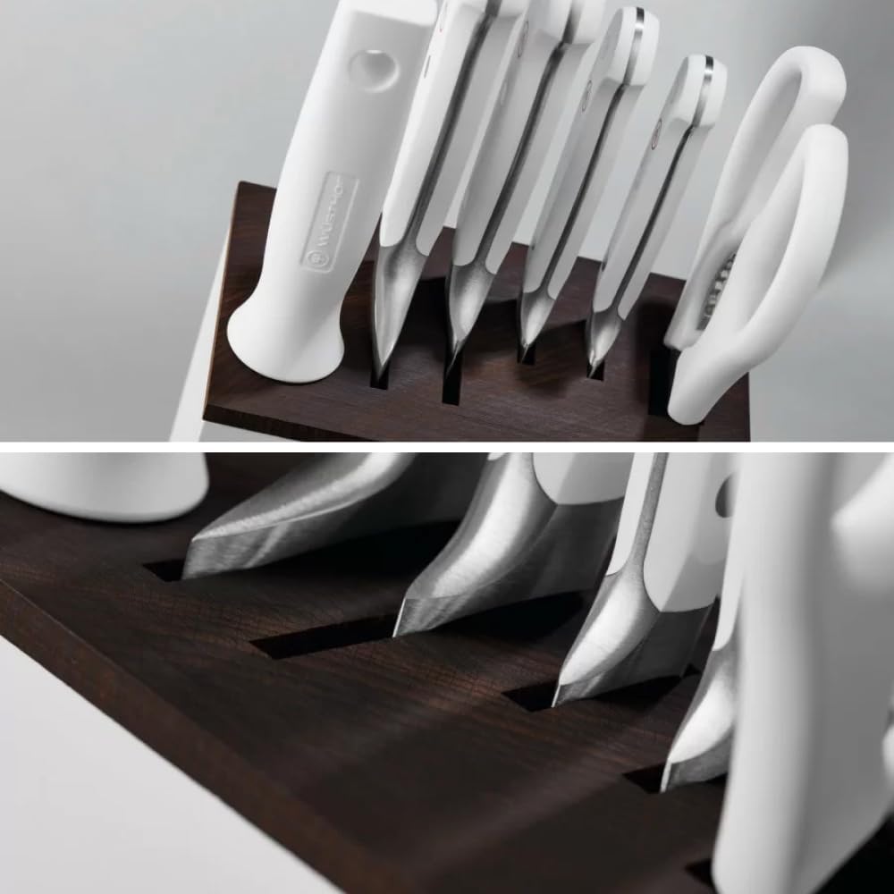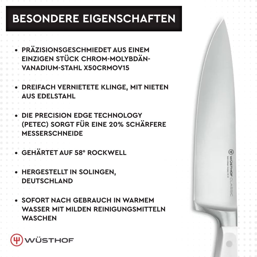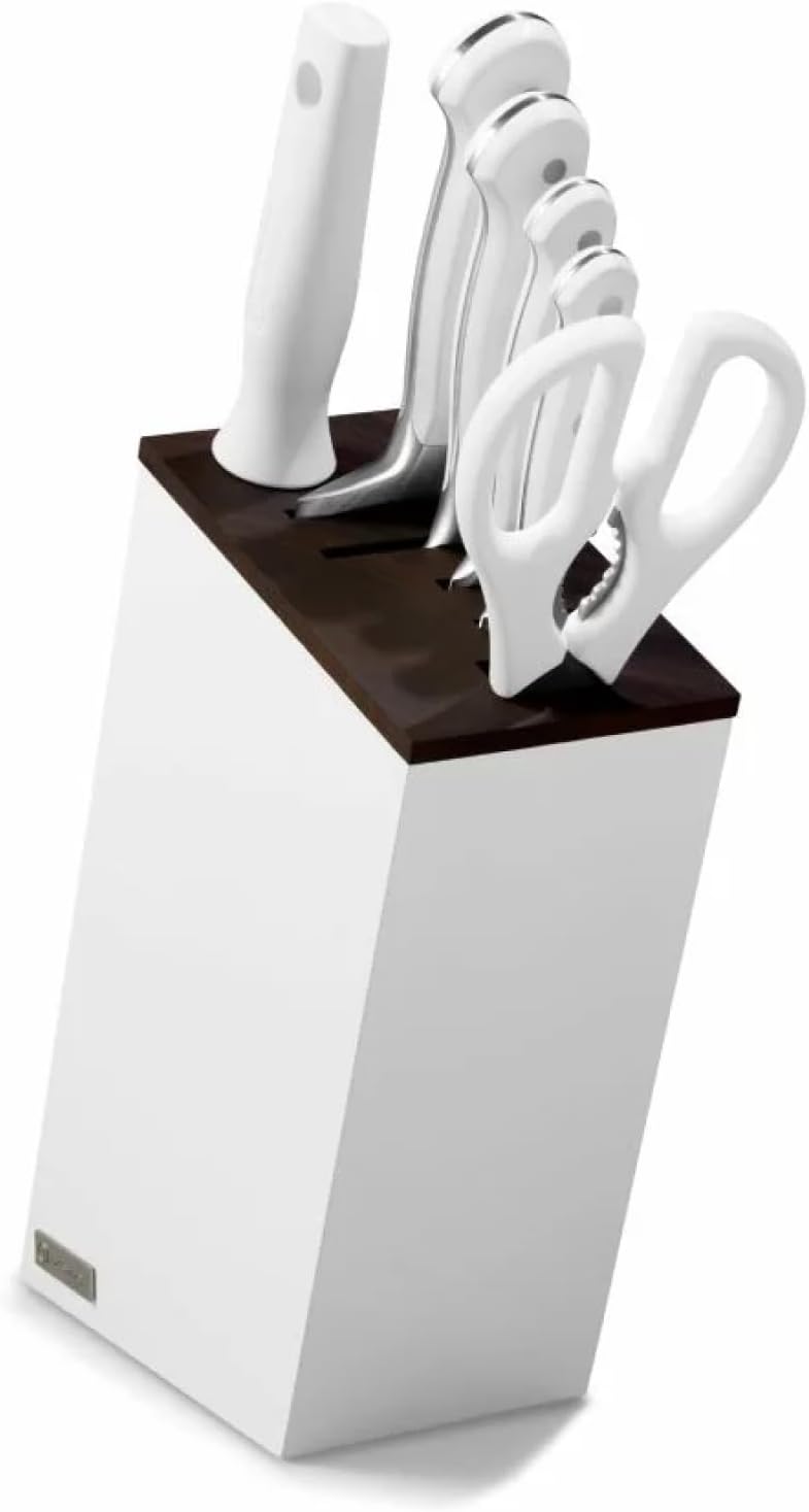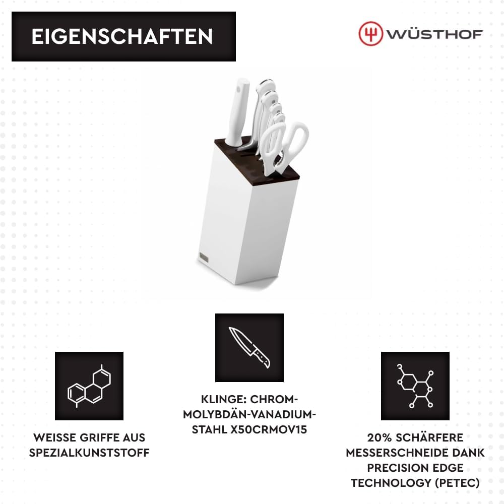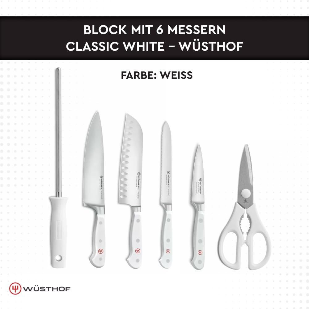 Die Wüsthof Classic Messer mit dem einzigartigen, weißen Griff verbinden moderne Leichtigkeit mit bester Qualität. So sind die hochwertigen Solingen-Messer das elegante Extra in jeder Küche – z.B. dieser schöne Messerblock mit Messern wie dem Santoku Dieses moderne Küchenmesser Set bietet eine erstklassige Messer-Auswahl: je 1 Santokumesser (japanisches Kochmesser) mit 17 cm Klingenlänge und Kullen, Gemüsemesser 9 cm, Aufschnittmesser (Sägemesser) 14 cm, Kochmesser 20 cm, Wetzstab und Küchenschere Durch den schmalen Design-Holzblock sind die zeitlosen Messer immer griffbereit und werden zuverlässig vor Kratzern und Beschädigungen geschützt – so bleiben sie lange scharf. Maße des Küchenmesser Block (unbestückt): 22,5 x 9 x 25,5 cm (H/B/T) Die weißen Messer werden aus einem Stück Edelstahl geschmiedet (rostfreier Spezial-Messerstahl). Sie sind ideal ausbalanciert, liegen gut in der Hand und sind schmutzabweisend und damit pflegeleicht – jedes ein geschmackvolles, richtig gutes Messer Diese hochwertigen, weißen Schmiedemesser sind optimal für alle Köche und sind auch eine schöne Geschenk-Idee. Ein zuverlässiges Profi-Kochmesser Set eines echten Traditionsunternehmens – Made in Germany, geschmiedet in Solingen | قیمت یورویی : 499€