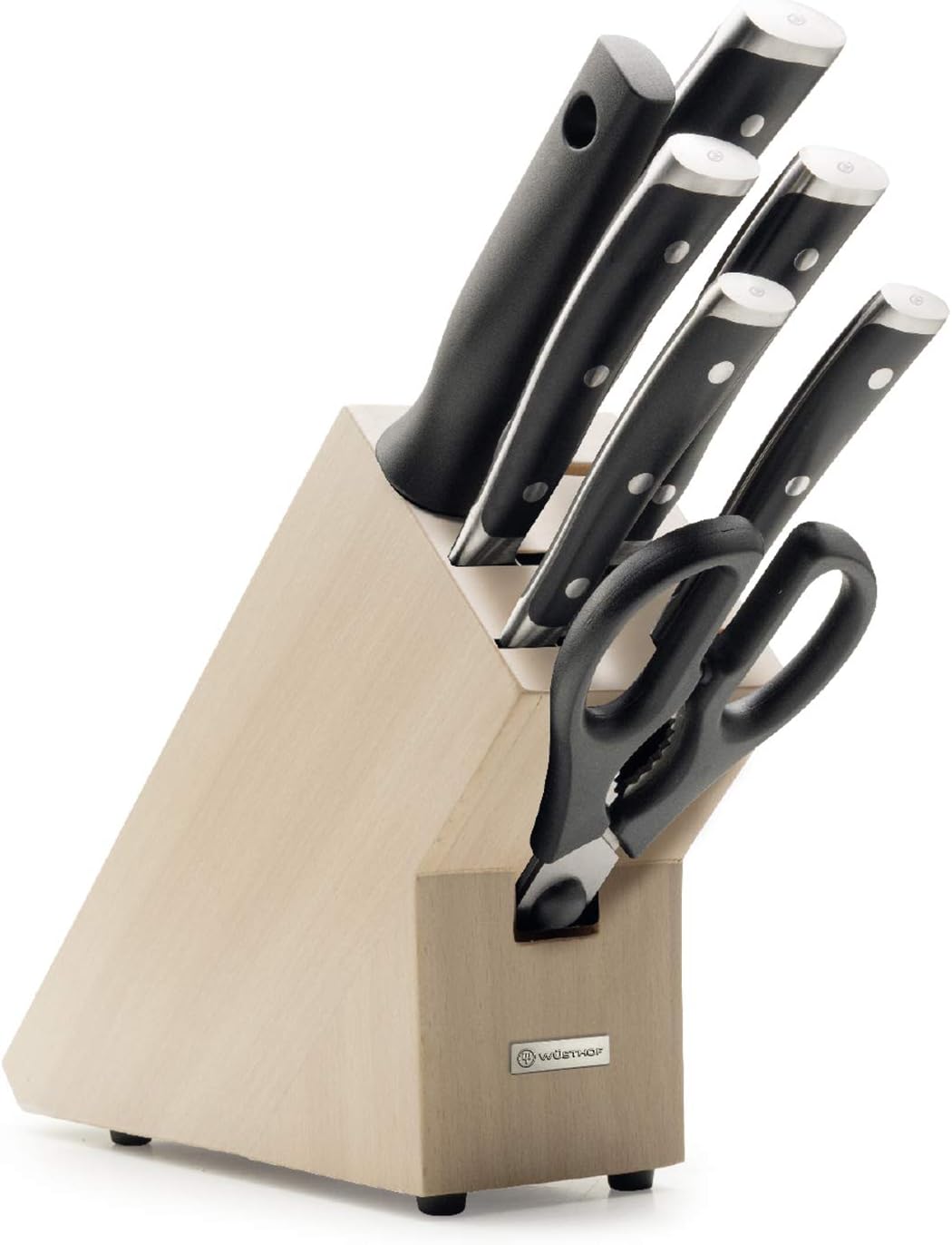 Als elegante Küchen Messer aus Solingen beeindrucken die Wüsthof Messer der Classic Ikon Serie selbst anspruchsvolle Perfektionisten. So ist auch dieses Profimesser Messerset ein kompromisslos guter Küchenmesser Block mit zeitlosem Design Schönes Kochmesserset mit Chefmesser Grundausstattung: Tourniermesser (Schälmesser) 7 cm Klinge, Gemüsemesser 9 cm, Schinkenmesser (Fleischmesser)16 cm, Brotmesser mit Wellenschliff 23 cm, Kochmesser (Universalmesser) 20 cm, Wetzstab 26 cm, Schere Der schöne Messer Block (Küchenmesser Block aus hellem Buchenholz) ist die ideale Messeraufbewahrung und präsentiert den Messersatz immer griffbereit und schützt die Klingen zuverlässig vor Beschädigungen. Maße: B 32,7 cm, H 28,9 cm, T 8,6 cm Durch die ergonomische Wölbung im vorderen Bereich liegen die ultra-scharfen Profi Messer besonders angenehm und sicher in der Hand. Die pflegeleichten Griffe des Profimesserset sorgen für einwandfreie Hygiene und sehen in jeder Küche richtig gut aus Als ideal ausbalanciertes Kochmesser beeindruckt Wüsthof Classic Ikon jeden Profi-Koch und ist dank der scharfen Messerklinge das offizielle Kochwerkzeug der deutschen Nationalmannschaft der Köche. Premiummesser – Made in Germany, geschmiedet in Solingen | قیمت یورویی : 430.77€