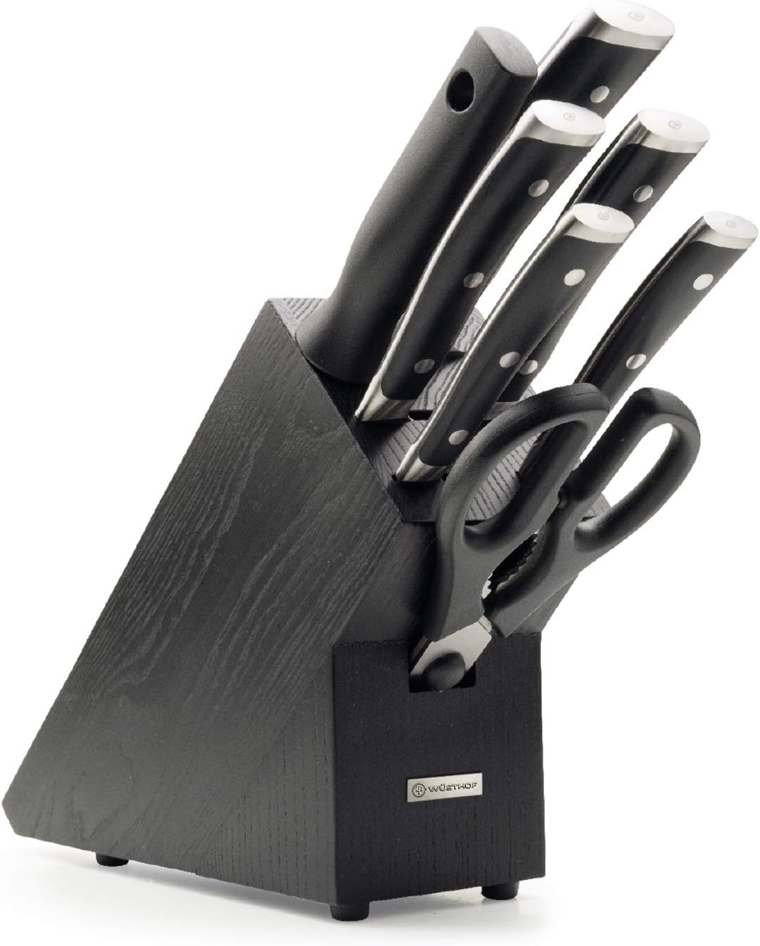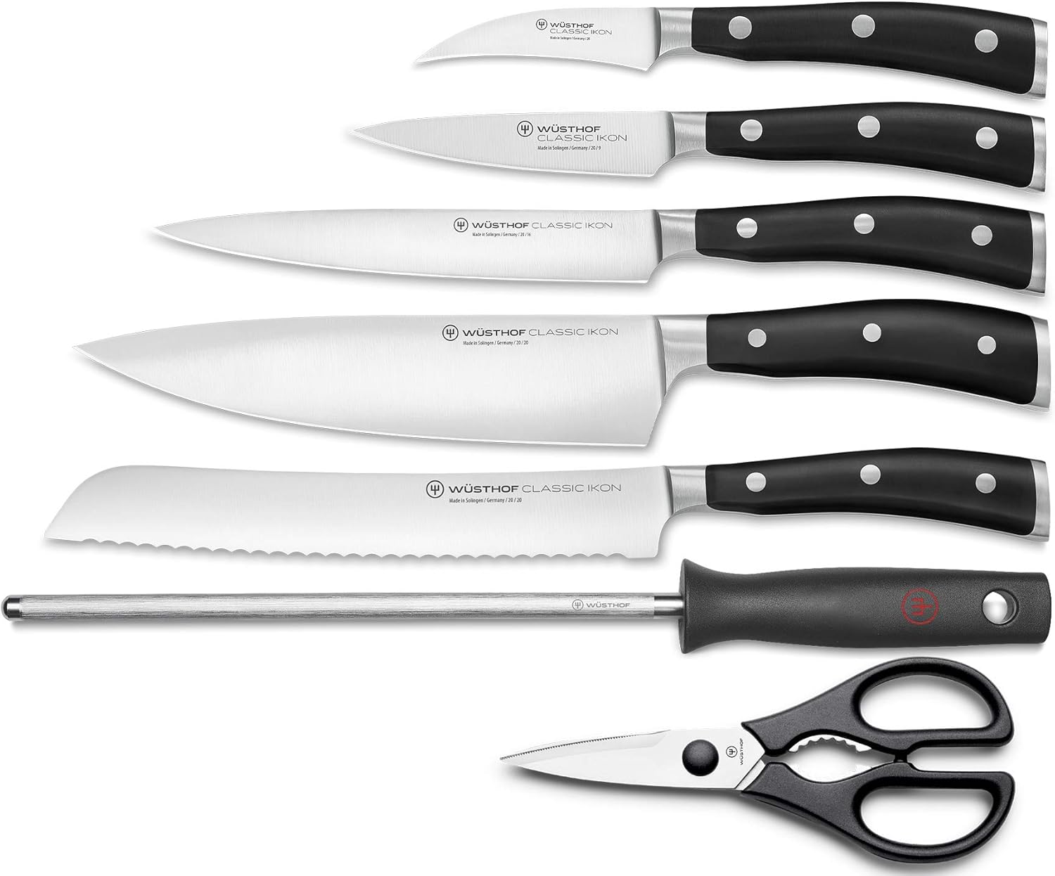 Als elegante Küchen Messer aus Solingen beeindrucken die Wüsthof Messer der Classic Ikon Serie selbst anspruchsvolle Perfektionisten. So ist auch dieses Profimesser Messerset ein kompromisslos guter Küchenmesser Block mit zeitlosem Design Schönes Kochmesserset mit Chefmesser Grundausstattung: Tourniermesser (Schälmesser) 7 cm Klinge, Gemüsemesser 9 cm, Schinkenmesser 16 cm, Brotmesser mit Wellenschliff 23 cm, Kochmesser (Universalmesser) 20 cm, Wetzstab 26 cm, Schere (Haushaltsschere) Der schöne Messer Block (Küchenmesser Block aus schwarzem Eschenholz) ist die ideale Messeraufbewahrung und präsentiert den Messersatz immer griffbereit und schützt die Klingen zuverlässig vor Beschädigungen. Maße: B 33 cm, H 30 cm, T 8,5 cm Durch die ergonomische Wölbung im vorderen Bereich liegen die ultra-scharfen Profi Messer besonders angenehm und sicher in der Hand. Die pflegeleichten Griffe des Profimesserset sorgen für einwandfreie Hygiene und sehen in jeder Küche richtig gut aus Als ideal ausbalanciertes Kochmesser beeindruckt Wüsthof Classic Ikon jeden Profi-Koch und ist dank der scharfen Messerklinge das offizielle Kochwerkzeug der deutschen Nationalmannschaft der Köche. Premiummesser – Made in Germany, geschmiedet in Solingen | قیمت یورویی : 587.29€