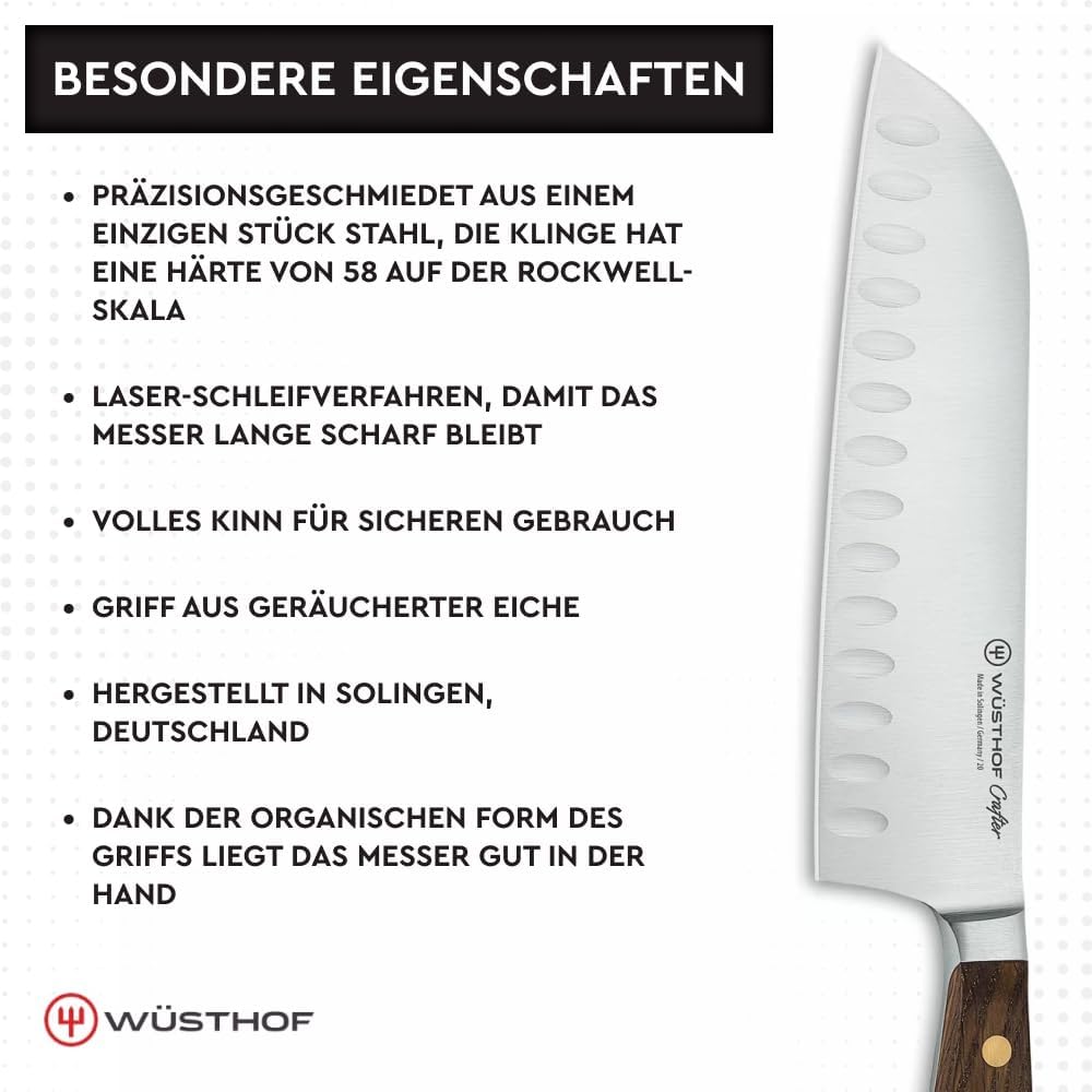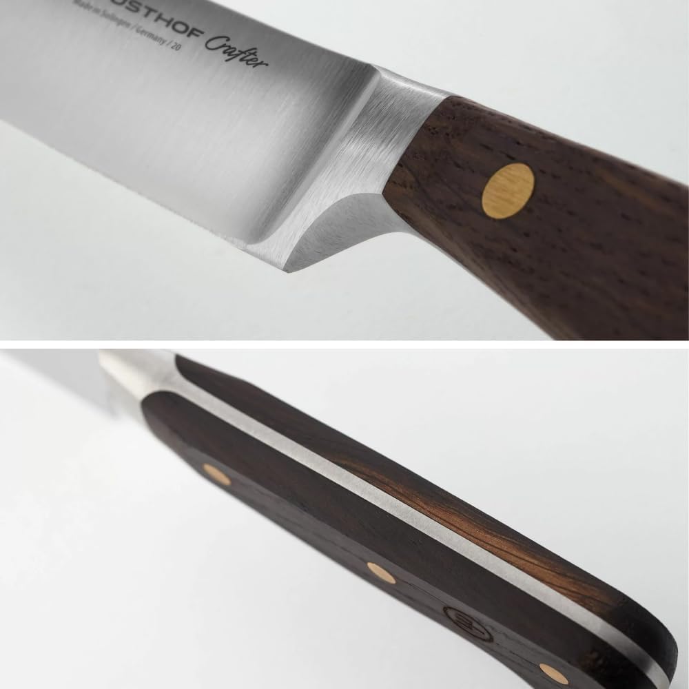 Das Messerset beinhaltet 6 extrem scharfe Spezialmesser: Gemüsemesser (9 cm), Aufschnittmesser mit Wellenschliff (14 cm), Schinkenmesser (16 cm), Santoku mit Kullen (17 cm), Kochmesser (20 cm), Brotmesser mit Doppelwelle (23 cm) sowie 1 Holzmesserblock Crafter ist die robuste Messerserie für qualitätsbewusste Food-Fans, die einen Sinn für traditionelle Werte und natürliche Materialien haben und zuverlässiges Werkzeug für die Vor- und Zubereitung frischer Lebensmittel schätzen Das Allzweckmesser liegt gut in der Hand, es ist optimal ausbalanciert und Sie können damit kräftig und lange schneiden. Der Holzgriff aus geräucherter Eiche mit Nieten aus Messing verleiht ihm einen ausgesuchten, unverwechselbaren Charakter Der formschöne Holzblock aus dunkler und heller Eiche sowie Ahornholz (Breite 14 cm, Tiefe 11 cm, Höhe 24 cm) schützt die Klingen zuverlässig vor Kratzern und Beschädigungen. So bleiben die kohlenstoffreichen Klingen lange präzise und scharf Der Solitär mit Crafter Messern vereint mit der sorgfältigen Rohstoffauswahl aus Holz, Messing und Edelstahl nachhaltige Qualität mit individuellem Design. Bitte reinigen Sie die Messer nur von Hand. Made in Germany – geschmiedet in Solingen | قیمت یورویی : 999€