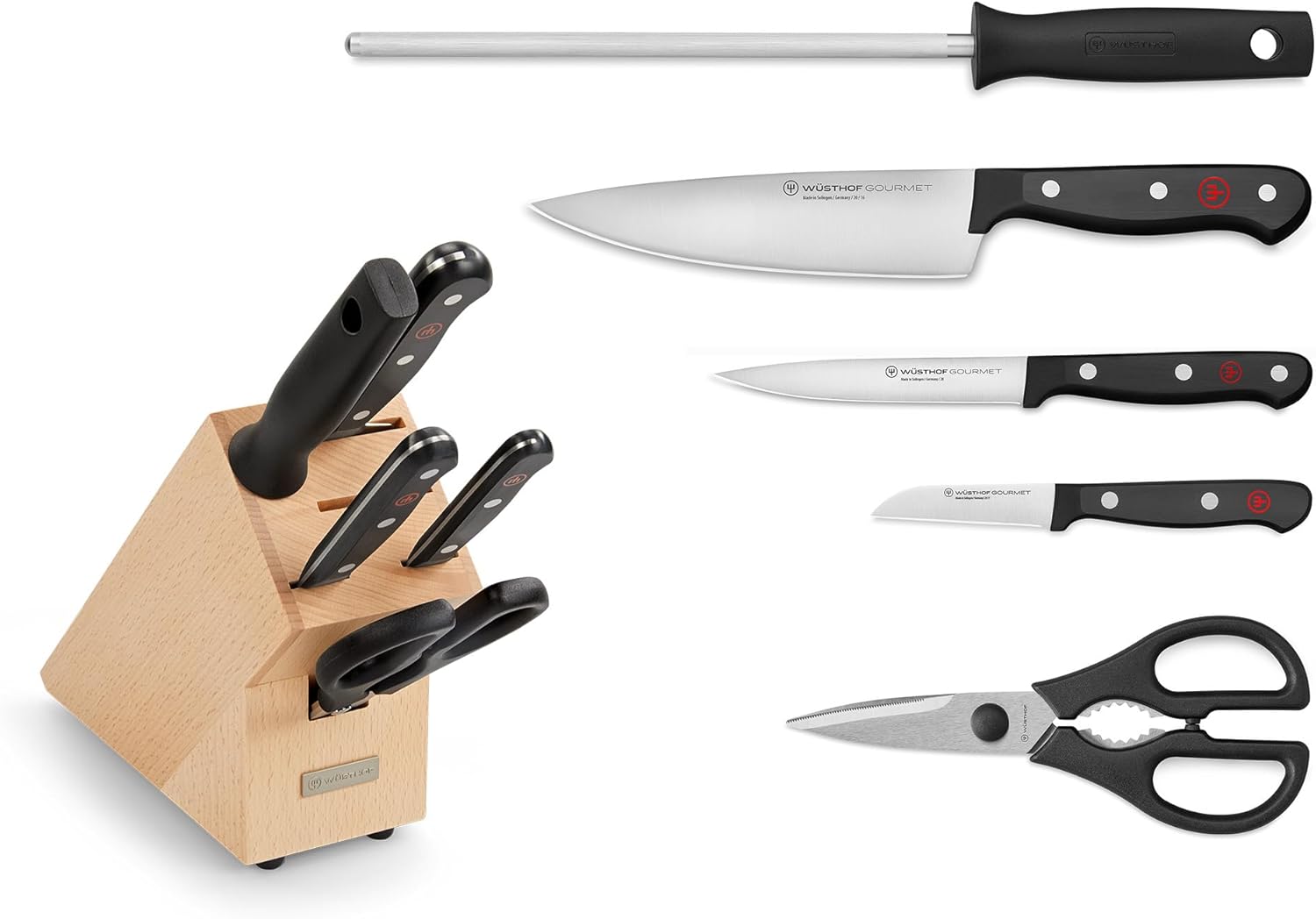Mit Gourmet hat WÜSTHOF Messer-Basics im Angebot, die als Küchenmesser-Set nicht nur durch richtig gute Qualität und einen attraktiven Preis begeistern, sondern als zuverlässige Solinger Messer – so wie dieses vielseitige Messer-Set für Hobby- und Profi-Köche Schöner Küchenmesser-Block mit Kochmesser-Set: 2 Gemüsemesser (7 und 12 cm Klinge), Kochmesser (Universalmesser mit 16 cm Klinge), Wetzstab 23 cm und Küchenschere (Haushaltsschere) Das praktische Küchenmesser Block-Set (Messerblock aus Buchenholz) ist die ideale Messeraufbewahrung und präsentiert den Messersatz immer griffbereit und schützt die Klingen zuverlässig vor Beschädigungen. Maße: B 8,2 cm x H 27,0 cm x T: 32,0 cm Agil und spülmaschinengeeignet – die ergonomischen Griffe sind absolut pflegeleicht. Die ausgelaserten Messerklingen aus rostfreiem Edelstahl sind mit Stabilität und Schärfe geschmiedeter Profi-Kochmesser vergleichbar und unterstützen präzises Schneiden WÜSTHOF Gourmet überzeugt durch ein sehr gutes Preis-Leistungsverhältnis und ist als Starterset für den Privat-Haushalt ebenso interessant wie als Grundausstattung für die Gastronomie (Profi-Küche). Küchenmesser – Made in Germany, hergestellt in Solingen | قیمت یورویی : 194.94€