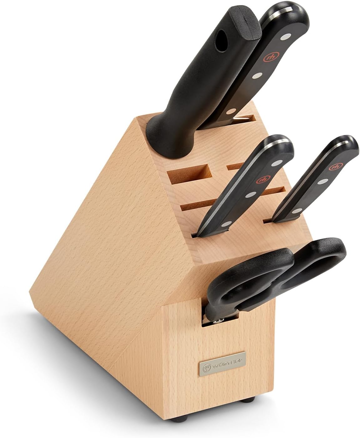 Mit Gourmet hat WÜSTHOF Messer-Basics im Angebot, die als Küchenmesser-Set nicht nur durch richtig gute Qualität und einen attraktiven Preis begeistern, sondern als zuverlässige Solinger Messer – so wie dieses vielseitige Messer-Set für Hobby- und Profi-Köche Schöner Küchenmesser-Block mit Kochmesser-Set: 2 Gemüsemesser (7 und 12 cm Klinge) Kochmesser (Universalmesser mit 16 cm Klinge), Wetzstab 23 cm und Küchenschere (Haushaltsschere) Das praktische Küchenmesser Block-Set (Messerblock aus Buchenholz) ist die ideale Messeraufbewahrung und präsentiert den Messersatz immer griffbereit und schützt die Klingen zuverlässig vor Beschädigungen. Maße: B 8,5 cm x H 28,5 cm x T: 32,0 cm Agil und spülmaschinengeeignet – die ergonomischen Griffe sind absolut pflegeleicht. Die ausgelaserten Messerklingen aus rostfreiem Edelstahl sind mit Stabilität und Schärfe geschmiedeter Profi-Kochmesser vergleichbar und unterstützen präzises Schneiden WÜSTHOF Gourmet überzeugt durch ein sehr gutes Preis-Leistungsverhältnis und ist als Starterset für den Privat-Haushalt ebenso interessant wie als Grundausstattung für die Gastronomie (Profi-Küche). Küchenmesser – Made in Germany, hergestellt in Solingen | قیمت یورویی : 123.89€